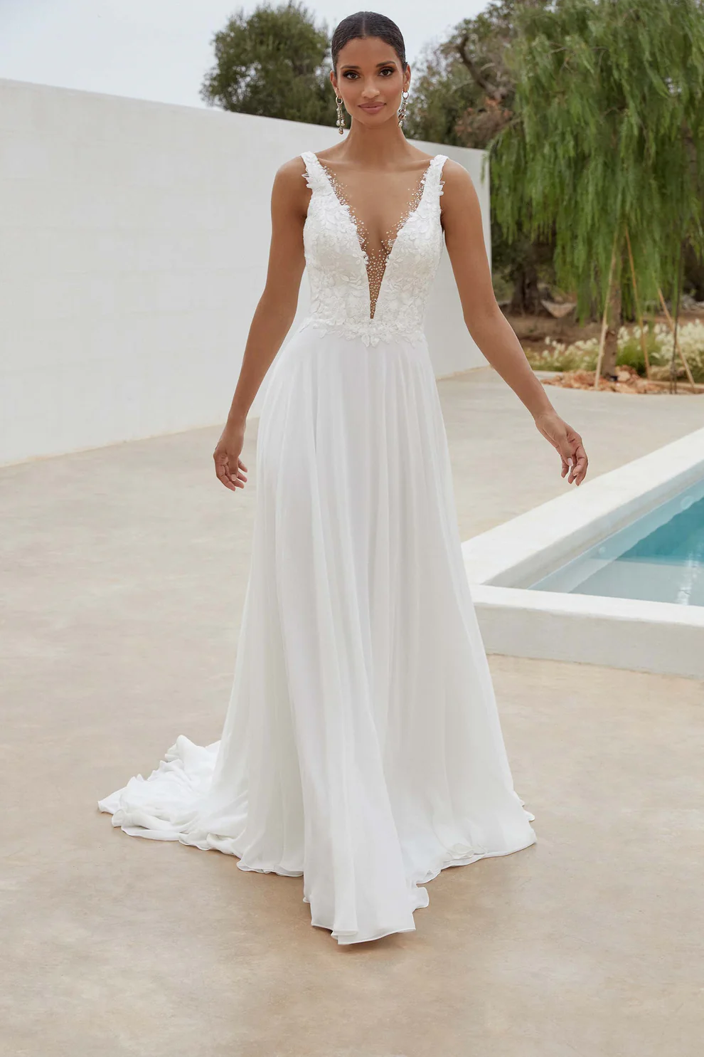 Das Brautkleid Annamarie von Adore ist ein klassisches A-Linien Brautkleid mit einem Oberteil aus zarten Blumenapplikationen.