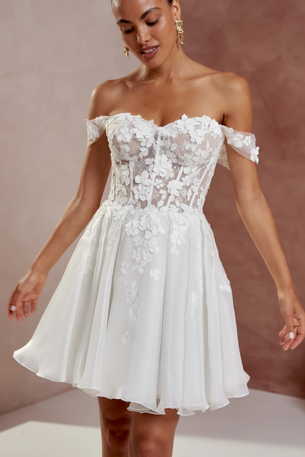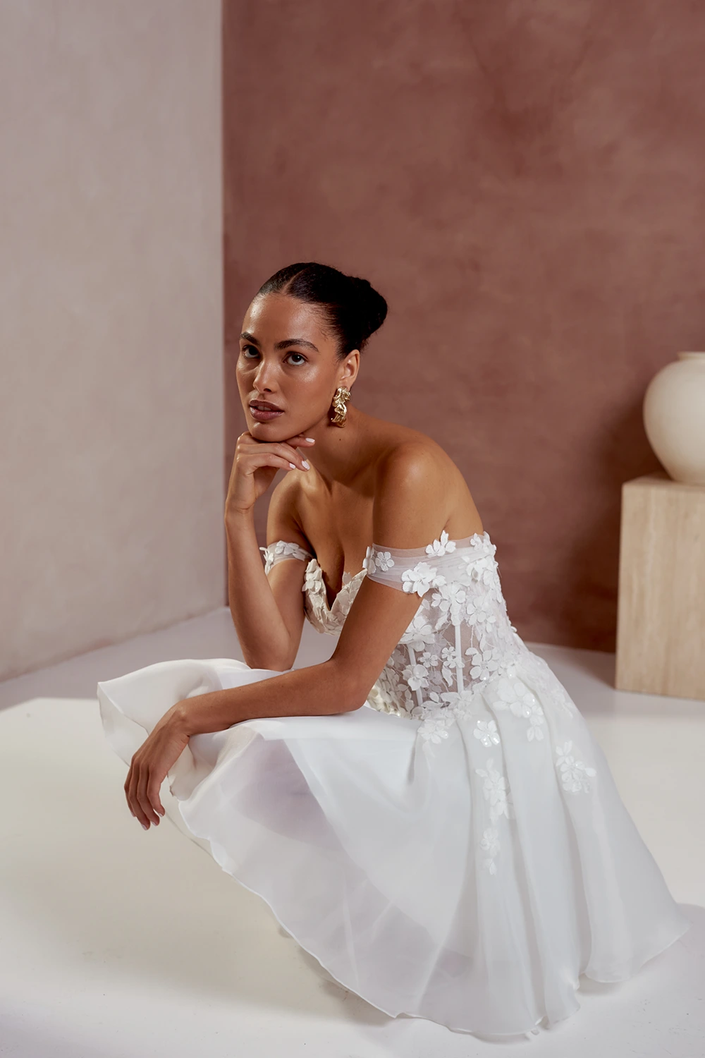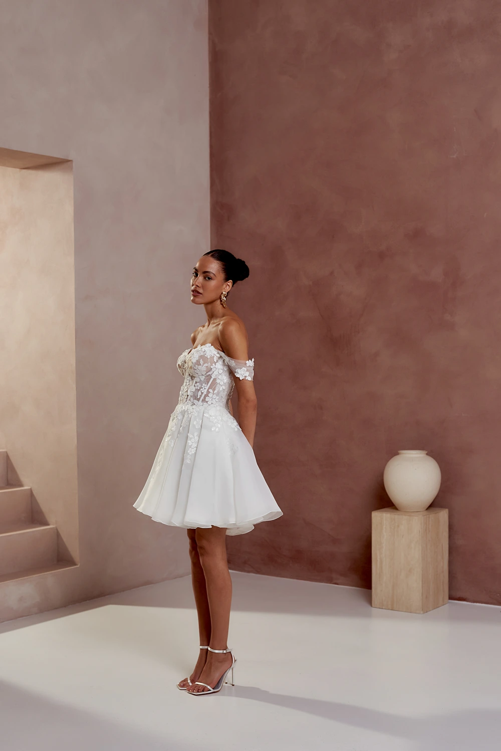 Das Modell Aria-AJA von Adore ist ein kurzes Brautkleid mit Spitze und Organza.