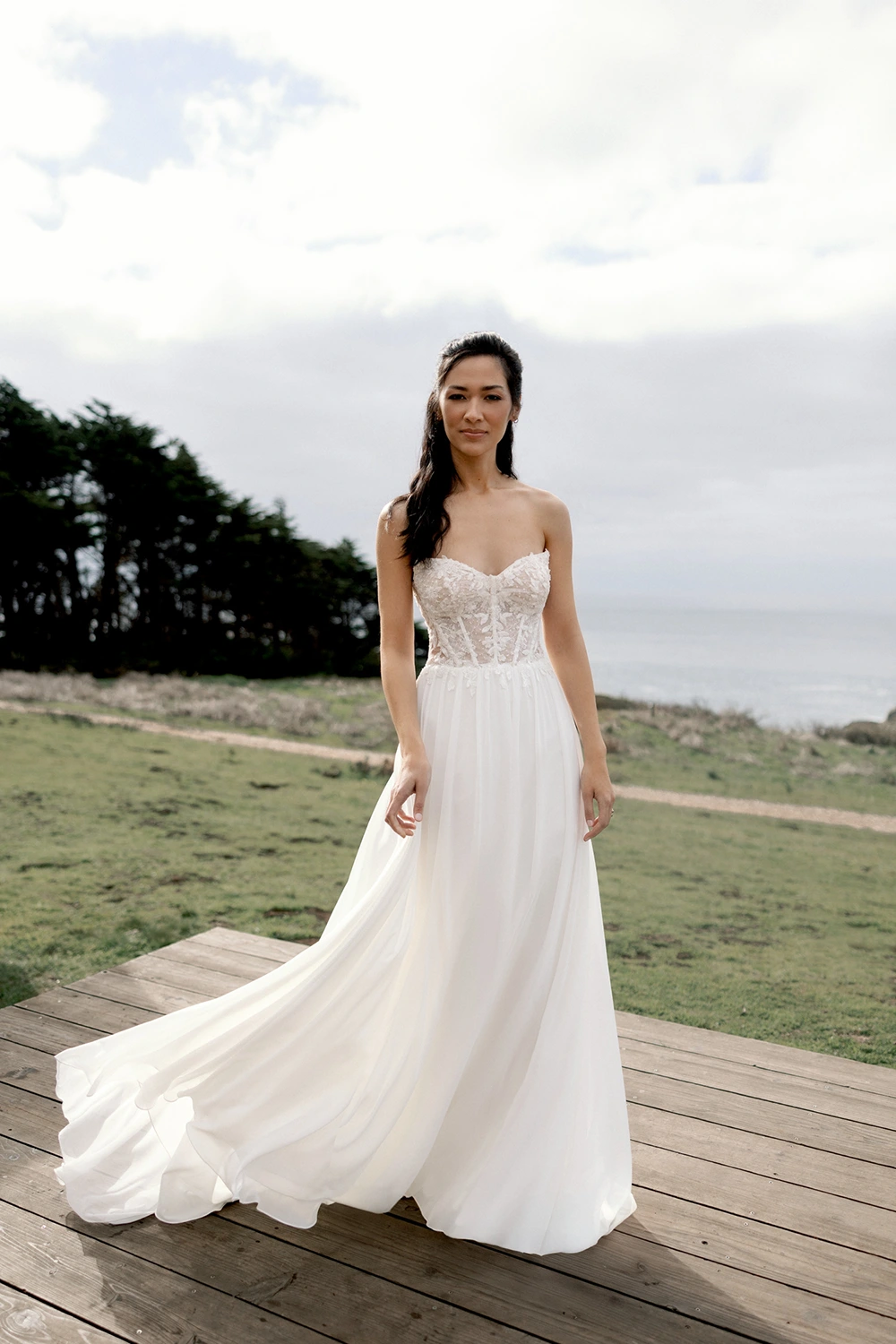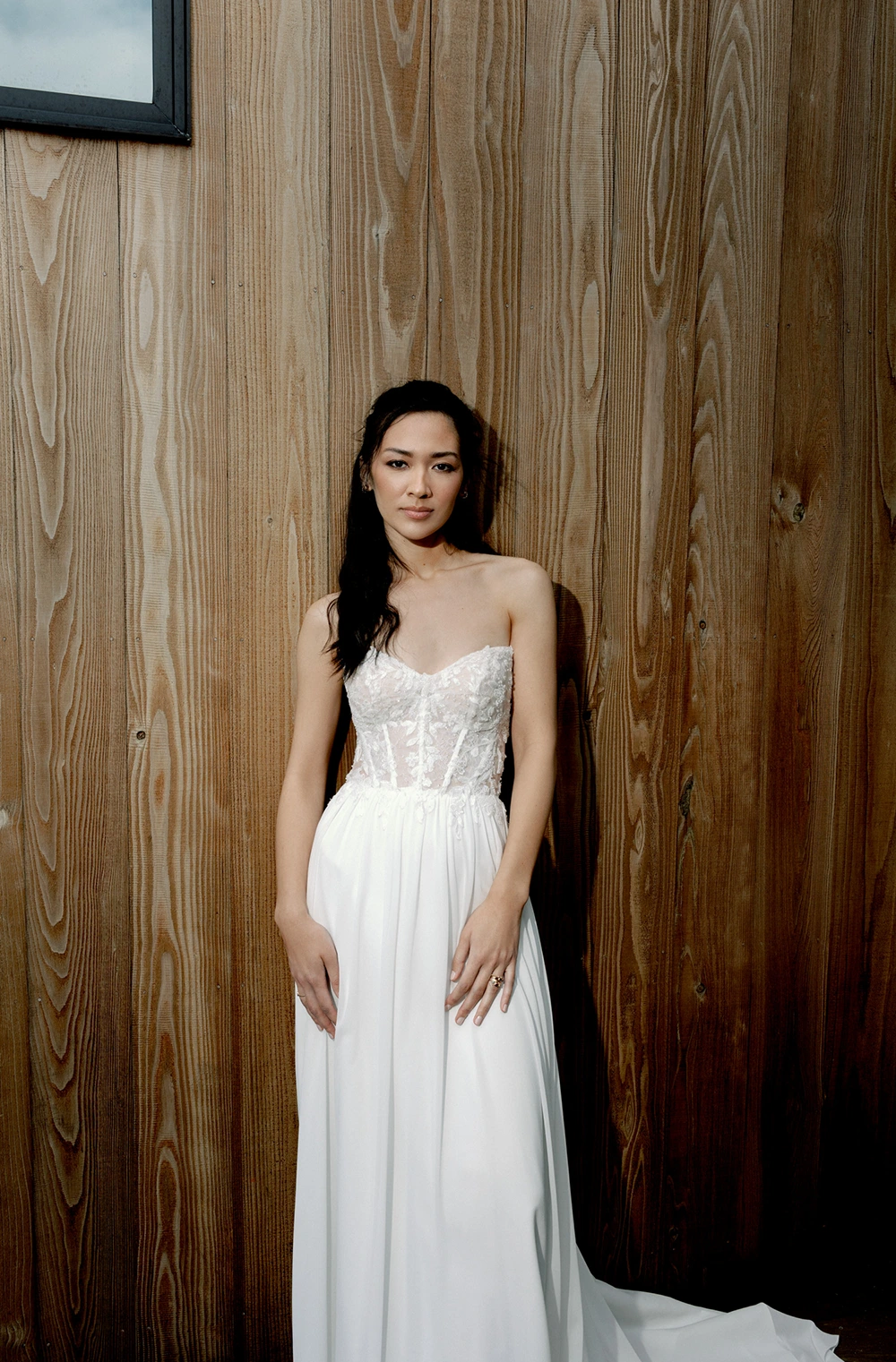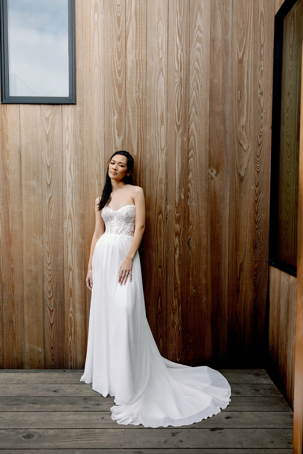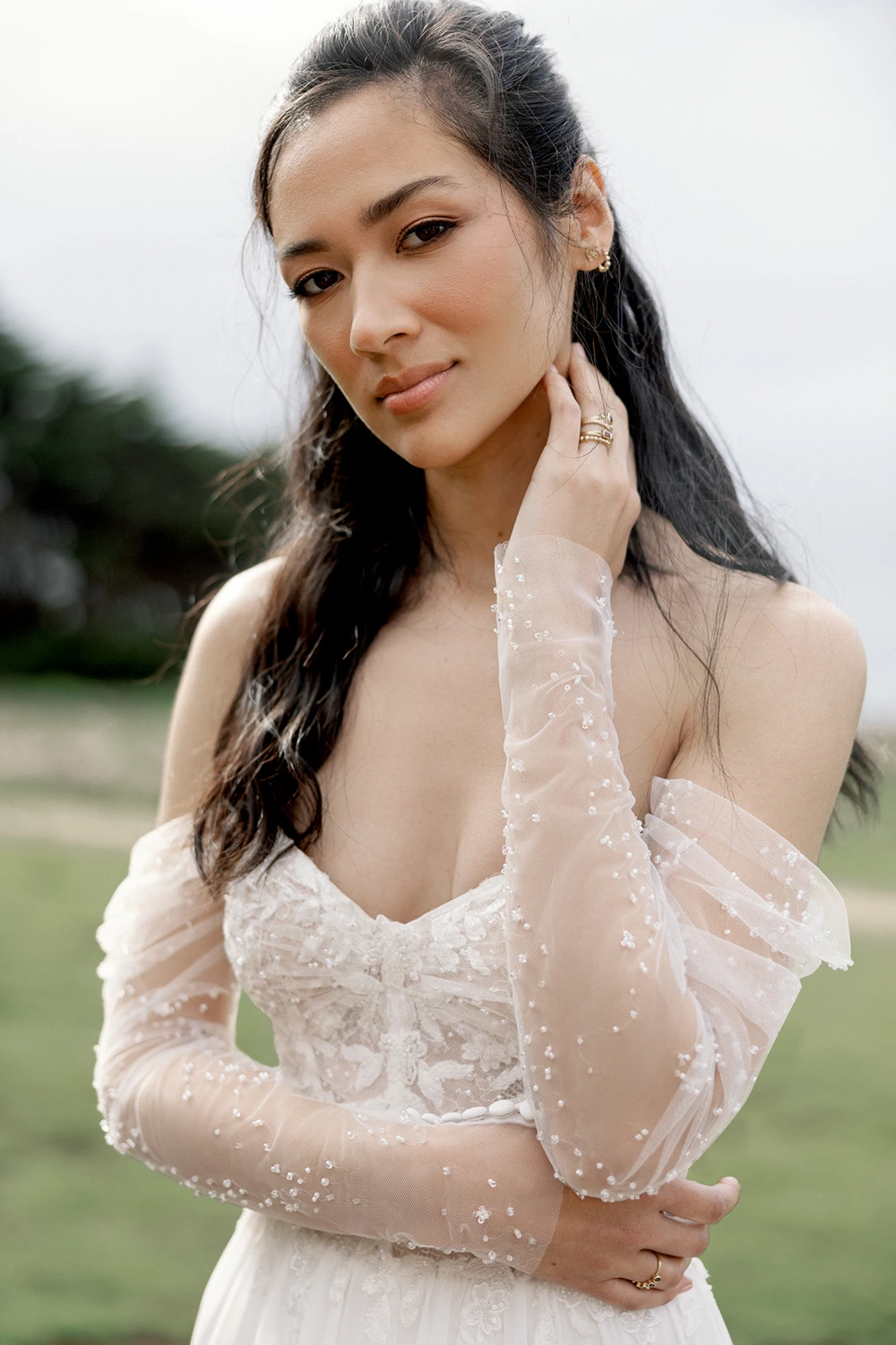 Das Modell Aurelia von Adore ist ein sanft fließendes A-Linien Brautkleid mit langen abnahmbaren Off-Shoulder Ärmeln.