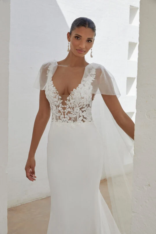 Das Brautkleid Kari von Adore ist ein schlichtes Meerjungfrauen-Brautkleid mit exklusiven Details und einem tiefen V-Ausschnitt. Mit besonderen Spitzenverzierungen und Pailletten ist es ein absolutes Traumbrautkleid.