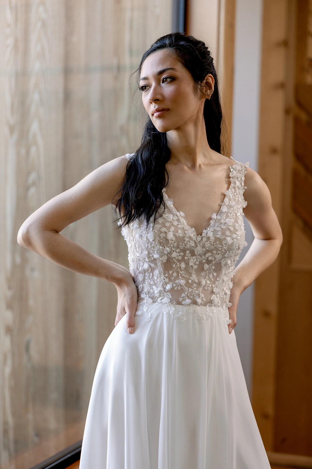 Das Modell Meadow von Adore ist ein romantisches A-Linien Brautkleid mit Spitzenoberteil und schlichtem Rock.