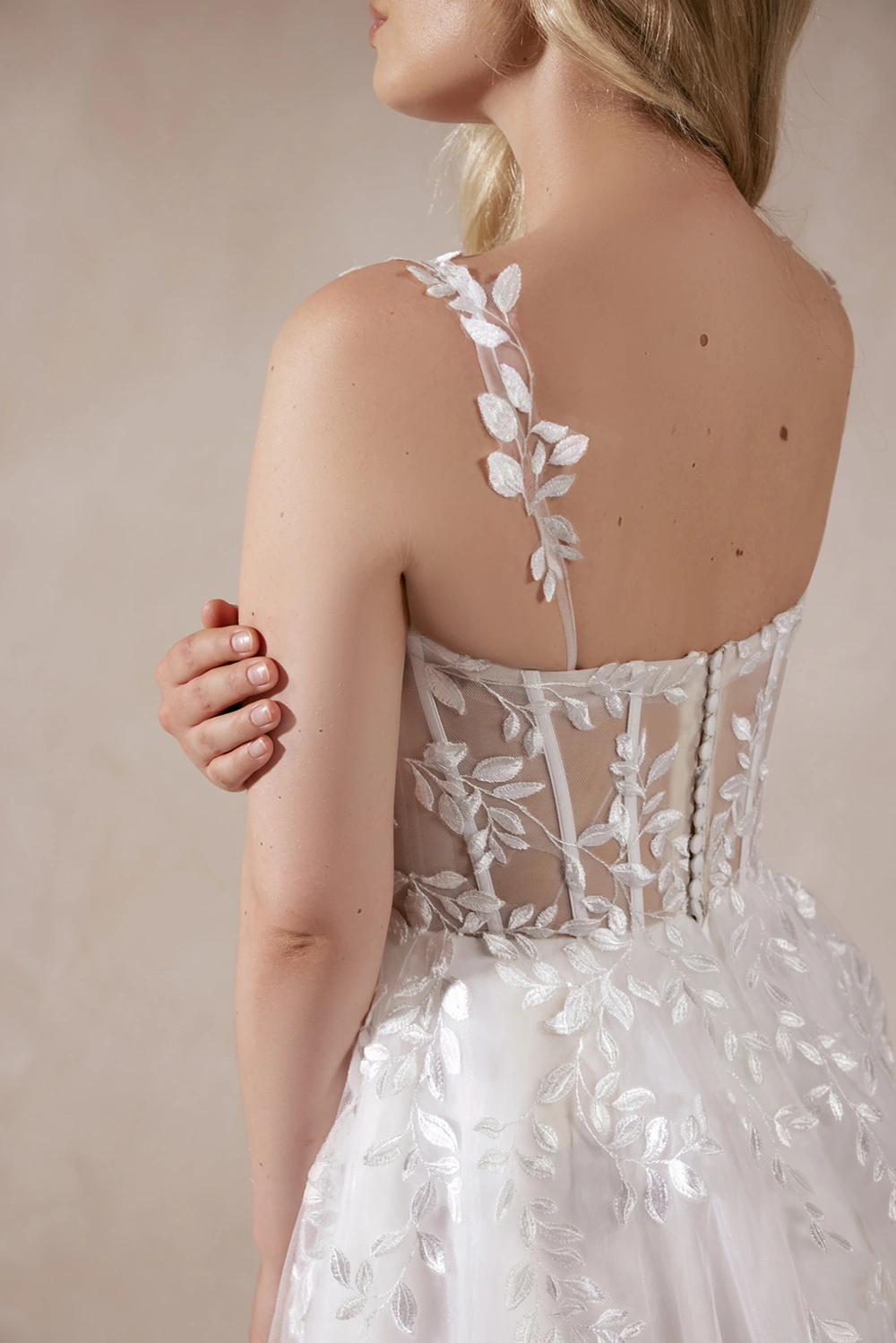 Das Modell Seraphina von Adore ist ein schönes A-Linien Brautkleid mit semitransparentem Oberteil.