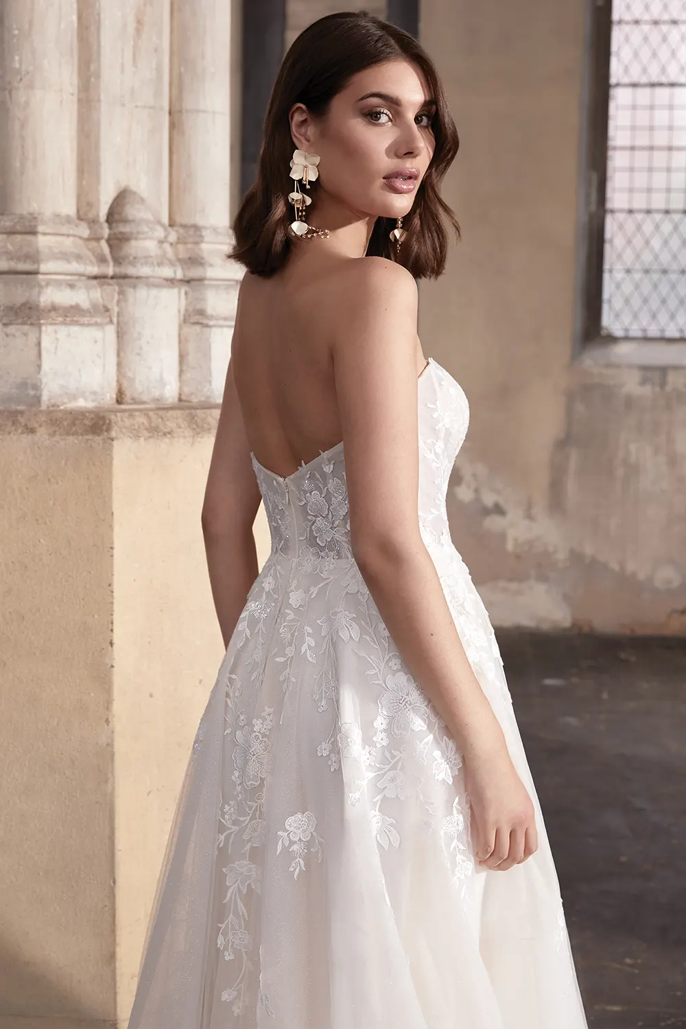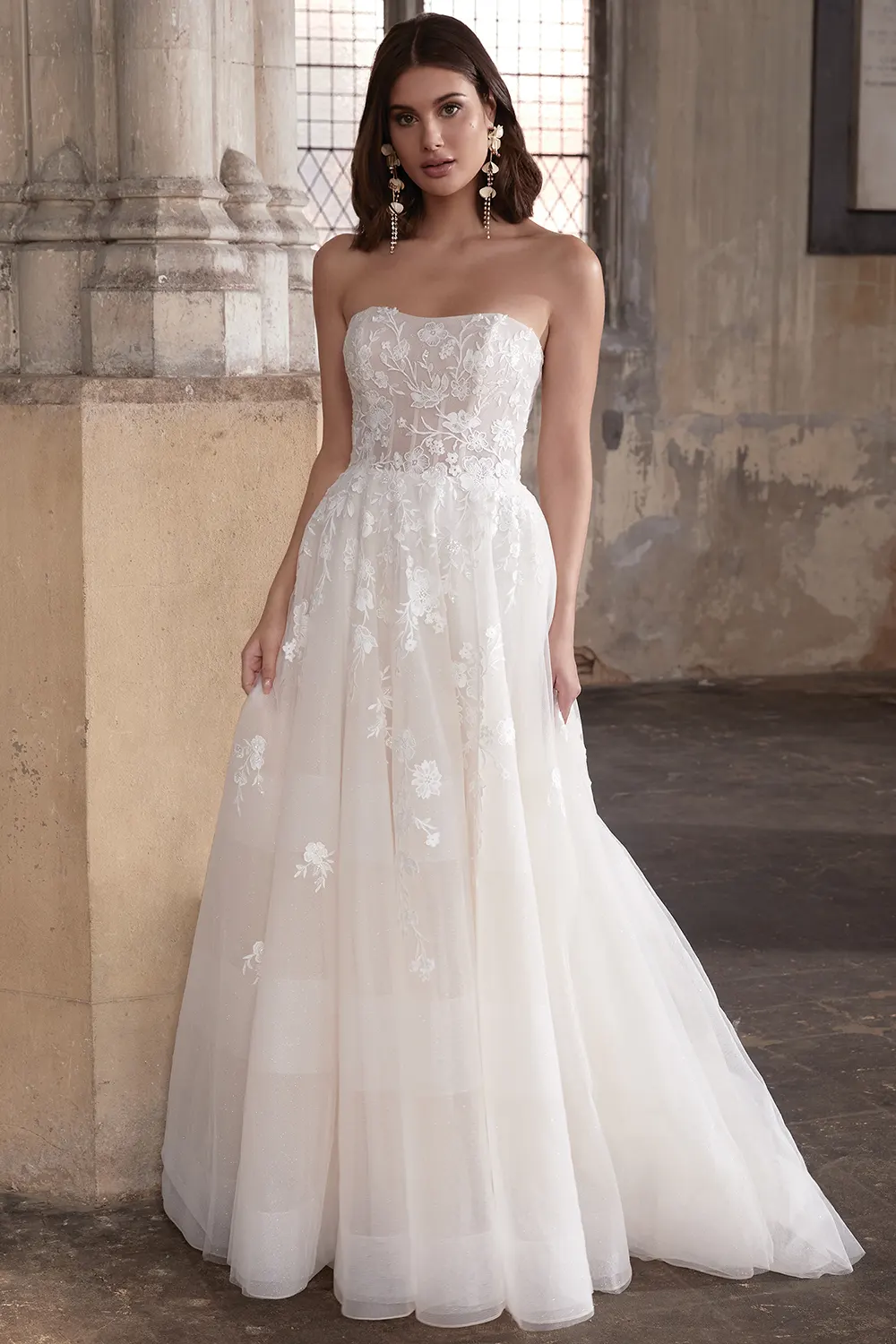 Das Brautkleid Sabine von Adore ist ein romantisches A-Linien-Brautkleid aus Tüll. Es besticht mit seinem durchsichtigen Mieder.