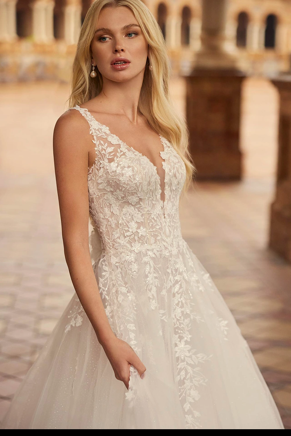 Das Modell Kayden von Aire Barcelona ist ein romantisches Prinzessinnen Brautkleid mit optionalen langen Spitzenärmeln.
