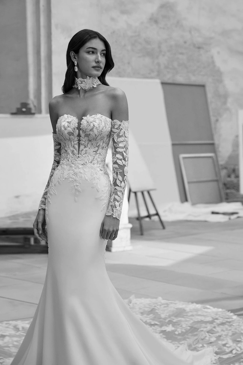 Das Modell Mariela von Aire Barcelona ist ein schlicht elegantes Meerjungfrauen Brautkleid mit Spitzenoberteil und schlichtem Rock.