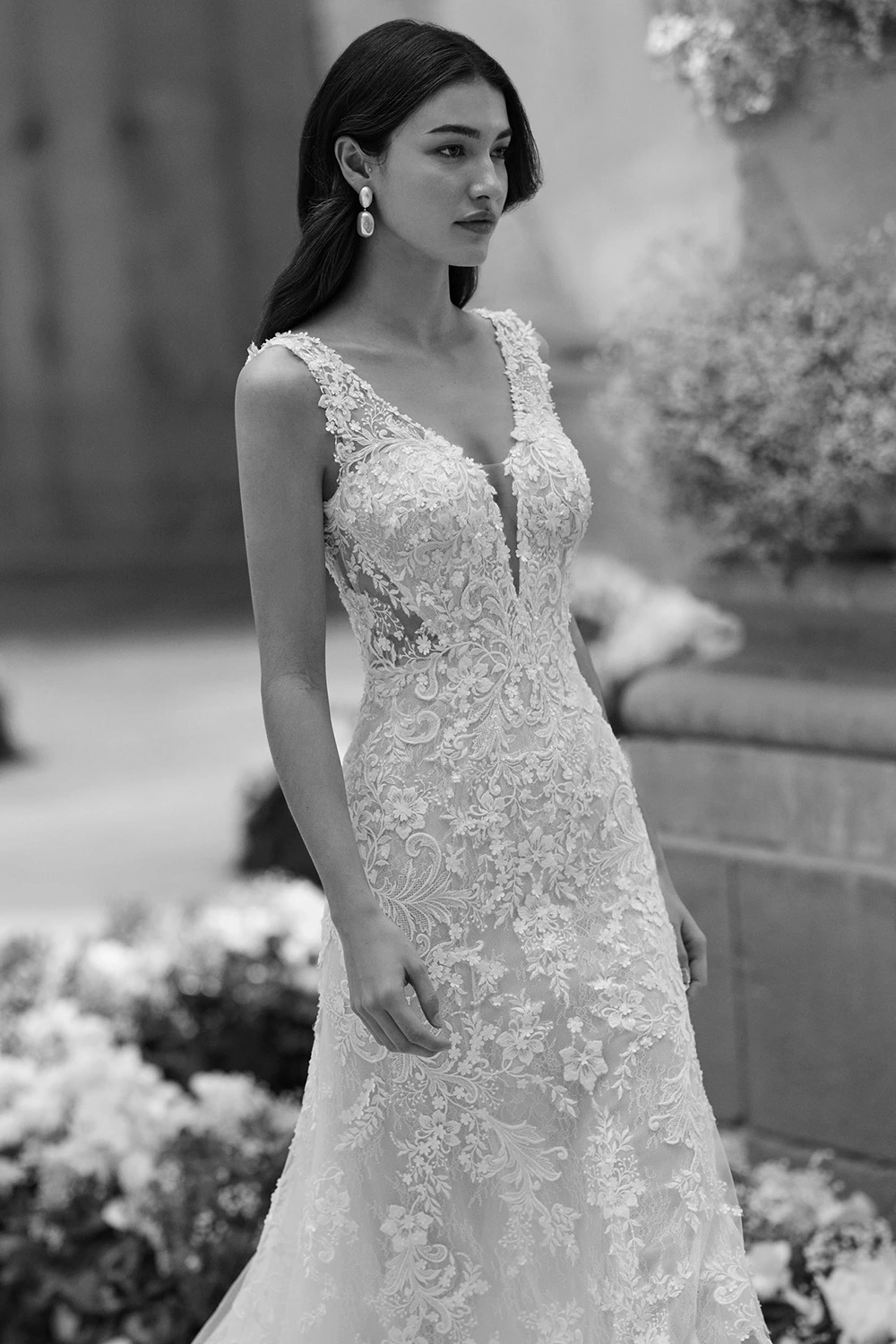 Das Modell Matilde von Aire Barcelona ist ein figurbetontes Brautkleid im Meerjungfrau-Schnitt, das mit aufwendiger Spitze und zartem Perlenbesatz verführt.