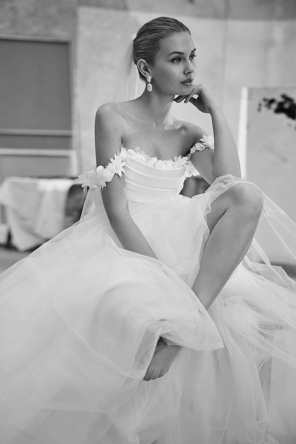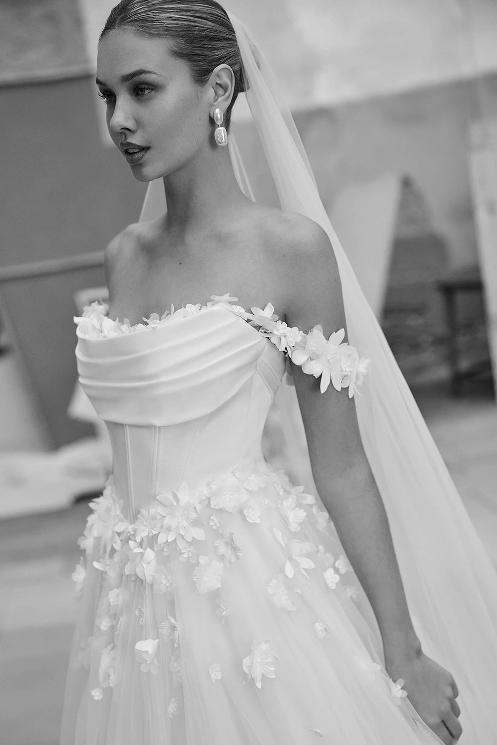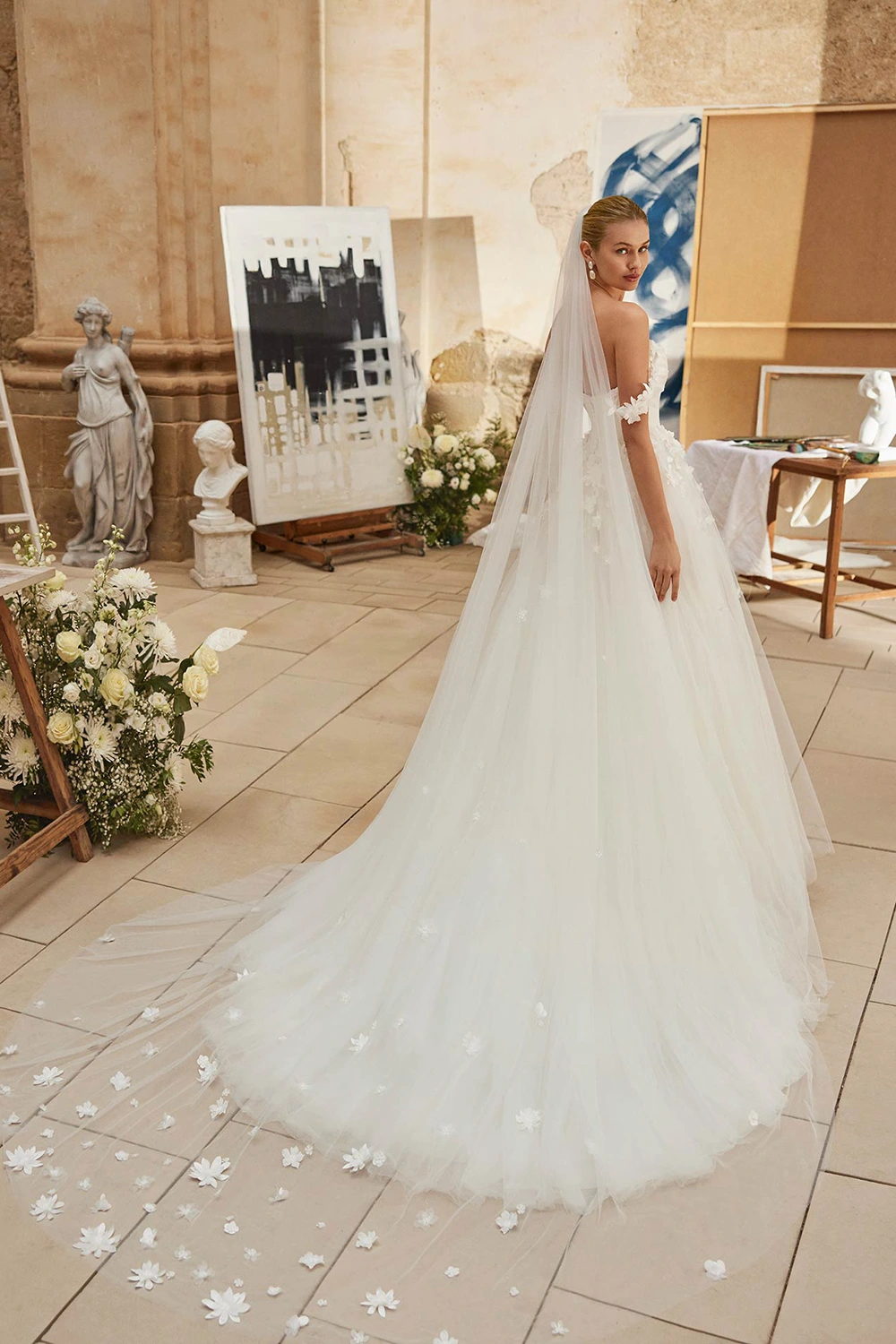 Das Modell Melisa von Aire Barcelona ist ein cleanes, aber verspieltes Brautkleid, welches mit 3D Blüten besticht.