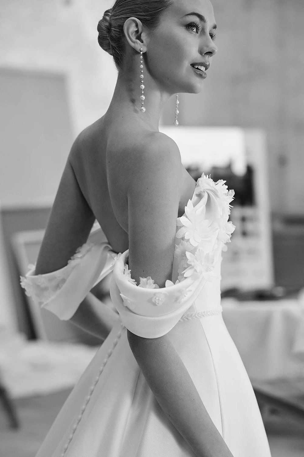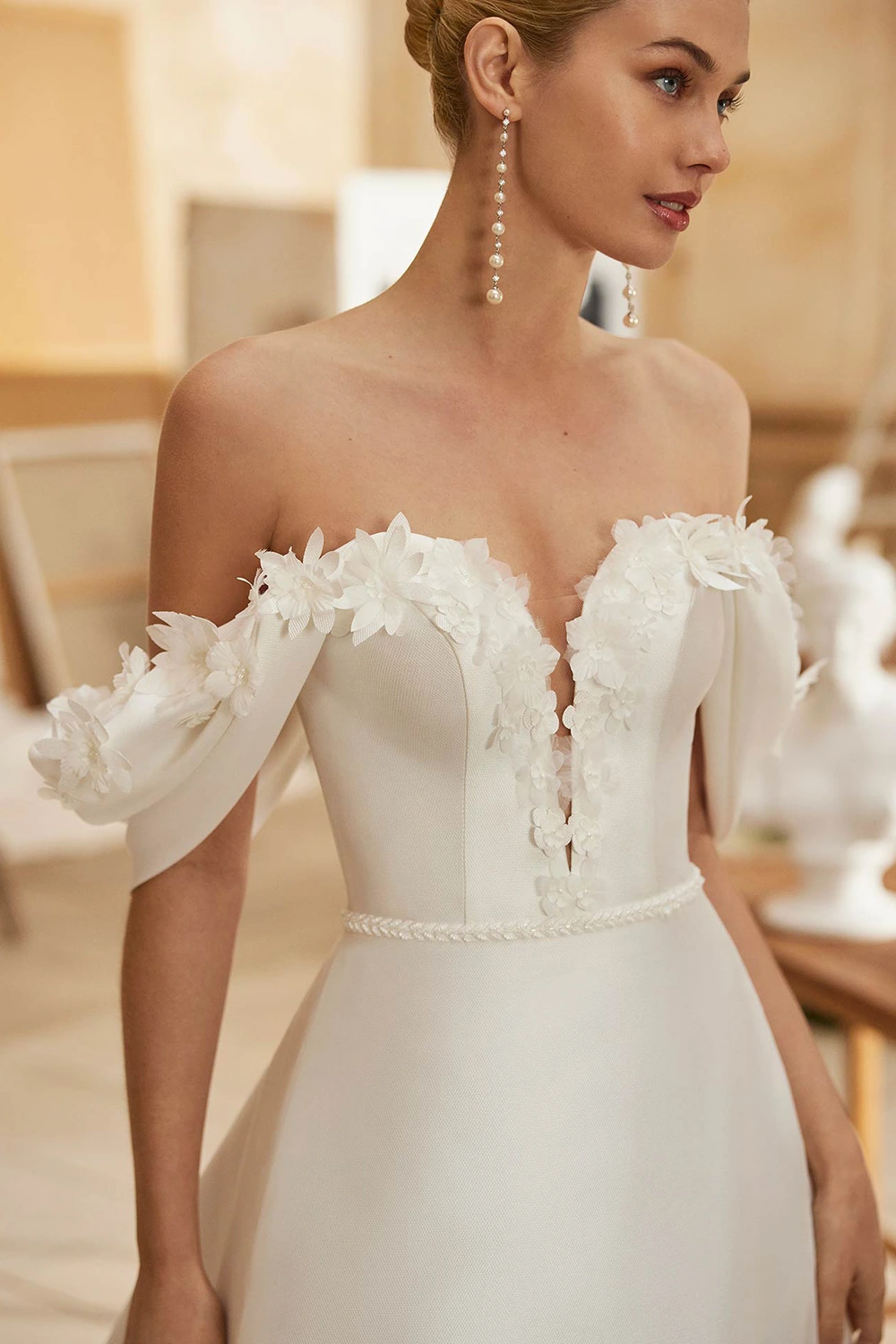 Das Modell Morwen von Aire Barcelona ist ein elegantes A-Linien Brautkleid mit einem Ausschnitt besetzt mit 3D Blüten und einer betonten Taille .