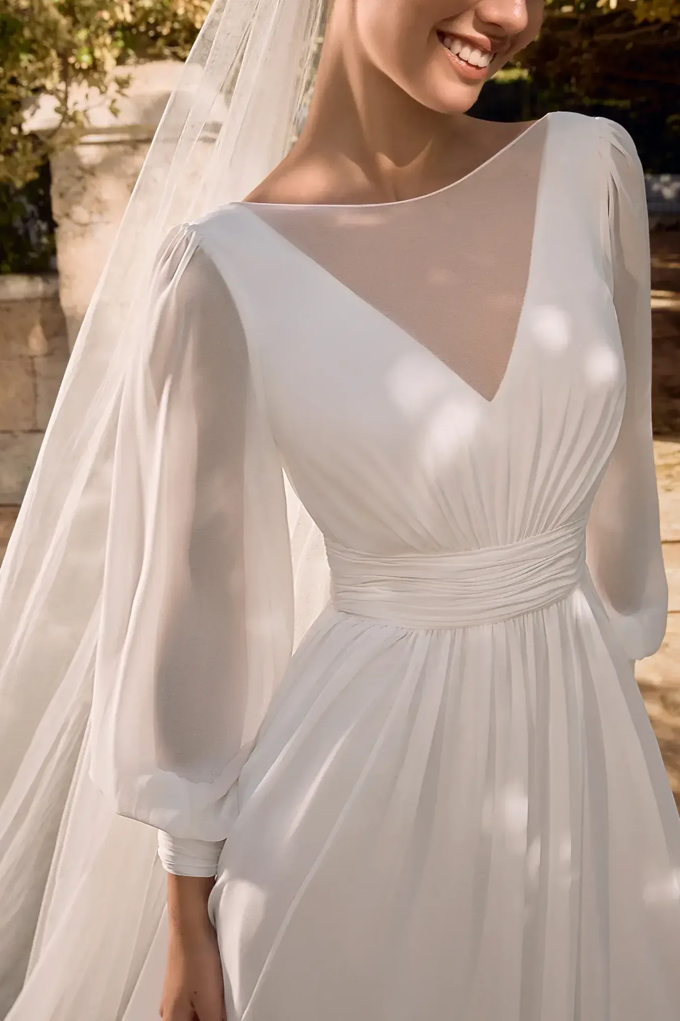 Das Modell Amber von Alberto Palatchi ist ein schlichtes A-Linien Brautkleid aus seidigem Chiffon.