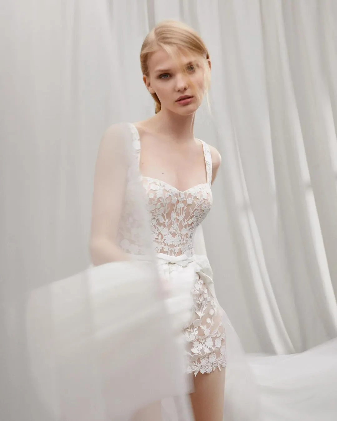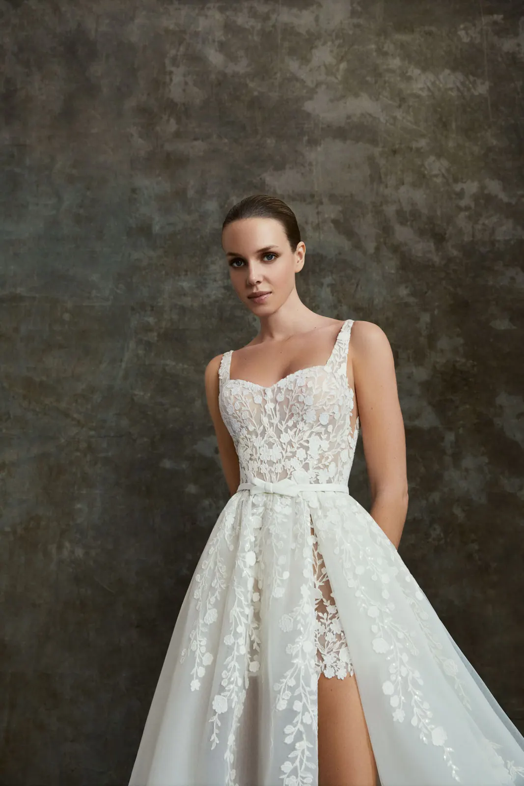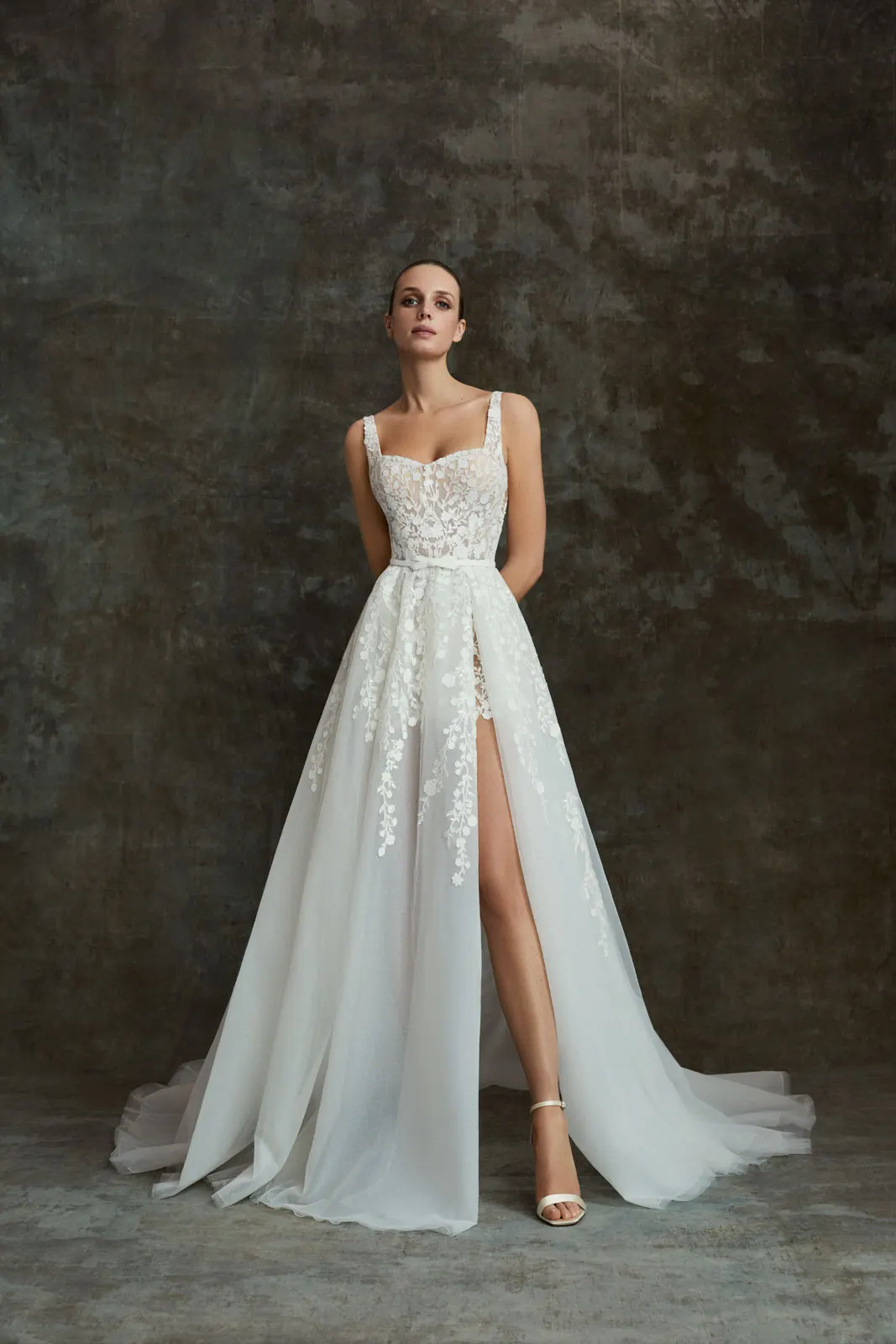 Das Brautkleid Giselle von Alberto Palatchi ist ein modernes und elegantes A-Linien-Brautkleid aus seidigem Tüll und mit floralen Spitzenelementen.