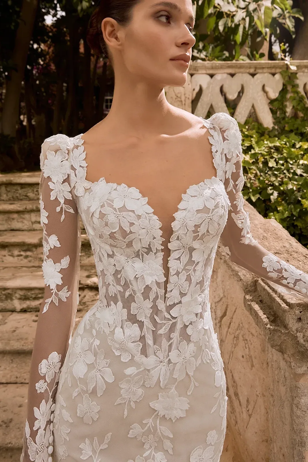 Das Modell Bessi von Alberto Palatchi ist ein elegantes Meerjungfrauen-Brautkleid mit romantischen Spitzenpallikationen.