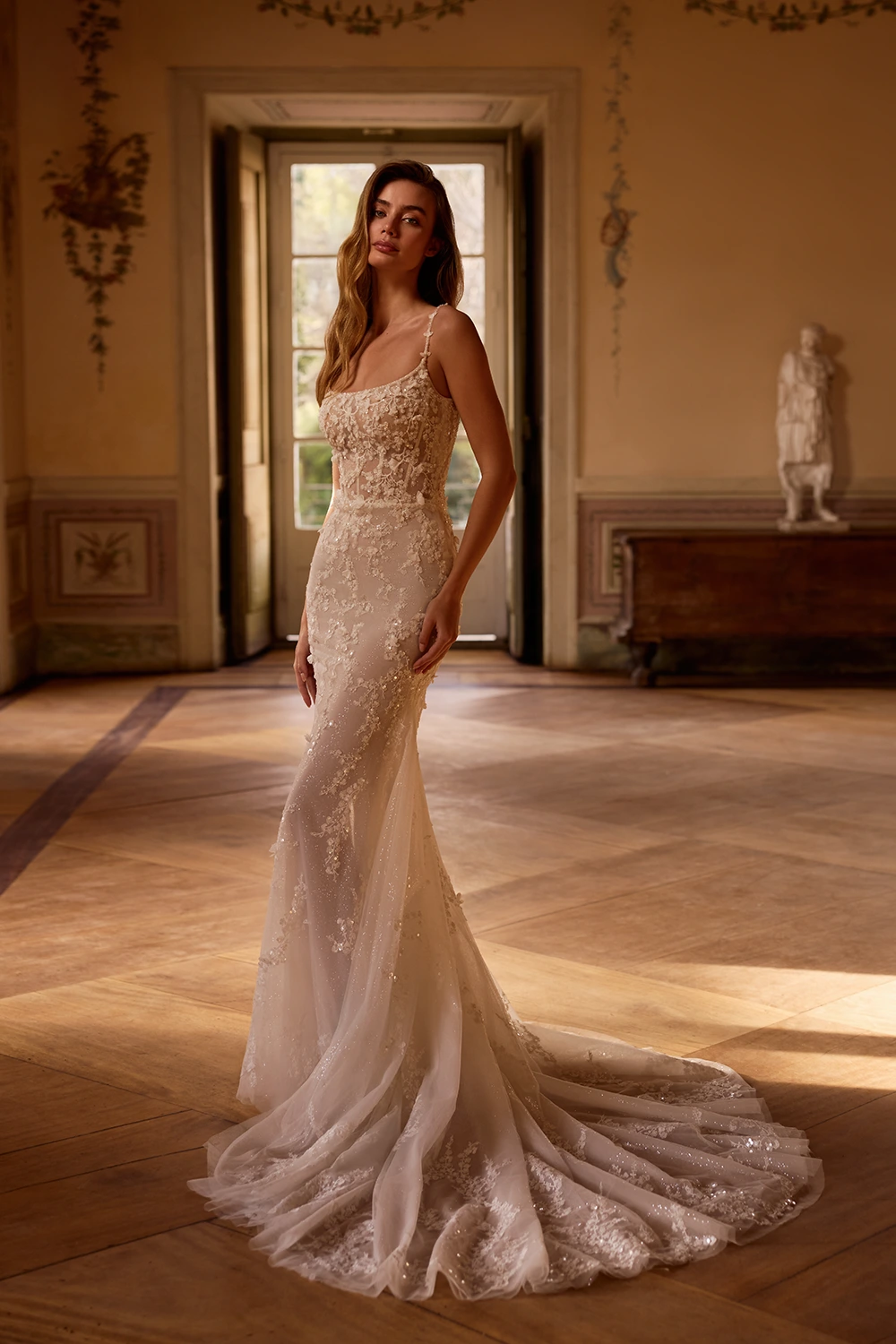 Das Modell Milla von Alberto Palatchi ist ein romantisches Meerjungfrauen Brautkleid aus Tüll mit zarten Spitzenapplikationen.
