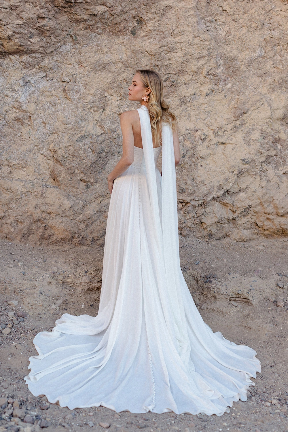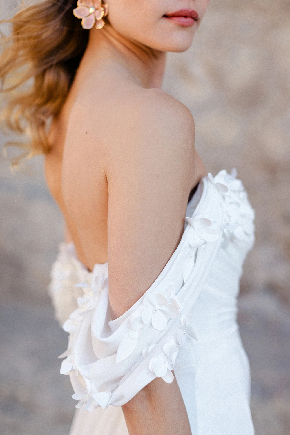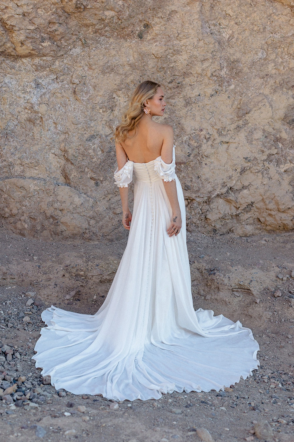 Das Modell Eyre von Allure Bridals ist ein leicht und fließendes Chiffon-A-Linien-Kleid, das mit sanfter Bewegung und einem mühelosen Gefühl entworfen wurde. Dimensionale Applikationen umranden den Ausschnitt und die abnehmbaren schulterfreien Ärmel, die Textur bieten und die Möglichkeit, den Look zu verändern. Ein gerafftes Oberteil fügt der Taille eine sanfte Struktur hinzu.