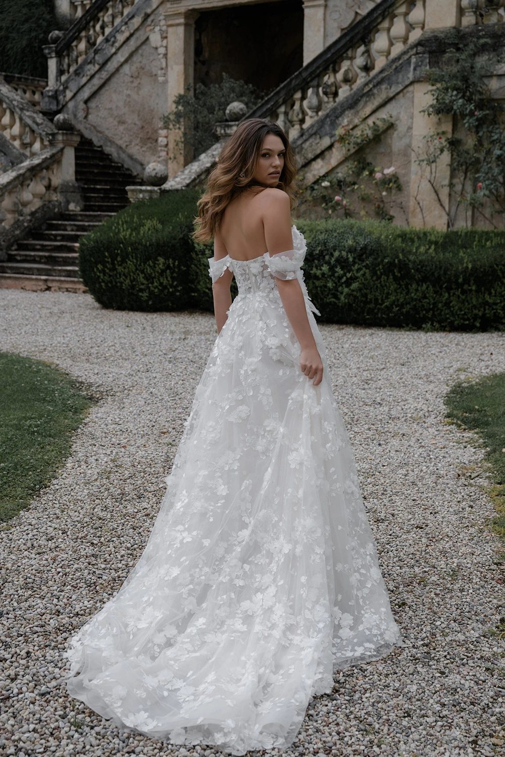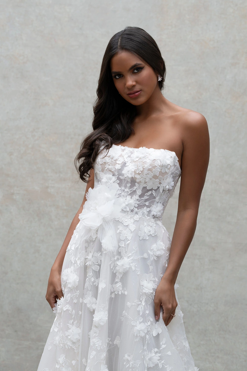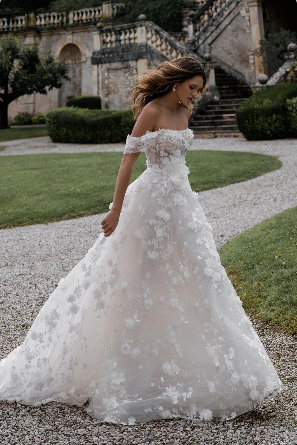 Das Modell Fauna von Allure Bridals ist ein florales A-Linien Brautkleid mit floralen 3D Blumen, breiten Carmenträgern und einer Statement Blume im Taillenbereich.