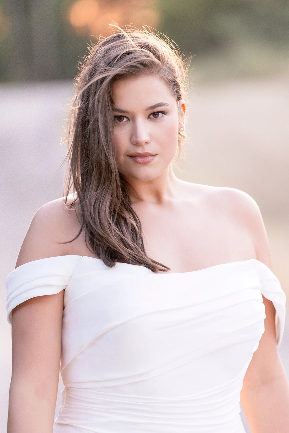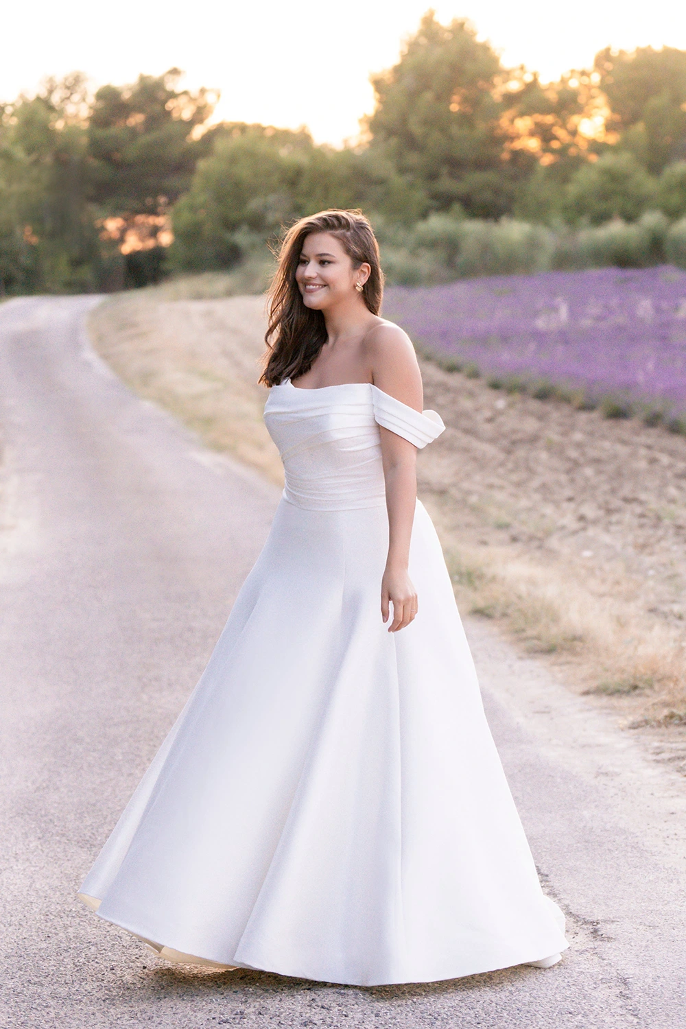 Das Modell W523 Curvy von Allure Bridals ist ein cleanes Prinzessinnen Brautkleid mit zarten Raffungen und Carmenträger im Oberteil.