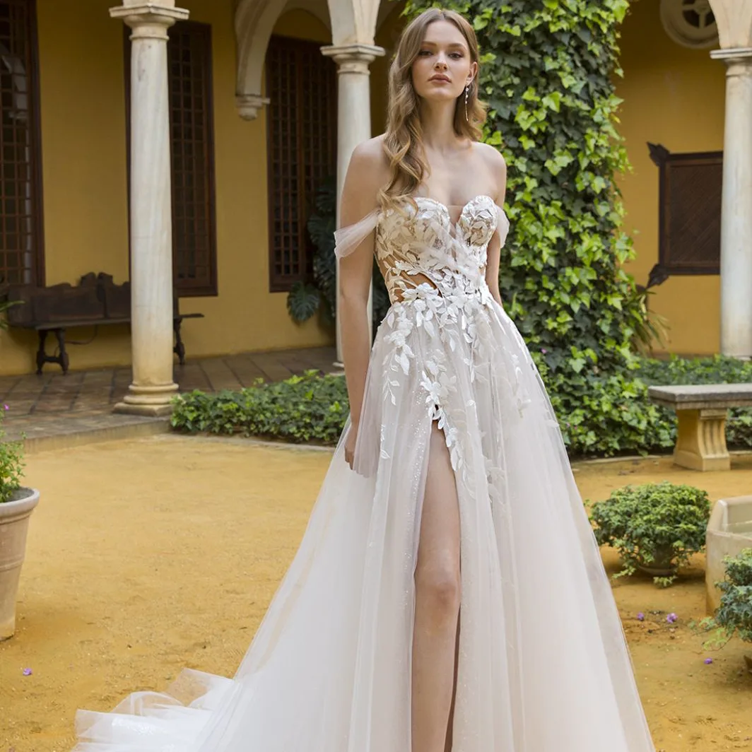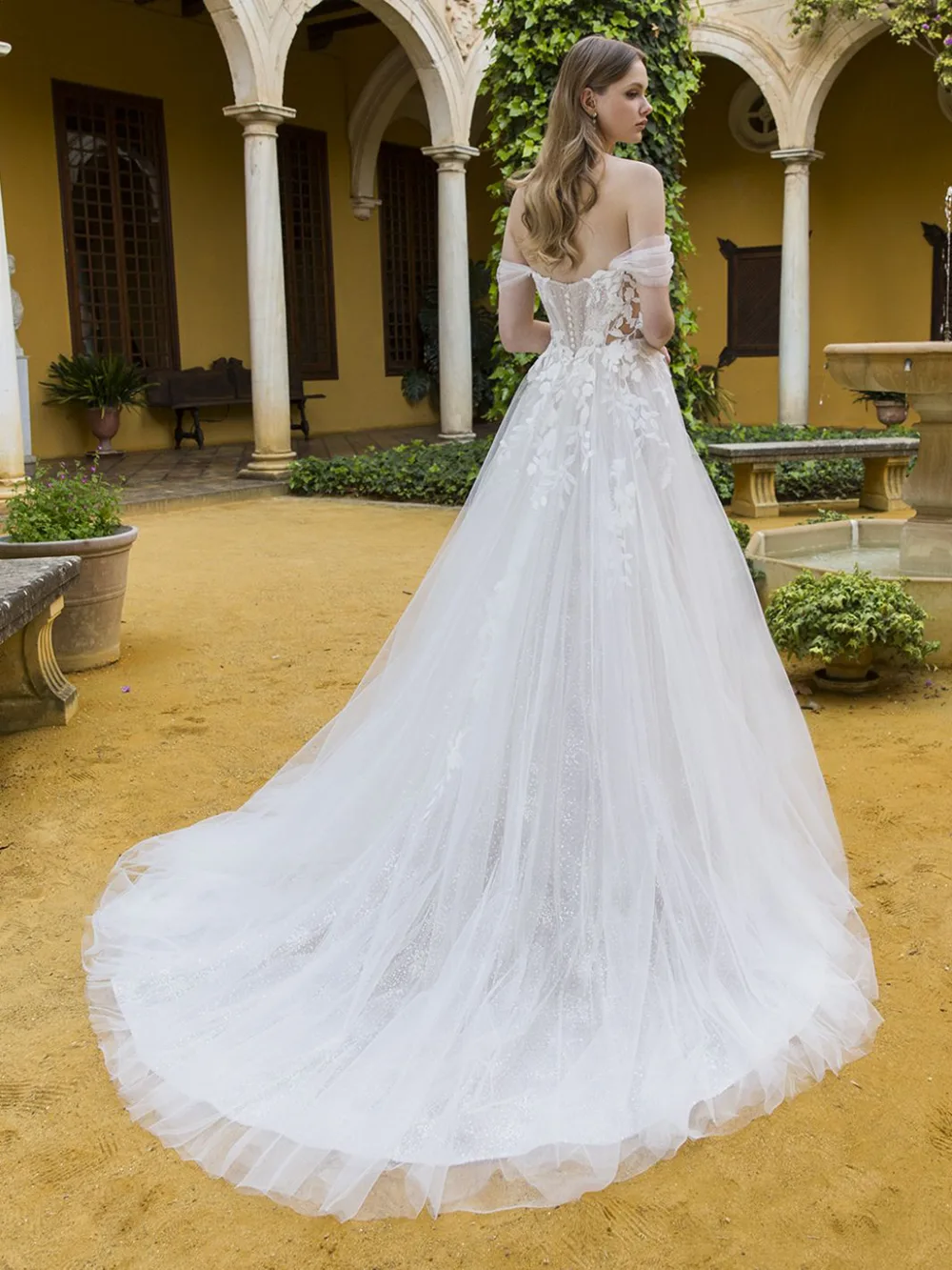 Blue by Enzoani hat mit Pia ein weiteres Brautkleid voller romantischer Details geschaffen. Sein transparentes Mieder mit sichtbaren Stäbchen ist mit floraler 3D-Spitze bedeckt, die über die Taille in den Rock fließt. Ein Tüllstreifen ist diagonal über das Oberteil drapiert und geht über in seitliche, abnehmbare Träger im Carmen-Stil. Die Rockpartie besteht aus paillettenbesticktem Tüll, der dadurch schlicht und doch glamourös glitzert. Die geschichtete Schleppe bietet einen dezenten Abschluss.