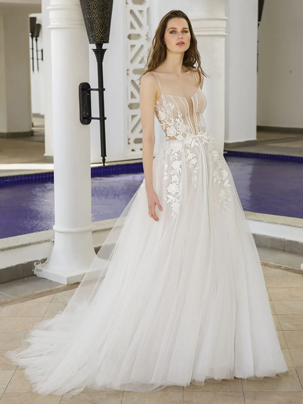 Das Brautkleid Reiko von Blue by Enzoani ist ein traumhaftes A-Linien Brautkleid mit tiefen V-Ausschnitt und seitlichen Illusionsausschnitten.