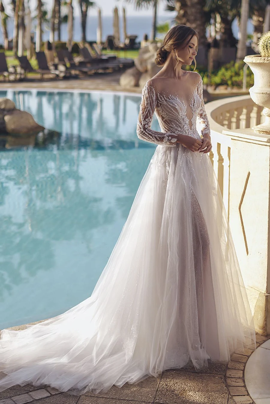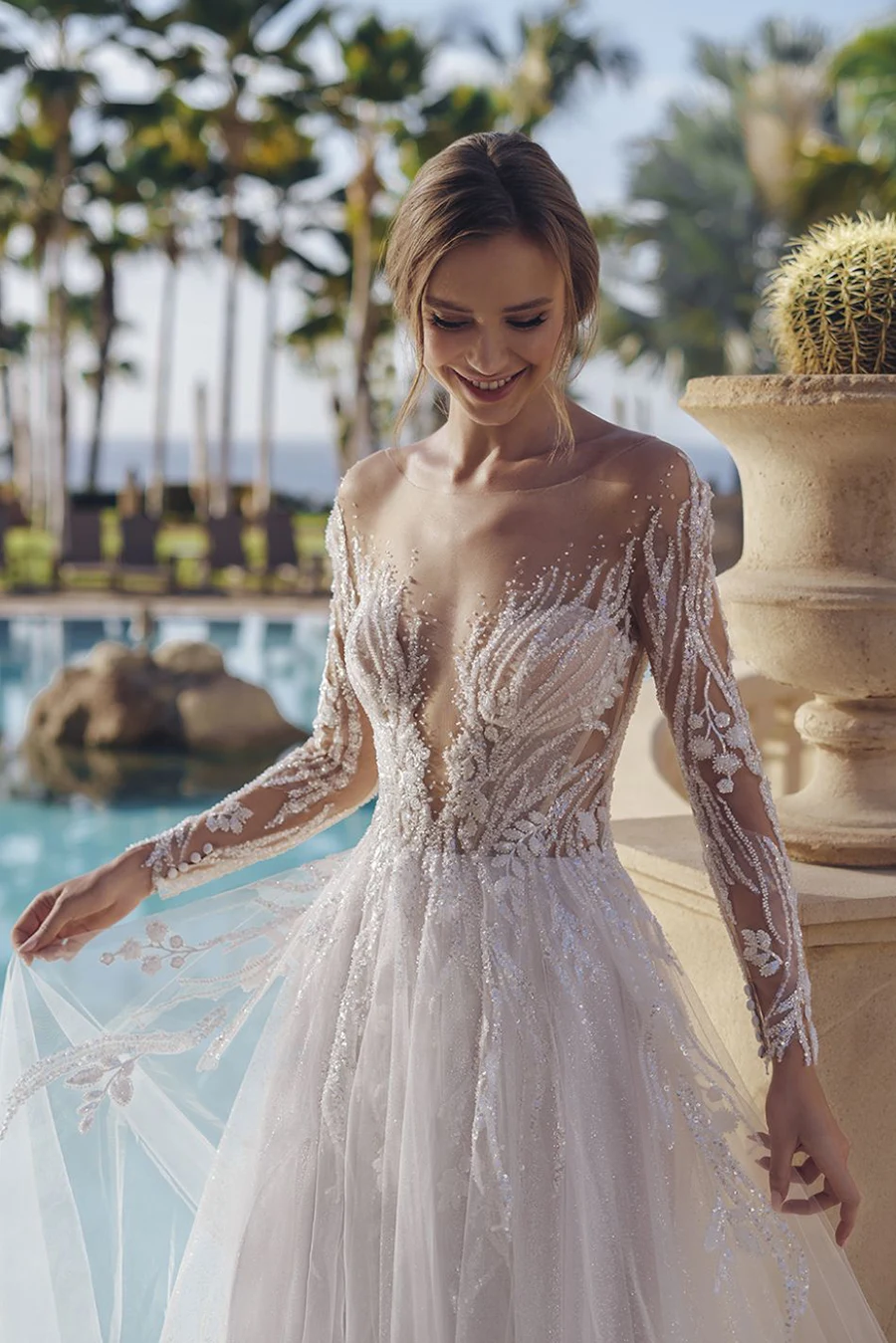 - lange Ärmel mit perlenbesetzter Blattspitze
