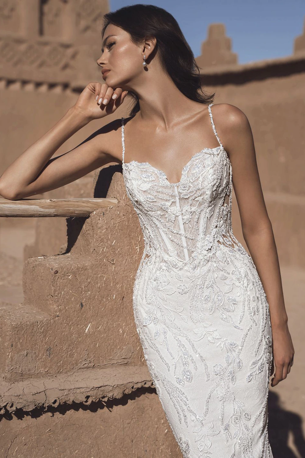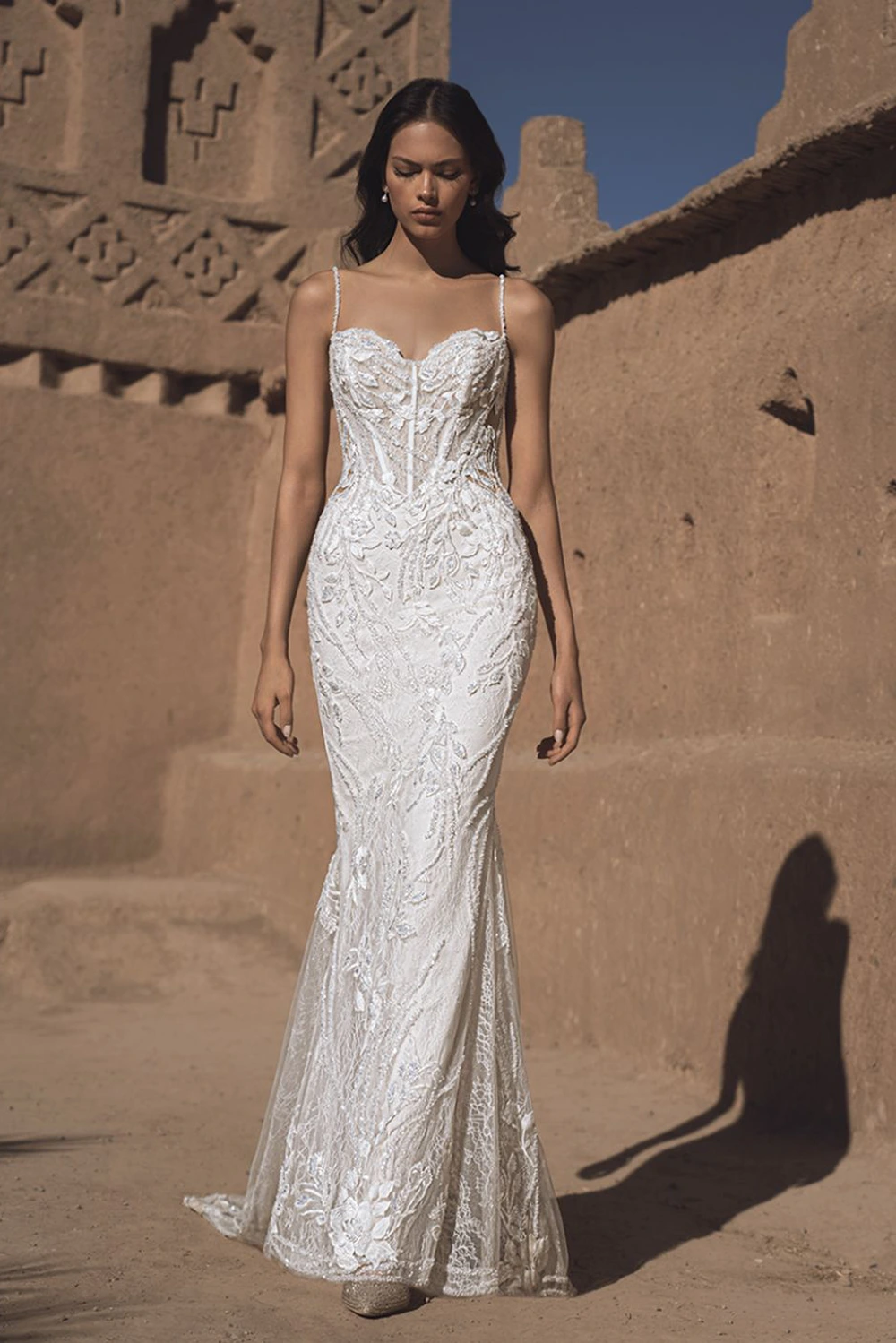 Das Modell Thao von Enzoani Blue ist ein ein modernes Fit und Flare Brautkleid aus luftiger Spitze. Der herzförmige Ausschnitt umrahmt das Dekolleté wunderschön, während die Perlenverzierung bei jeder Bewegung zart schimmert. Der geschnürte Korsettrücken verleiht der verträumten Silhouette einen Hauch von skulpturaler Dramatik.