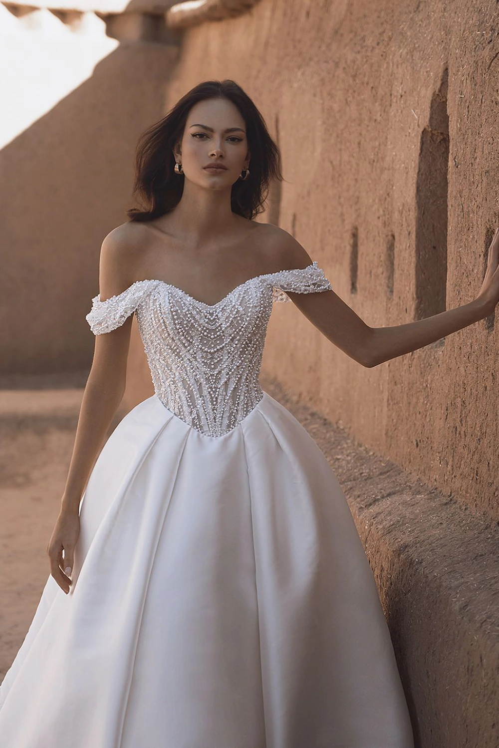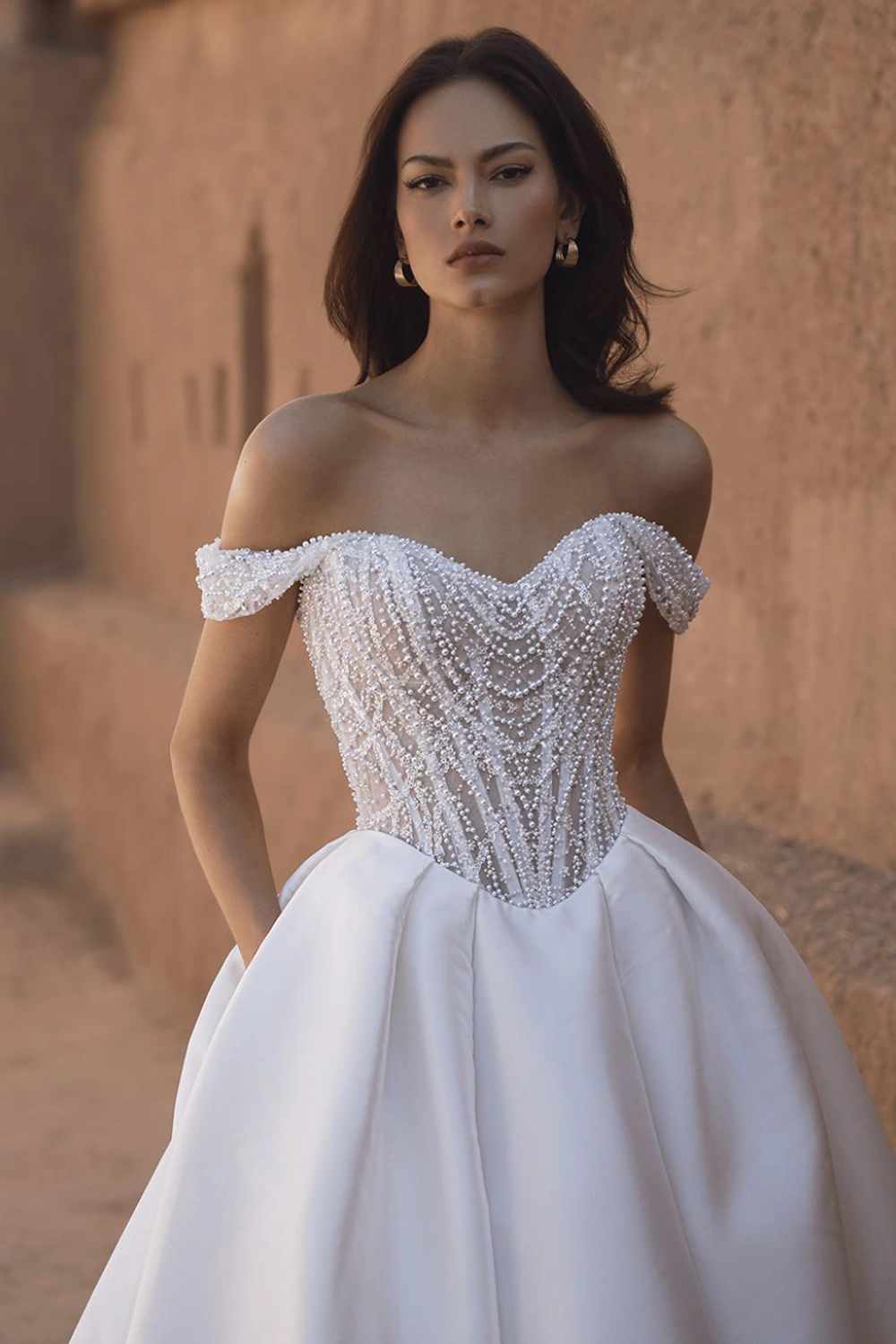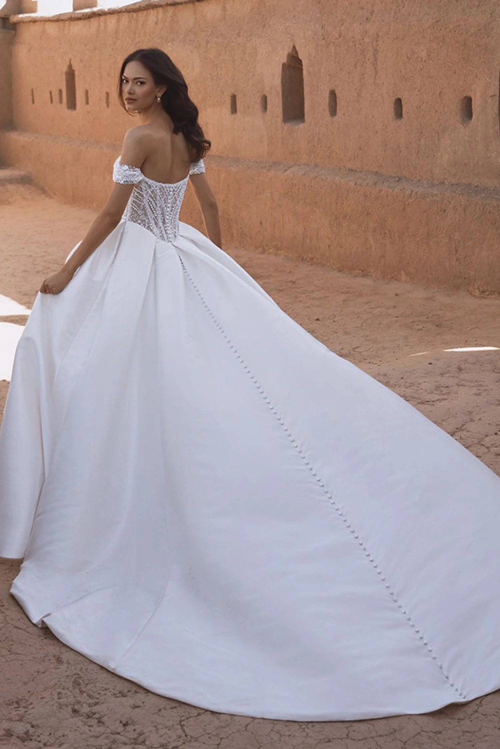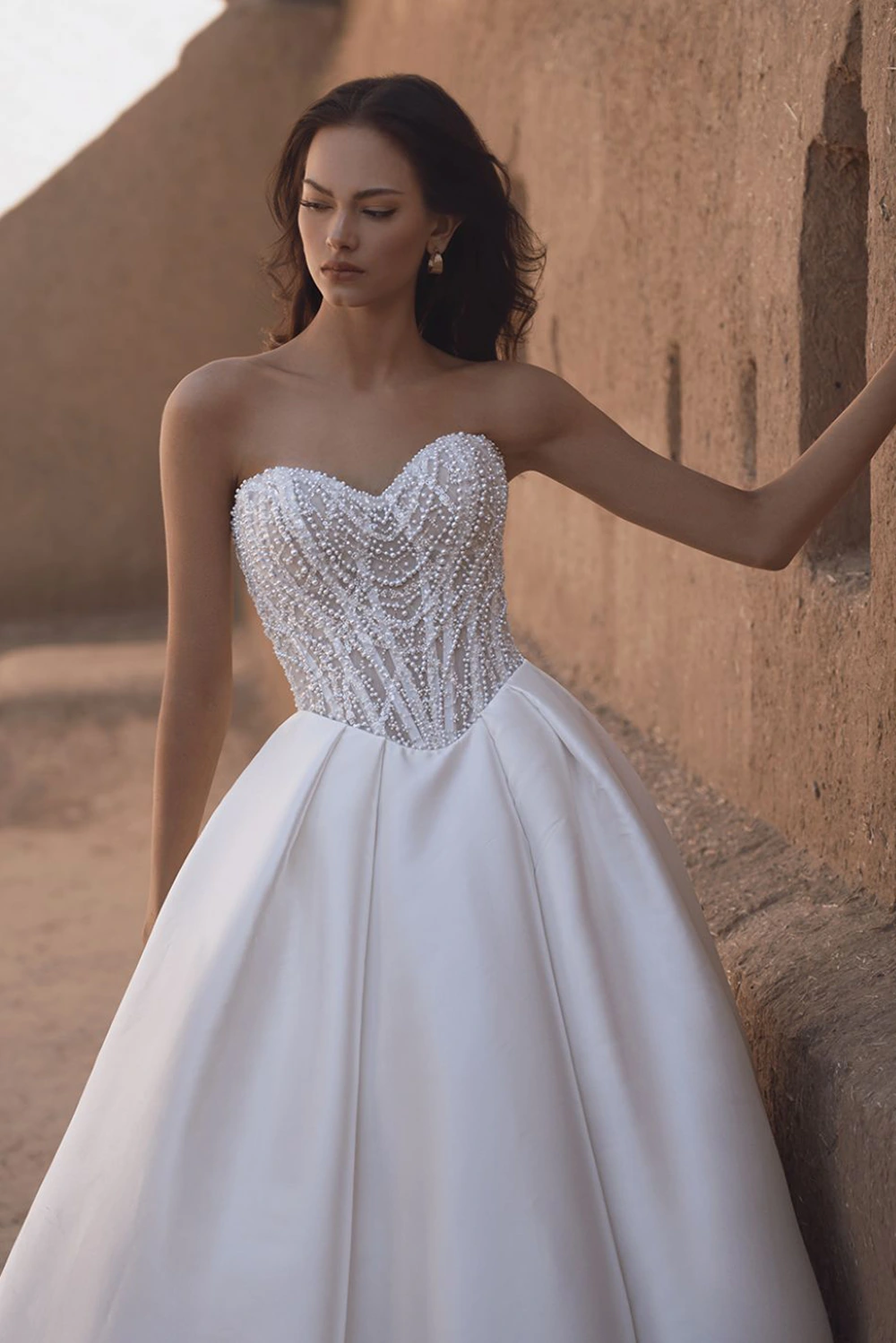 Das Modell Theodora von Enzoani Blue ist ein Kleid im Prinzessinnenstil aus luxuriösem Mikado gefertigt und mit filigranen, perlenbesetzten, geometrischen Spitzendetails verziert. Der herzförmige Ausschnitt verleiht einen Hauch von Romantik, während die Taschen dieser skulpturalen Silhouette einen verspielten Charme verleihen.