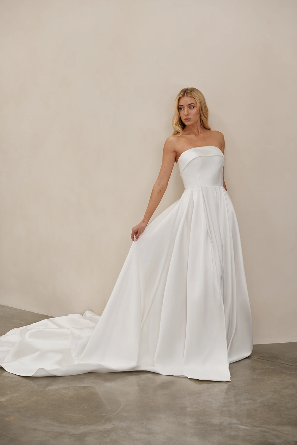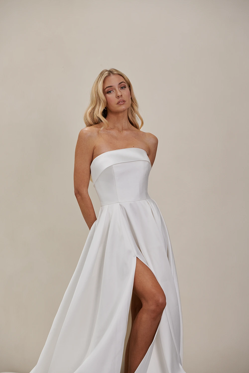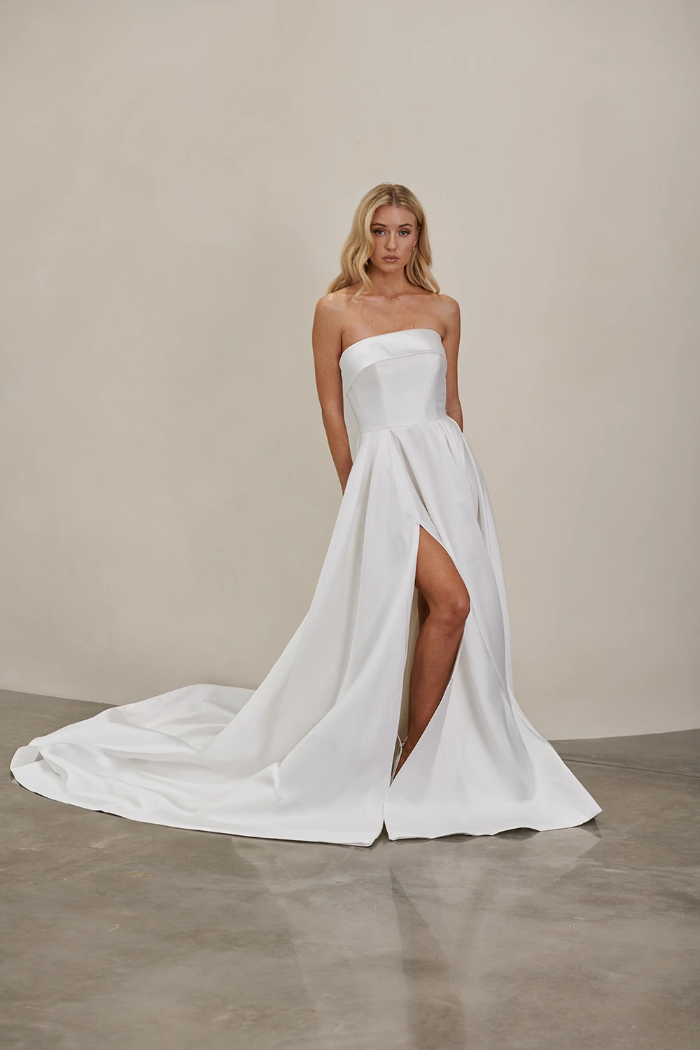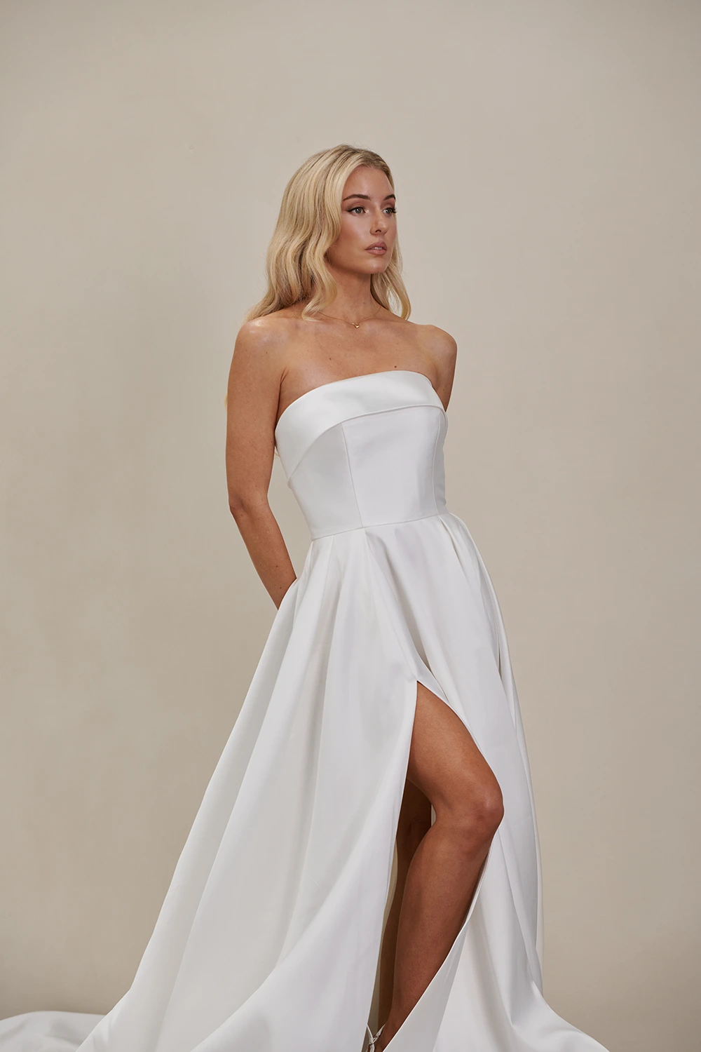 Das Modell WW23252 von Cizzy Bridal Australia ist ein cleanes, trägerloses A-Linien Brautkleid mit einem hohen Beinschlitz.