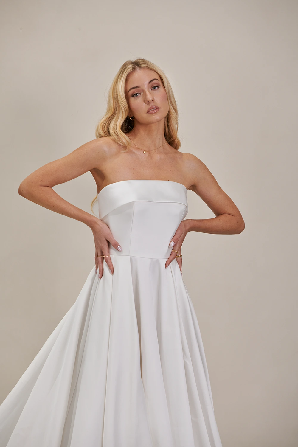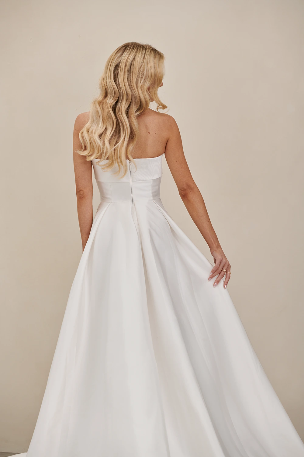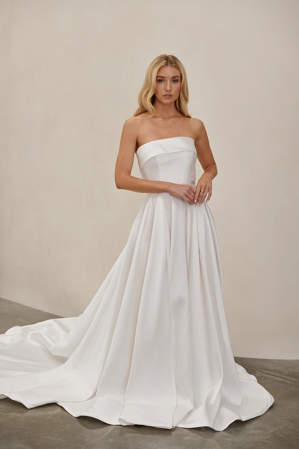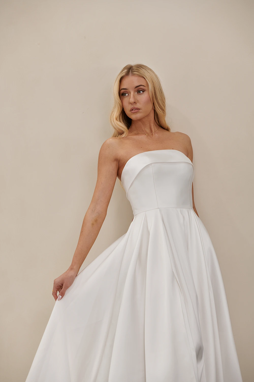 Das Modell WW23252 von Cizzy Bridal Australia ist ein cleanes, trägerloses A-Linien Brautkleid mit einem hohen Beinschlitz.