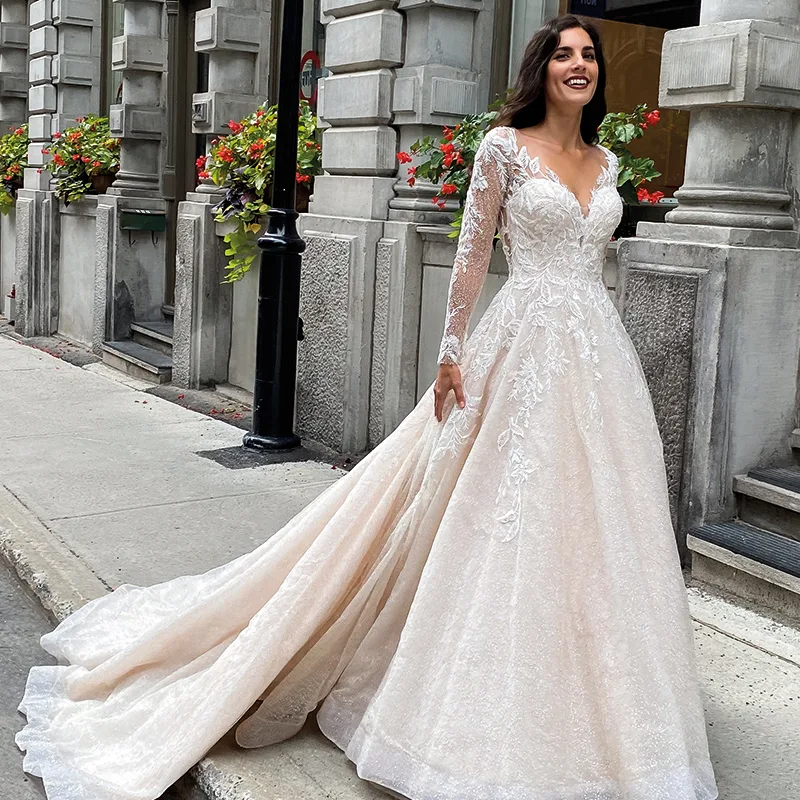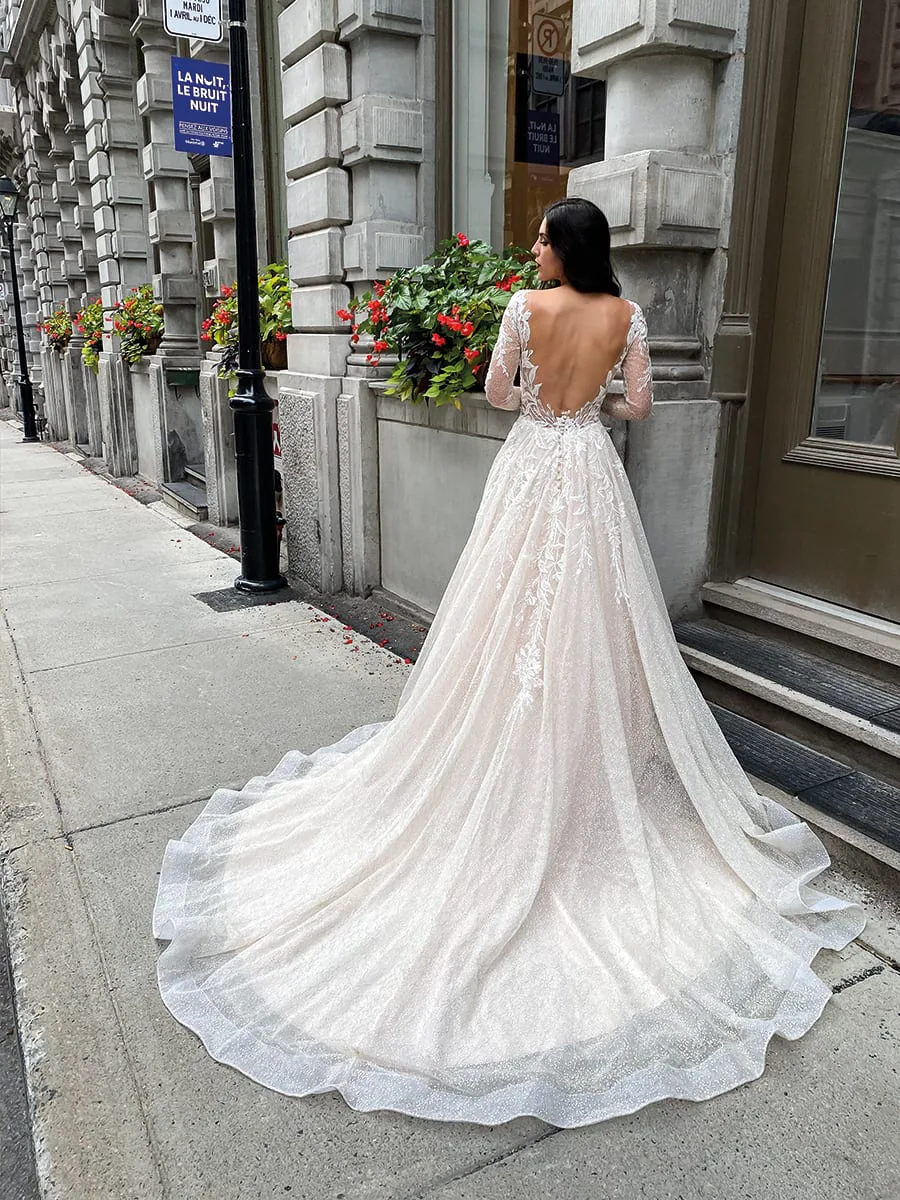 Das Brautkleid Cersei von Eddy K betont mit seiner Form und Verzierung Deine klassische Schönheit. Sein Oberteil besitzt eine romantischen Herzausschnitt. Darüber legt sich eine transparente Lage Tüll, die V-förmig verläuft und in lange Ärmel übergeht. Spitze in floralem Design bedeck das gesamte Oberteil sowie den Übergang zur Rockpartie und rahmt besonders schön den tiefen Rückenausschnitt. Zudem ist das gesamte Kleid mit glitzernden Pailletten bestickt. Am Rücken befindet sich eine kurze Knopfleiste. Der gefütterte Tüllrock weitet sich auf dem Boden zu einer breiten und langen Scheppe, die durch eine Crinolborte am Saum an Dimension gewinnt.