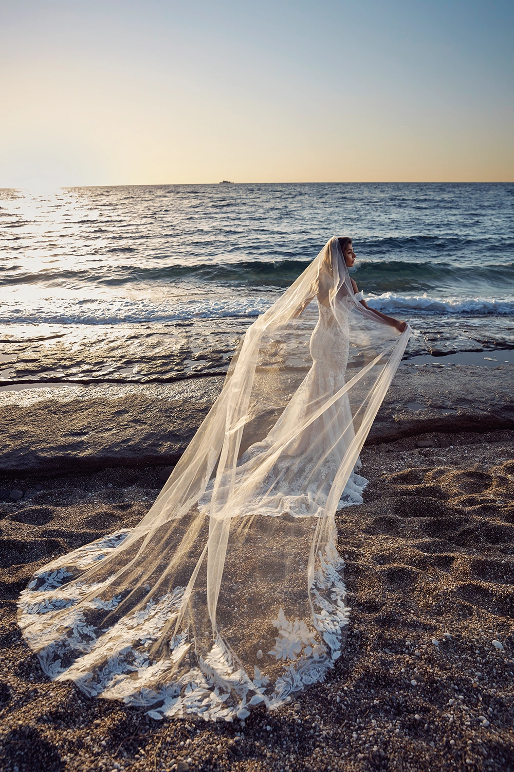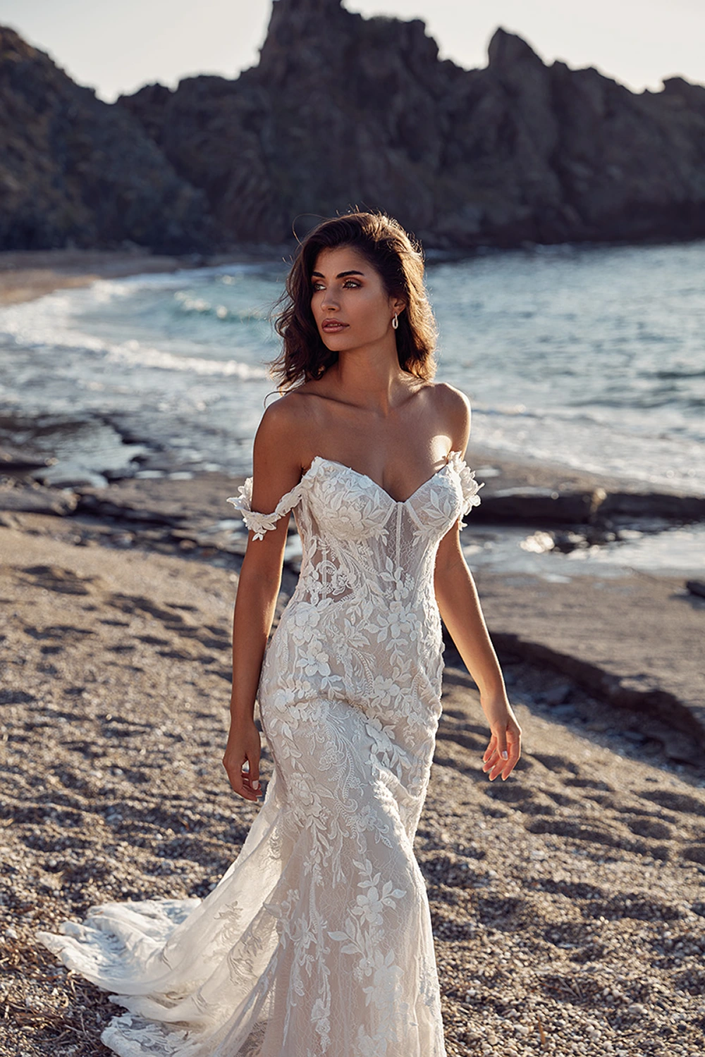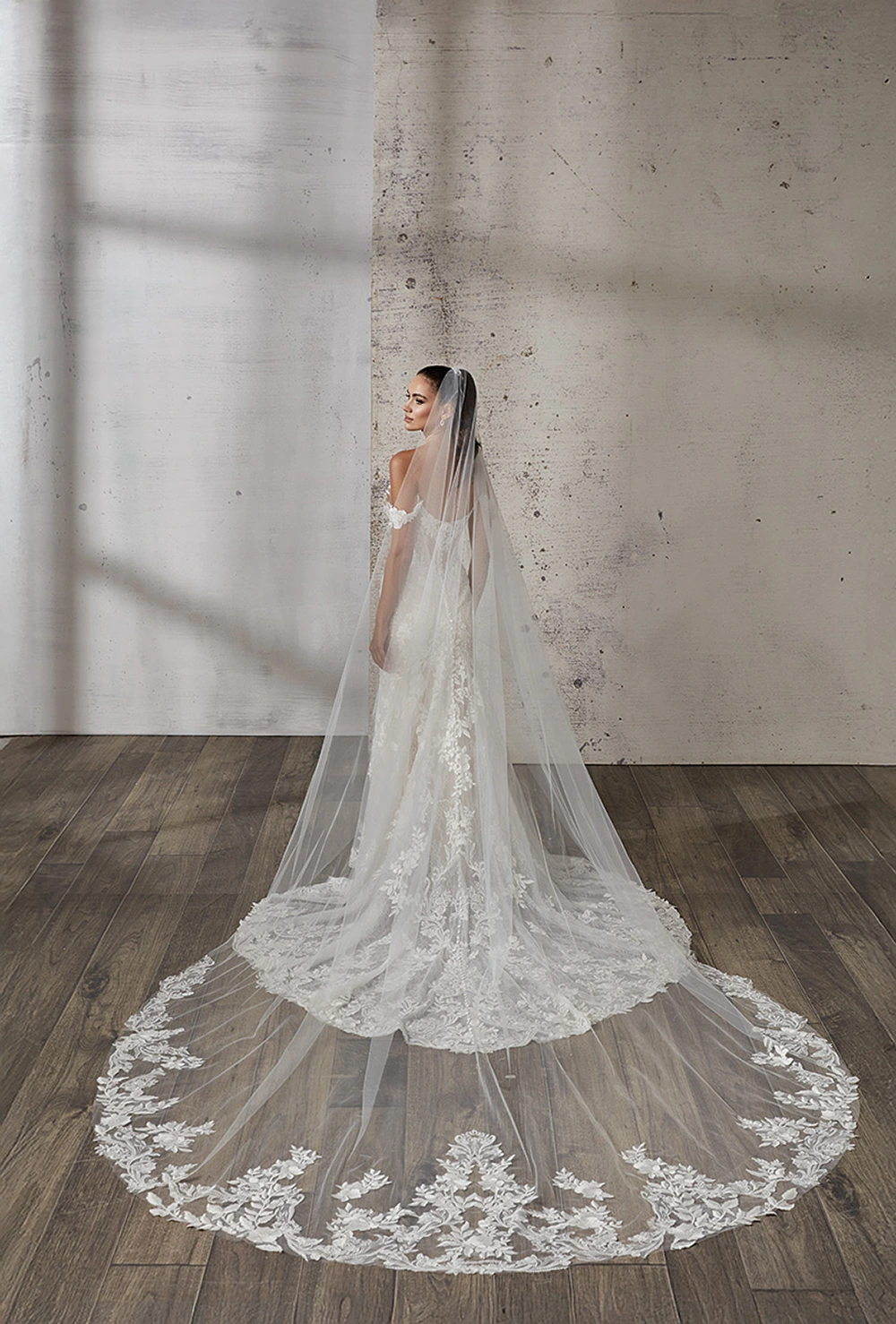 Das Modell Amora von Eddy K ist ein florales Fit und Flare Kleid mit einer langen Schelppe aus Spitze und Carmenträgern.