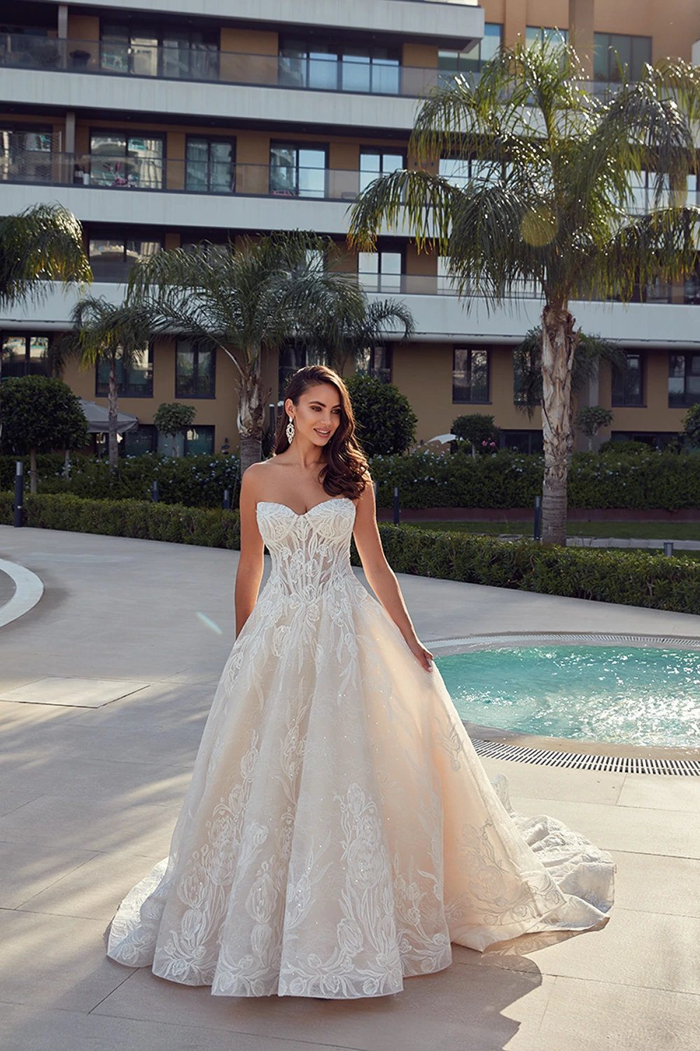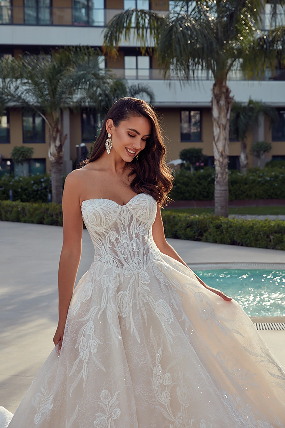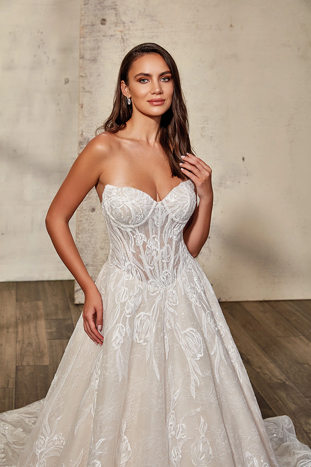 Das Modell Evie von Eddy K ist ein aufregendes trägerloses Prinzesinnen Brautkleid mit einer semitransparenten Corsage, großen Spitzenapplikationen und Glitzertüll.