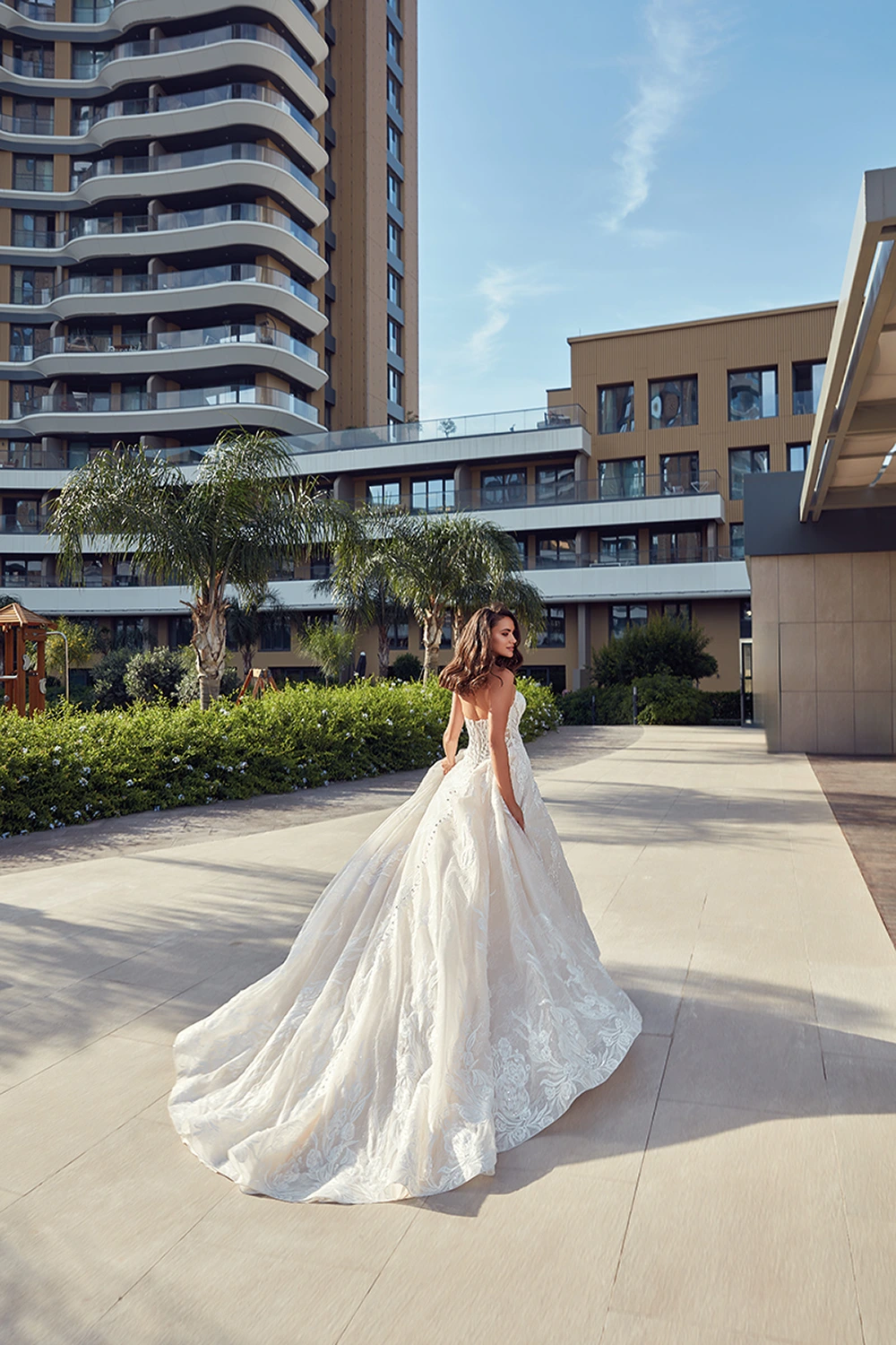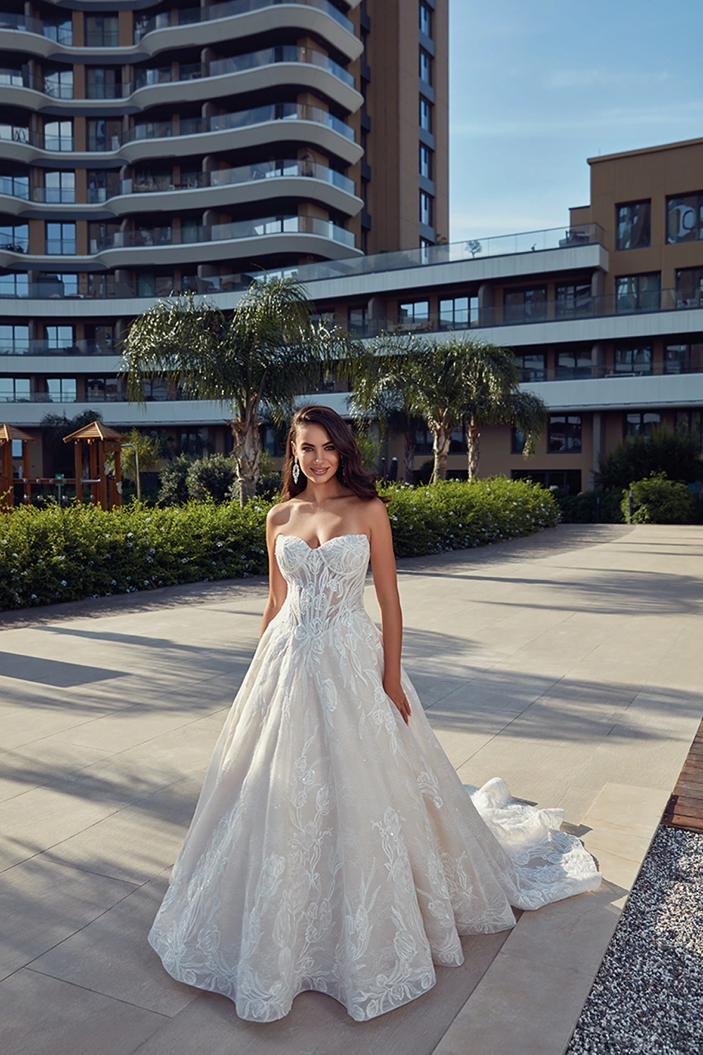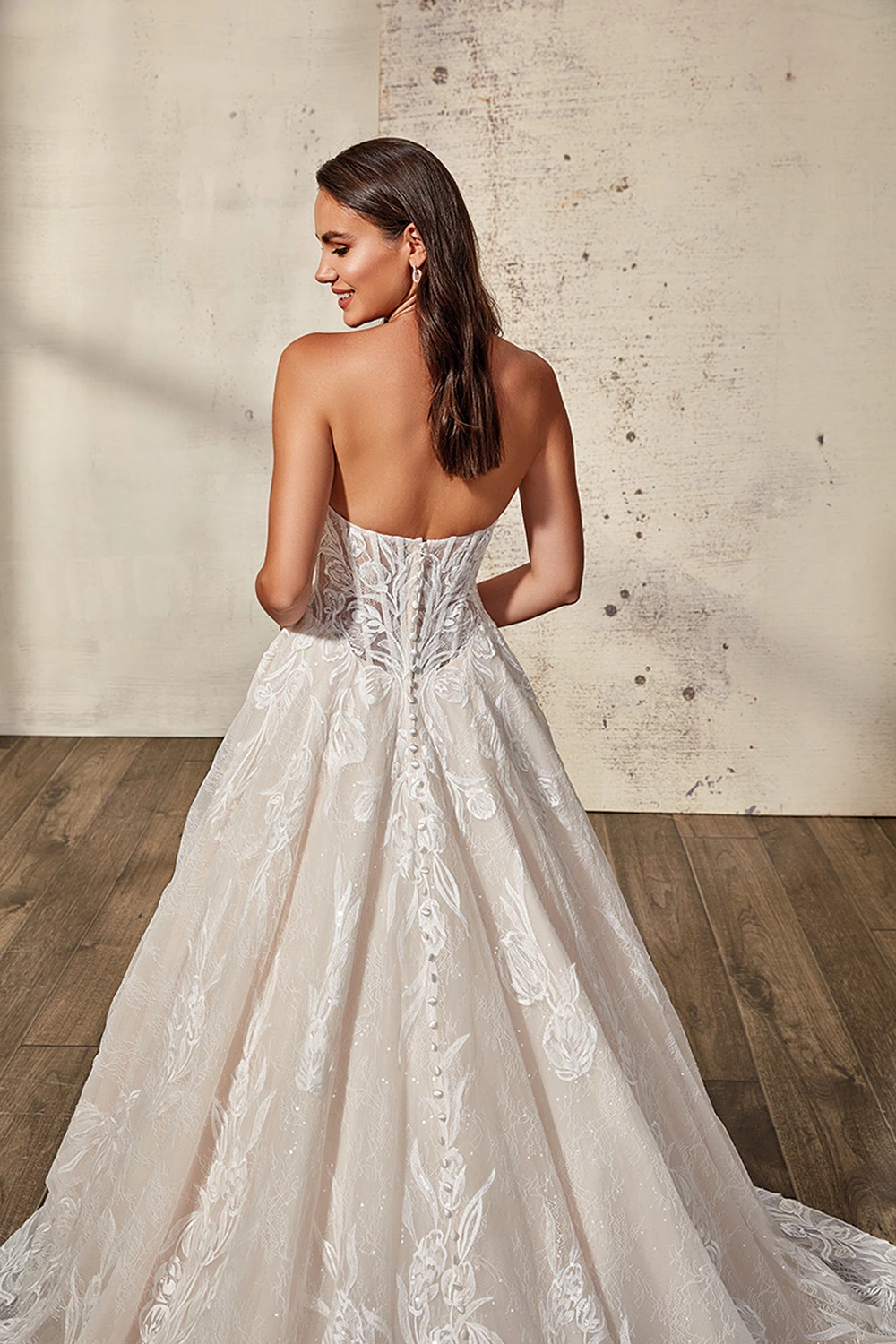 Das Modell Evie von Eddy K ist ein aufregendes trägerloses Prinzesinnen Brautkleid mit einer semitransparenten Corsage, großen Spitzenapplikationen und Glitzertüll.
