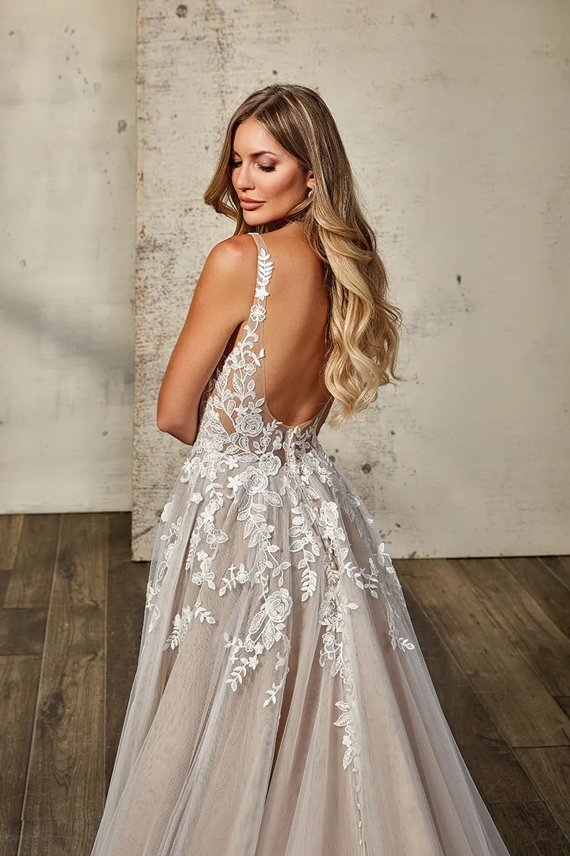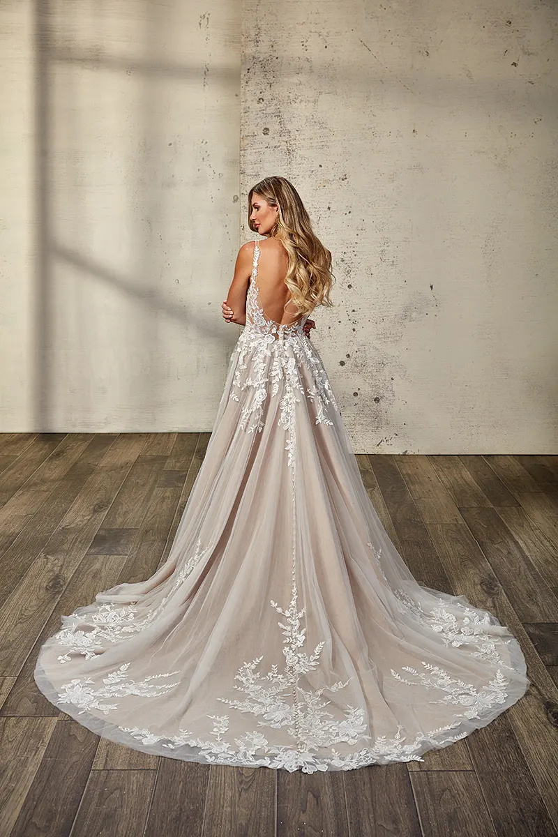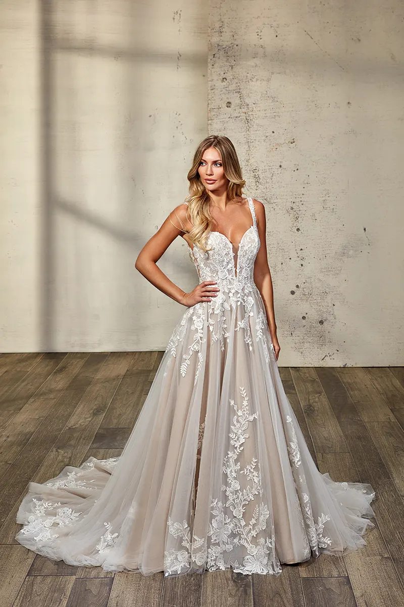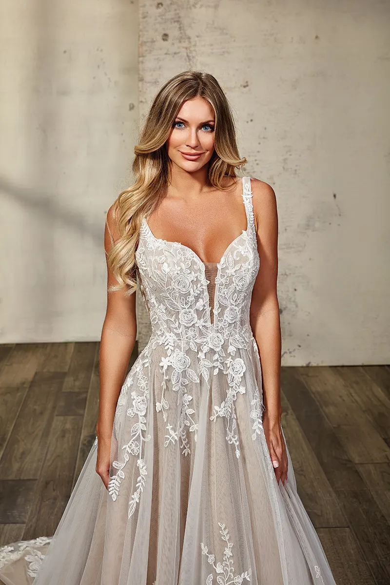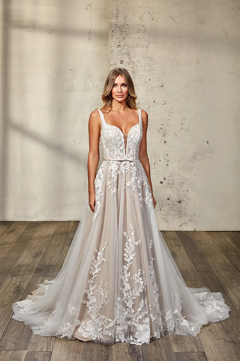 Das Brautkleid Franca von Eddy K ist ein klassisches A-Linien Brautkleid, das deine Taille mit einem Satinband und Schleife betont.