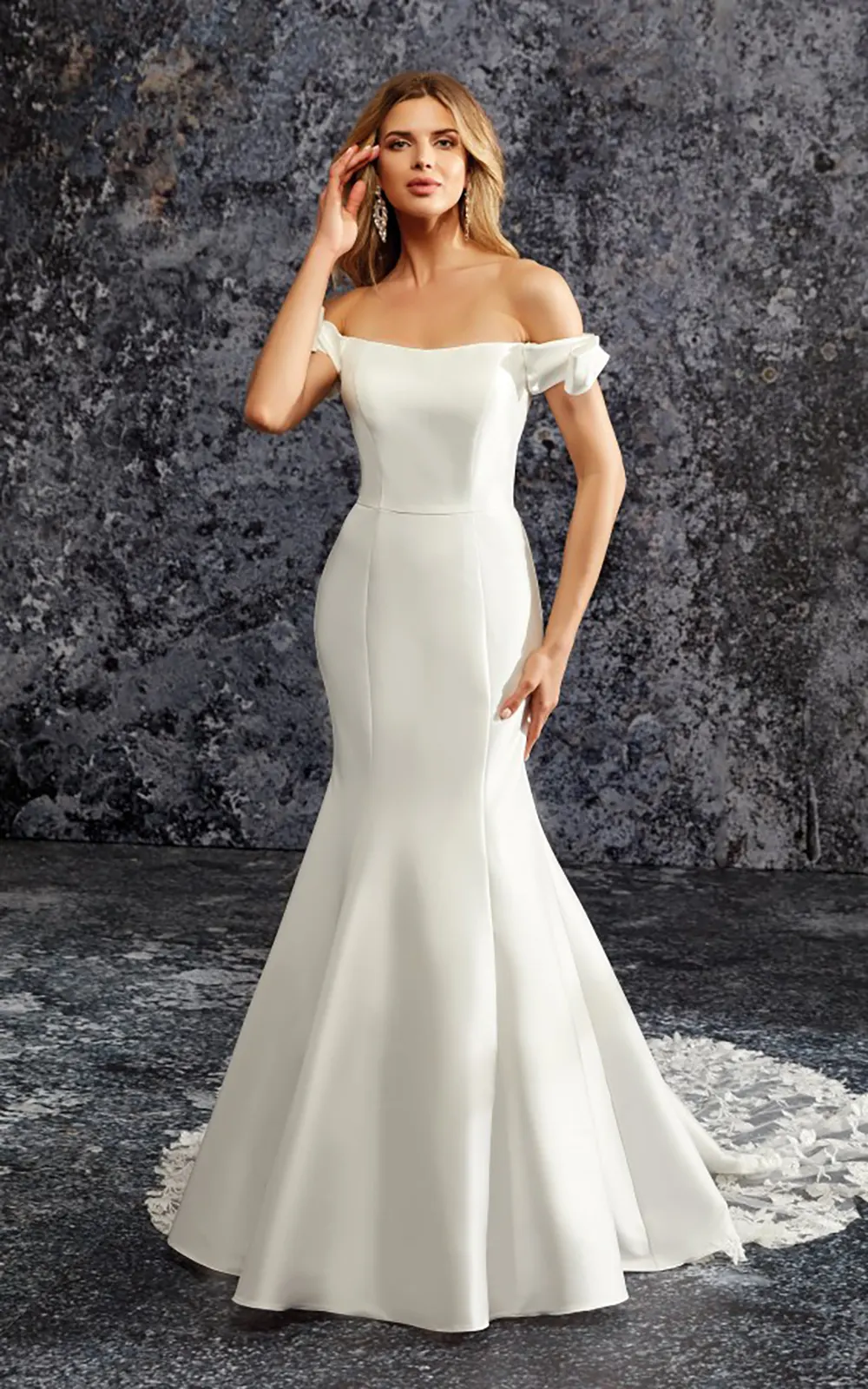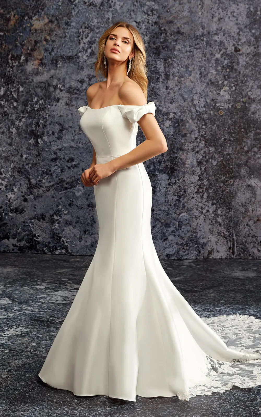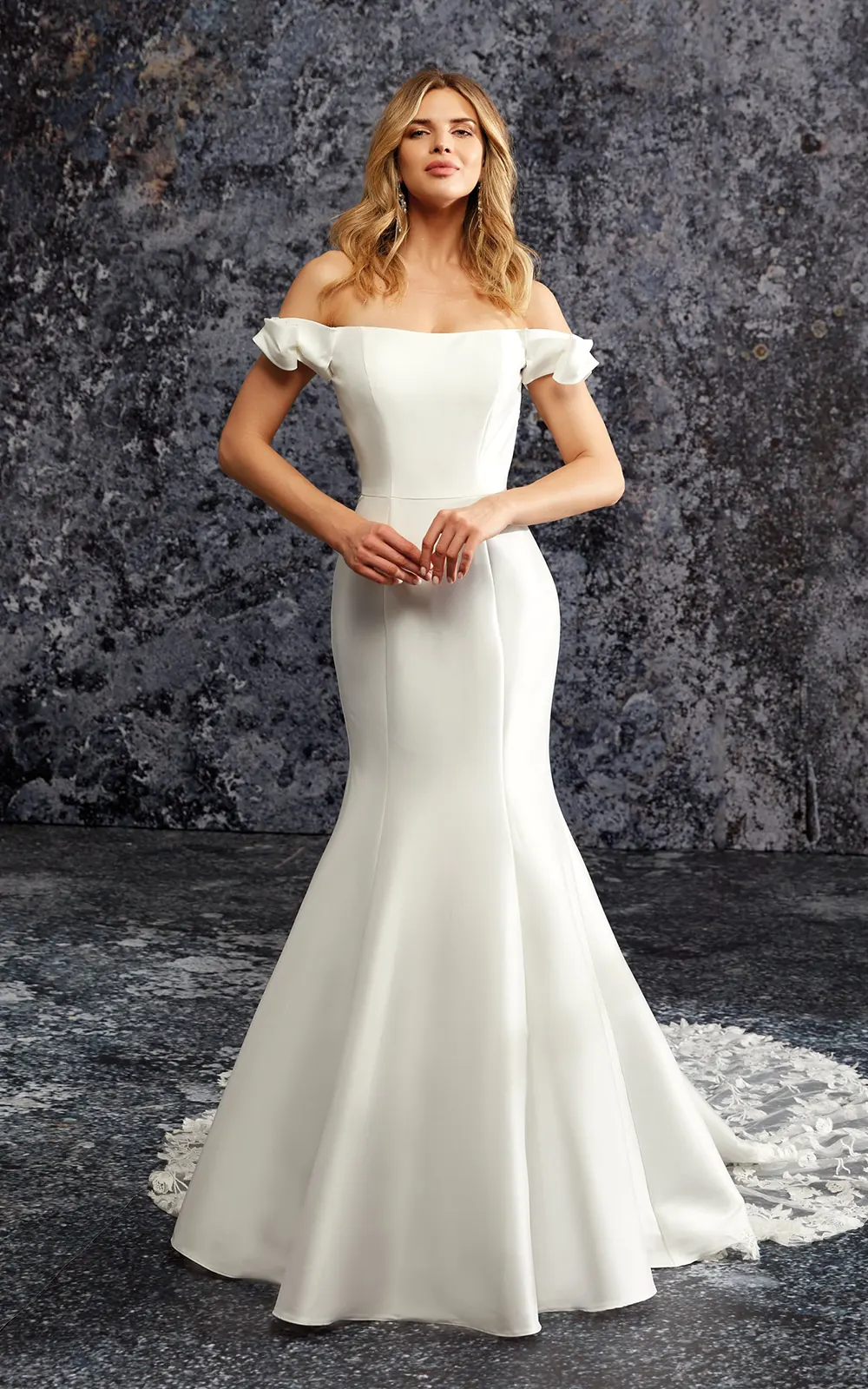 Das Brautkleid Janet von Eddy K ist ein schlichtes Mikado-Brautkleid im Meerjungfrauen-Schnitt. Die Spitendetails und der besondere Rückenausschnitt machen dieses Kleid ganz besonders.