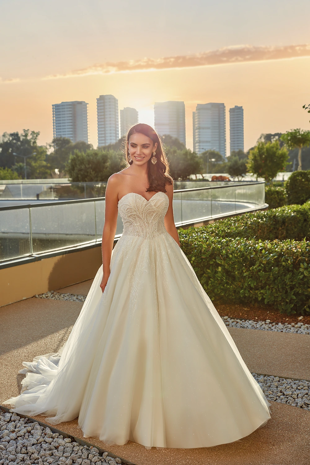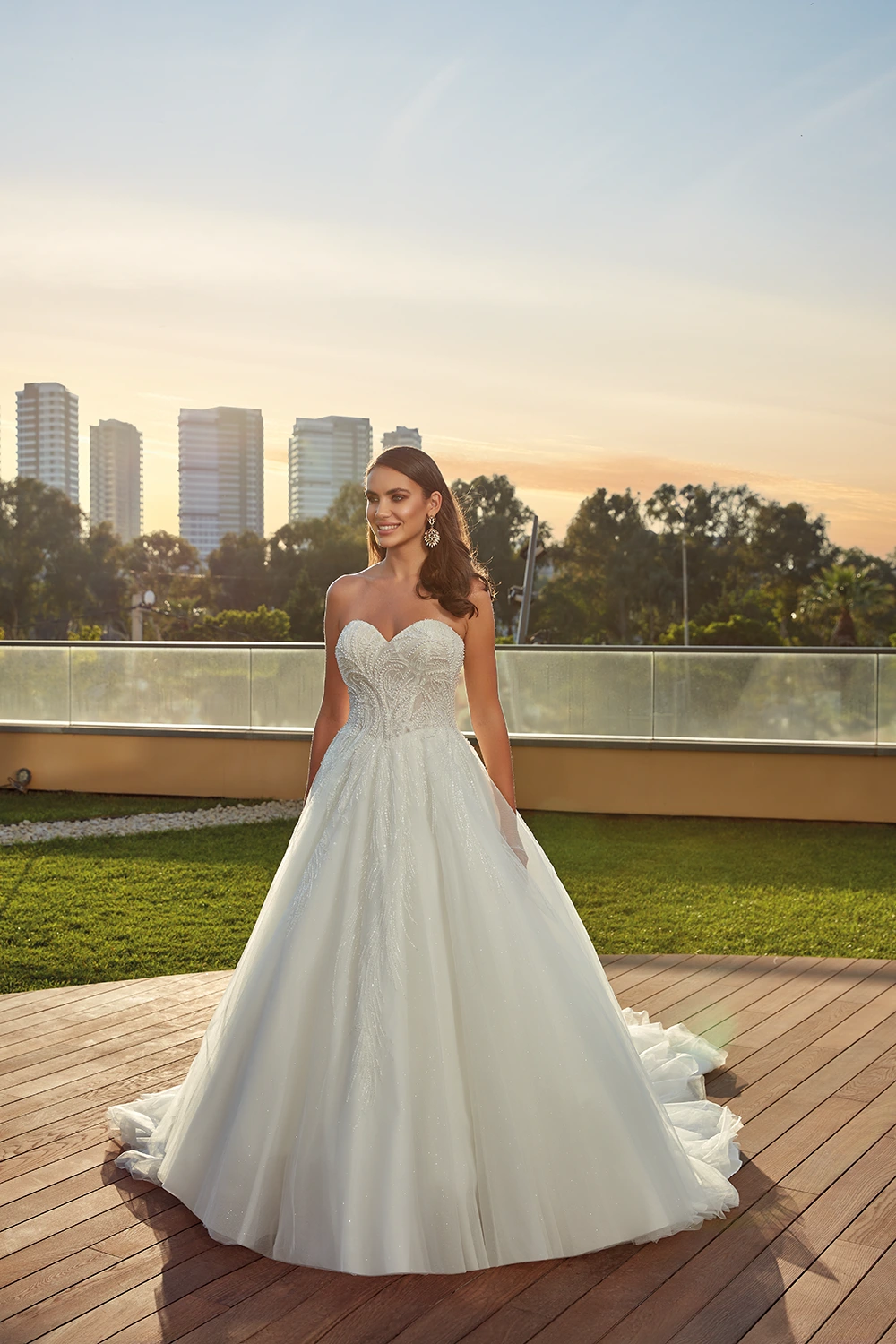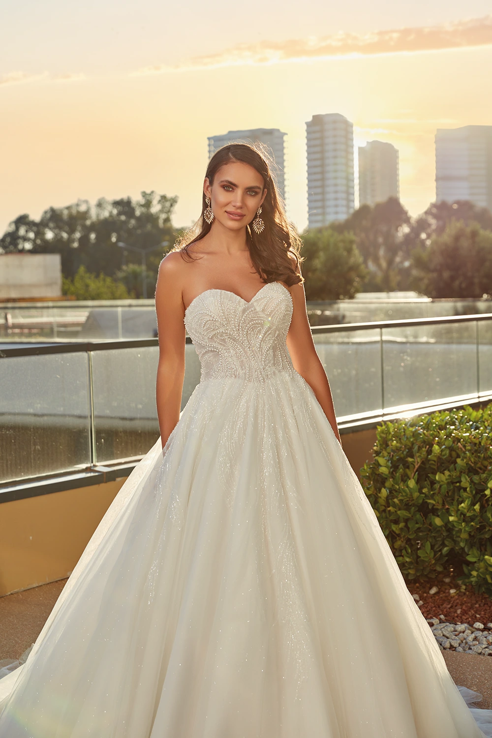Das Modell Keira von Eddy K ist ein Prinzessinnen Brautkleid mit einer funkelnden Corsage aus Glitzer und Perlen.