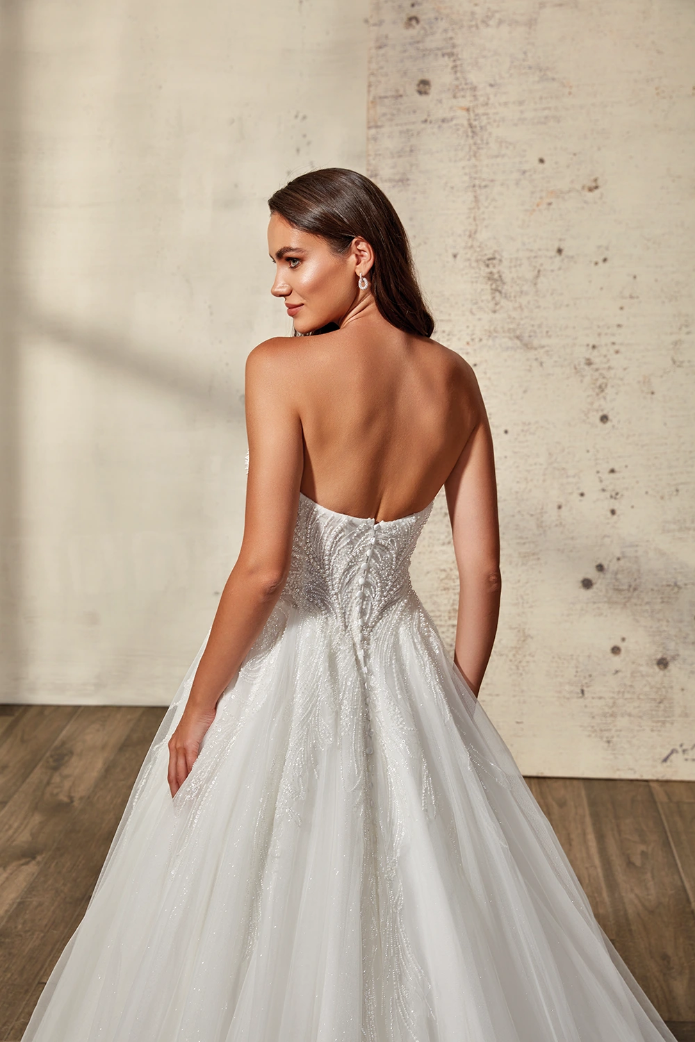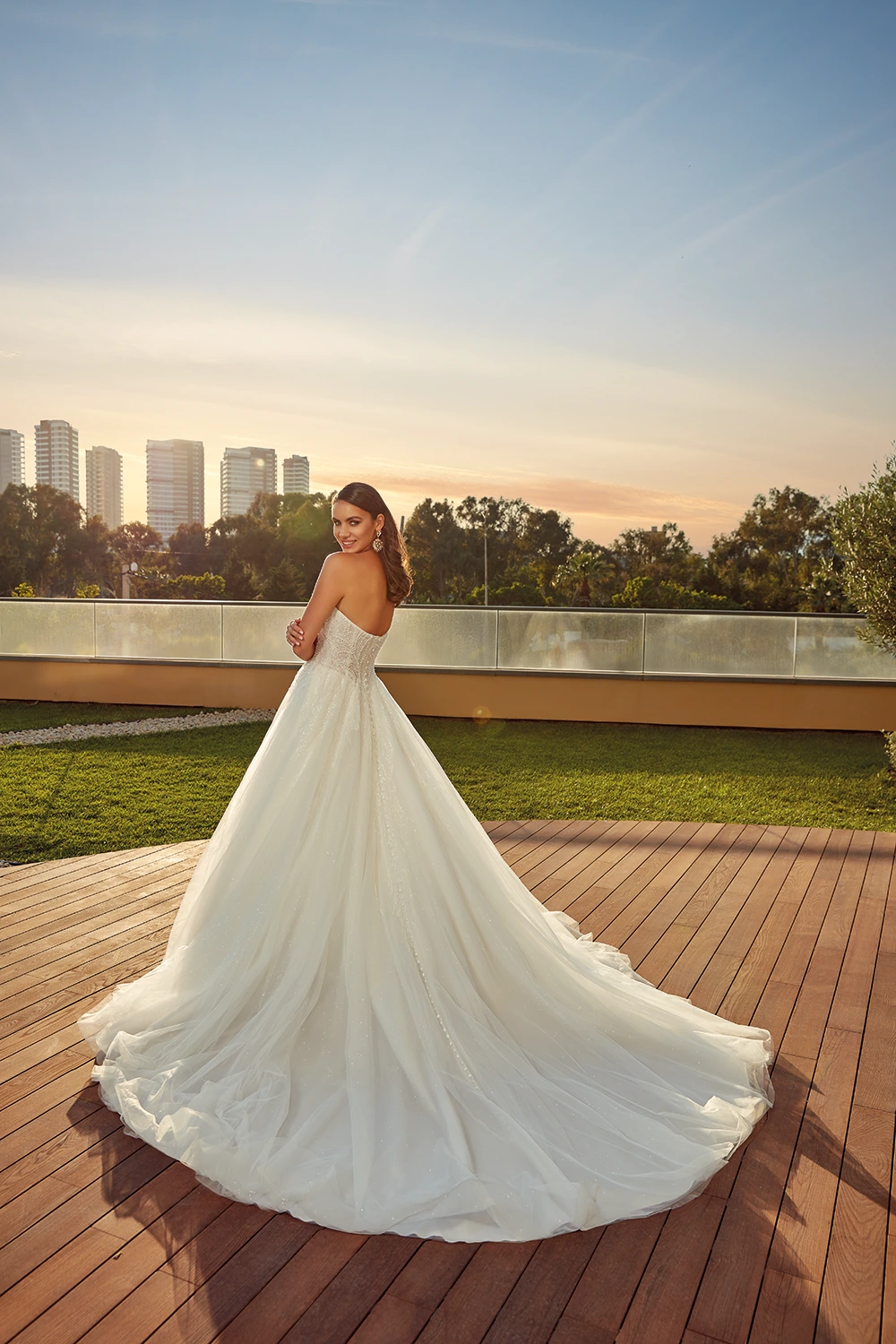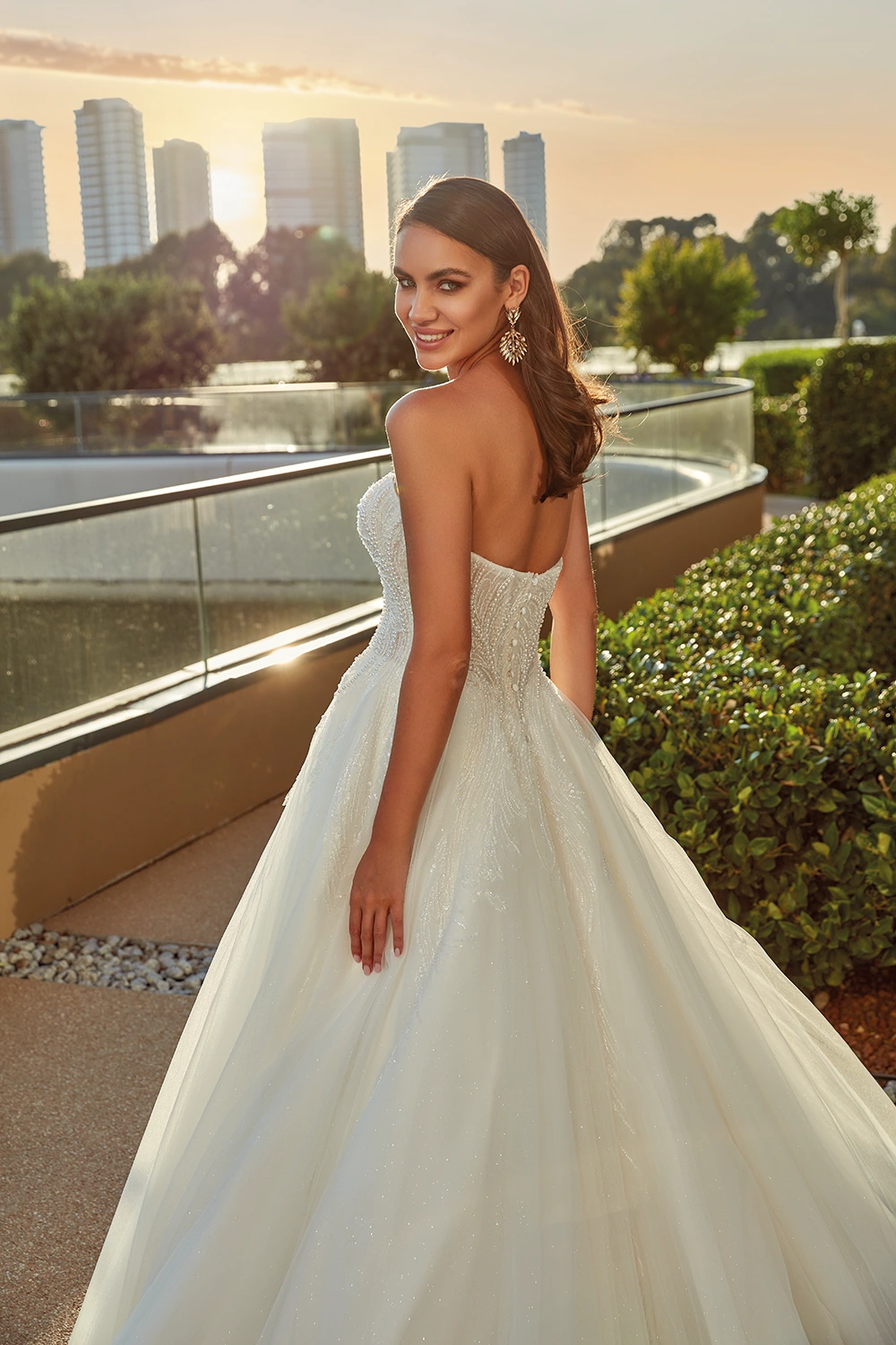 Das Modell Keira von Eddy K ist ein Prinzessinnen Brautkleid mit einer funkelnden Corsage aus Glitzer und Perlen.