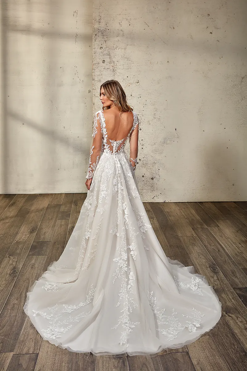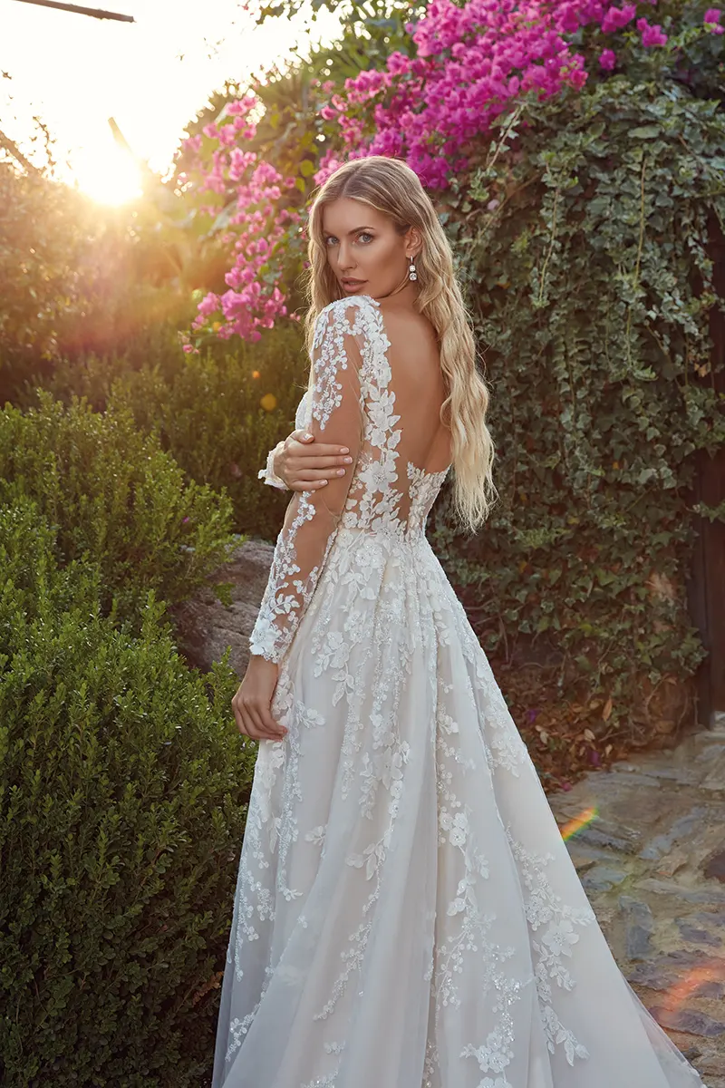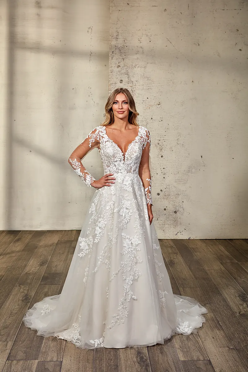 Das Brautkleid Lillian von Eddy K ist ein zeitloses, romantisches A-Linien Brautkleid mit langen Ärmeln, Illusionsspitze und Perlendetails.