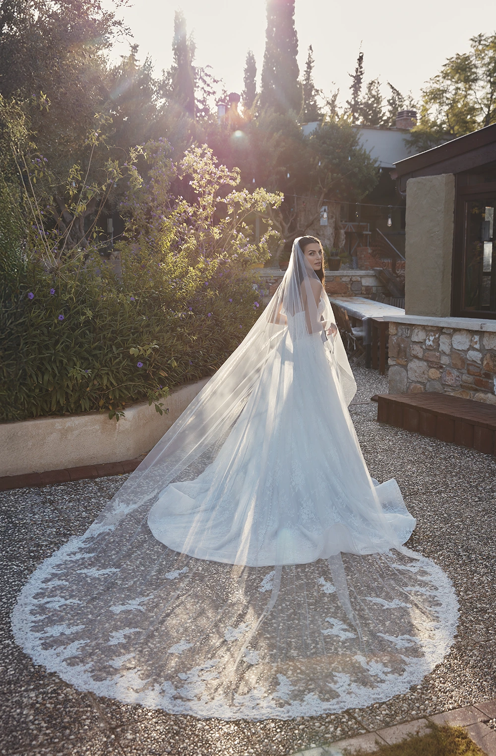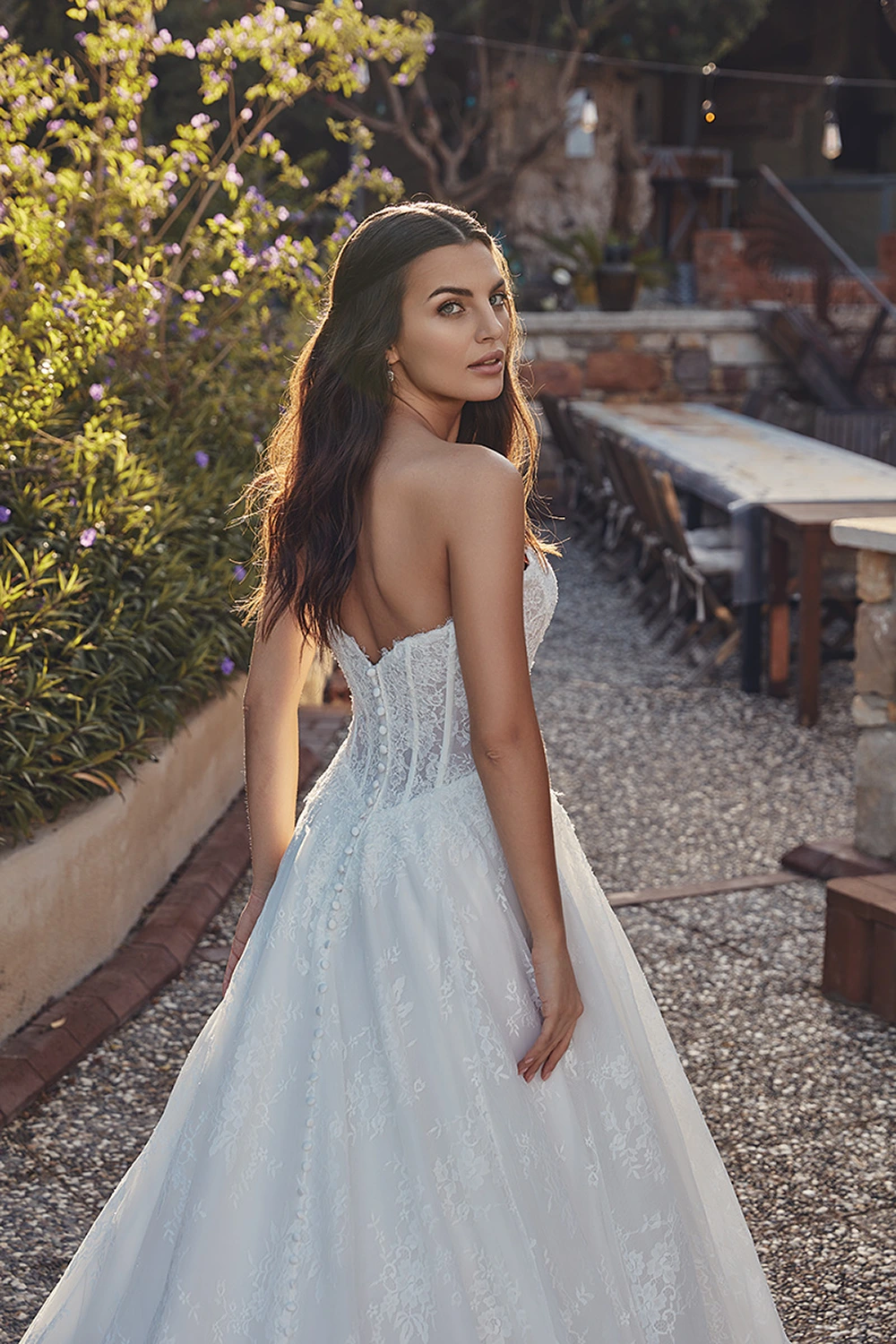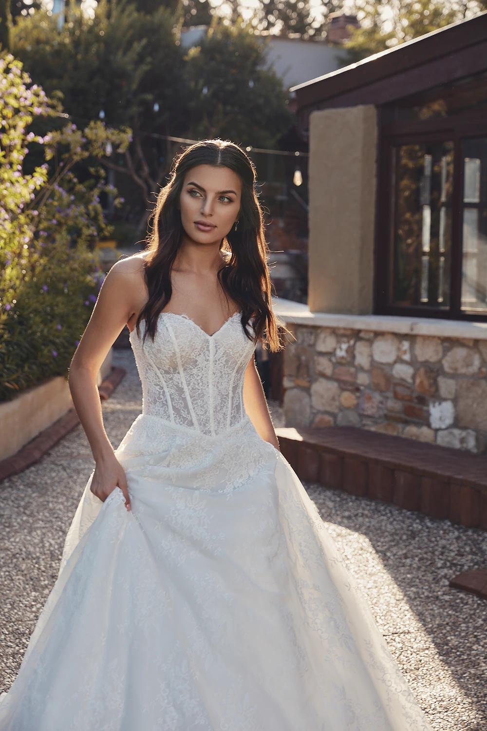 Das Modell Mabel von Eddy K ist ein zartes A-Linien Brautkleid aus Chantilly Spitze und einer Corsage mit einem Herzausschnitt.