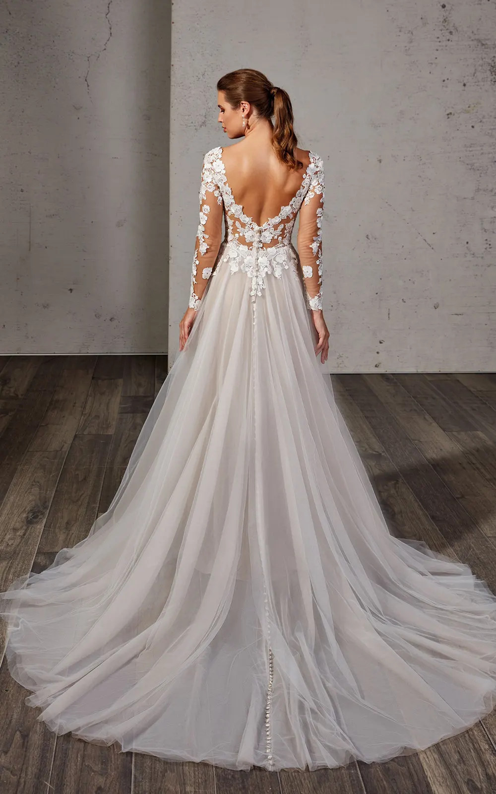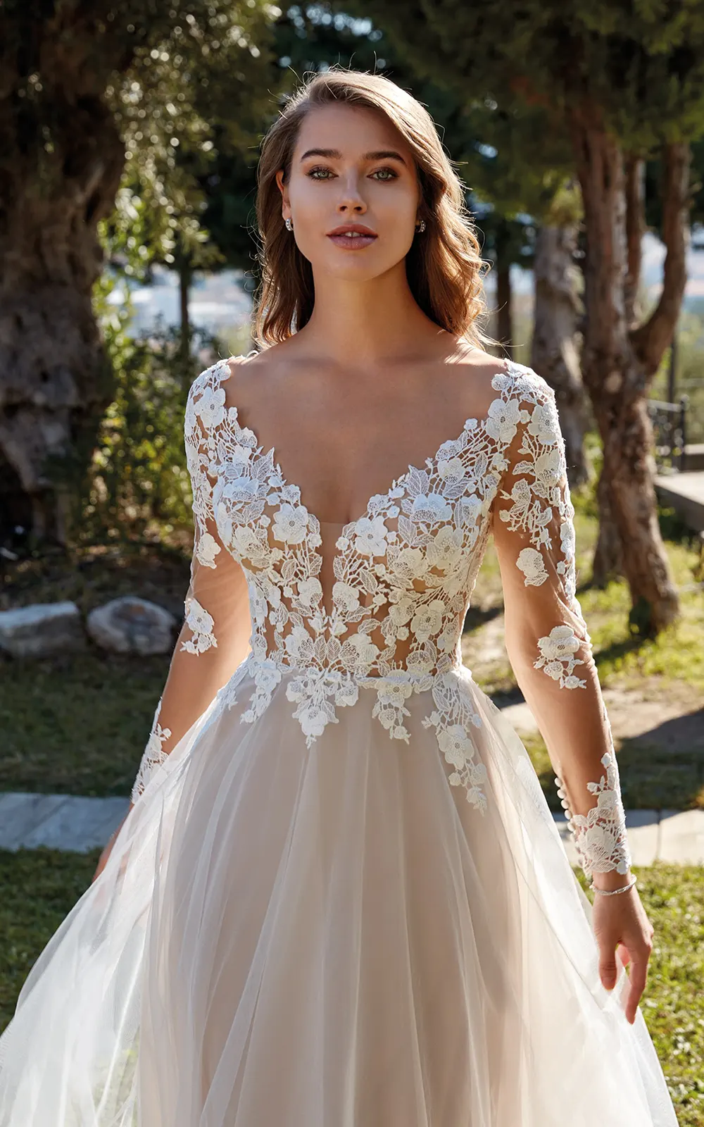 Das Brautkleid Maggie von Eddy K ist ein leichtes, klassisches A-Linien-Brautkleid mit luftigem Rock und langen Armen mit Tattoospitze.