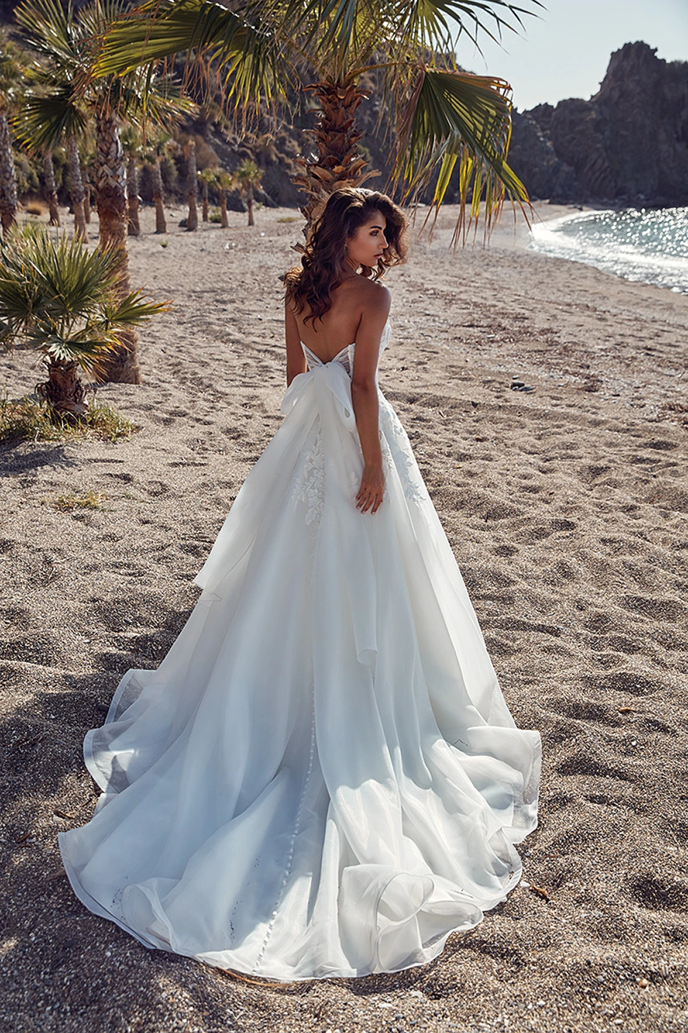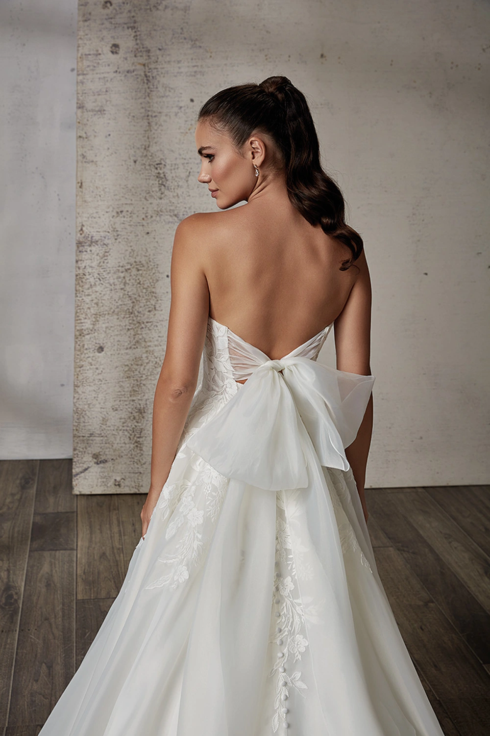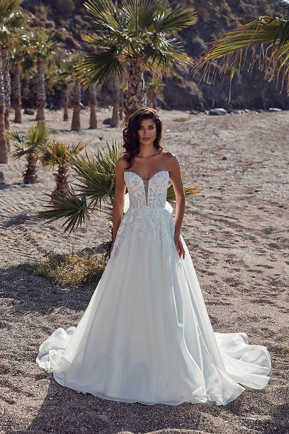 Das Modell Primavera von Eddy K ist ein romantisches A-Linien Kleid mit einer Corsage aus floraler Spitze und einem ausgestelltem Rock aus Organza.