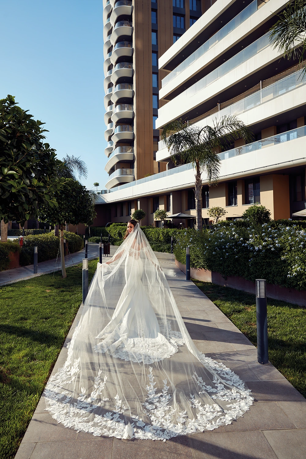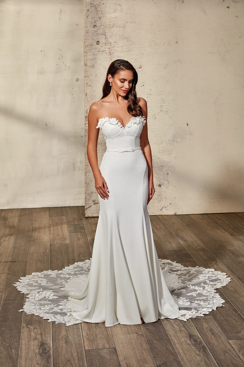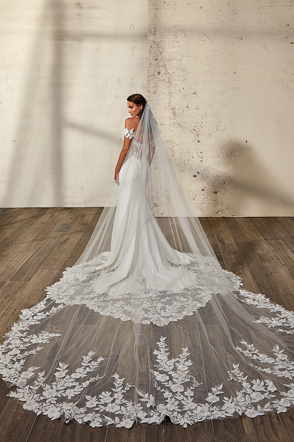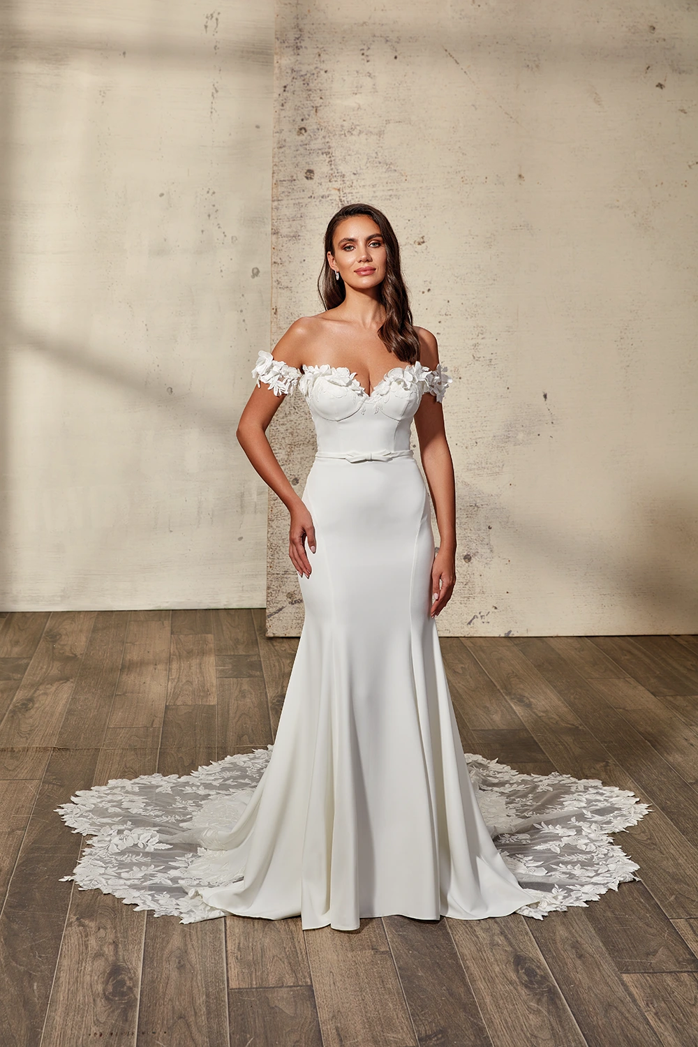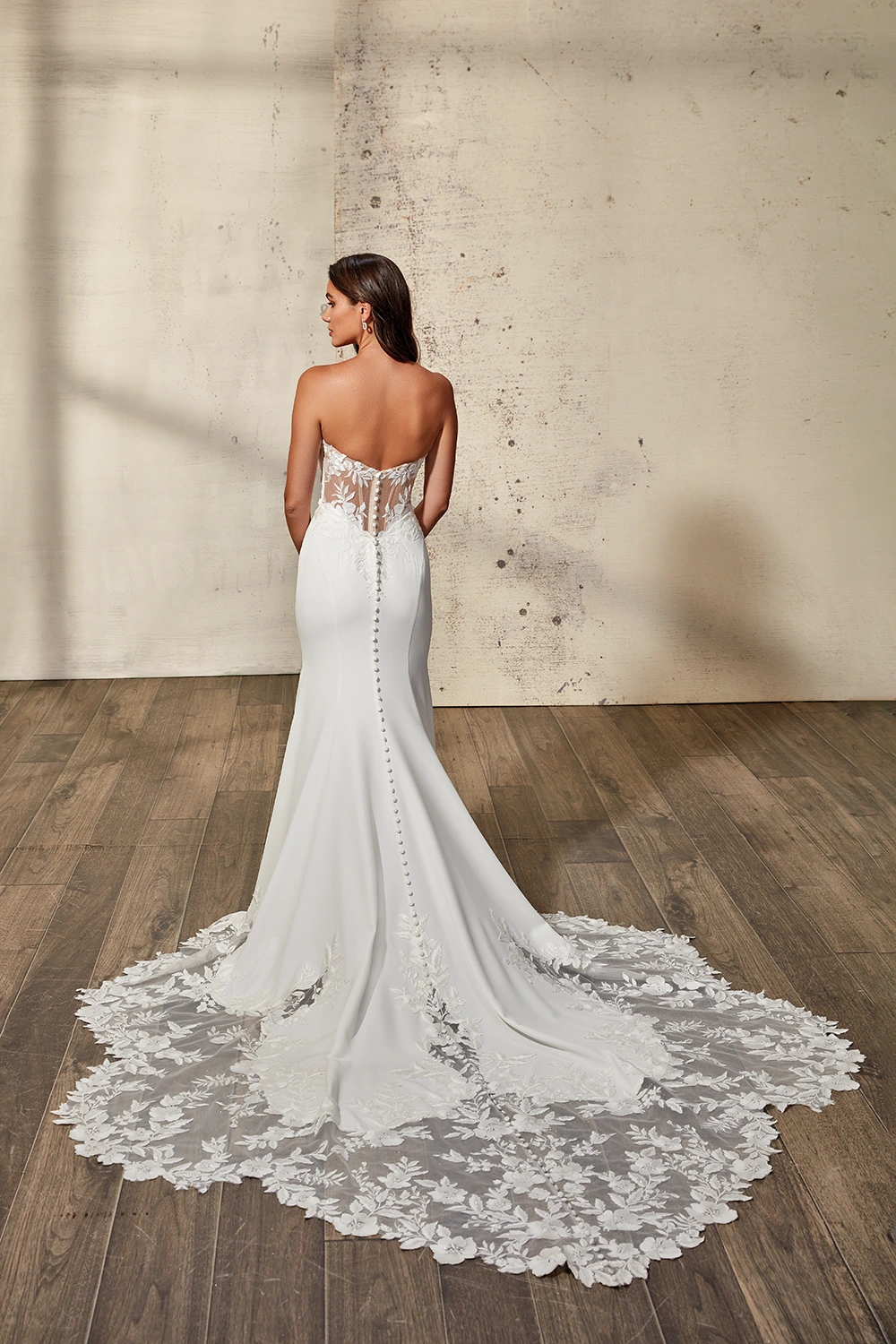 Das Modell Promise von Eddy K ist ein cleanes Fit und Flare Brautkleid mit aufregenden Highlights aus Spitze und 3D Applikationen.