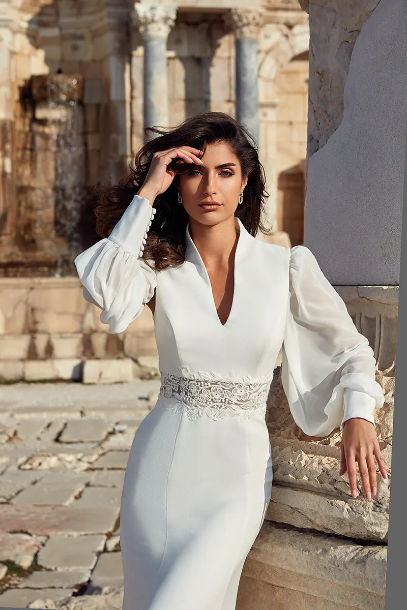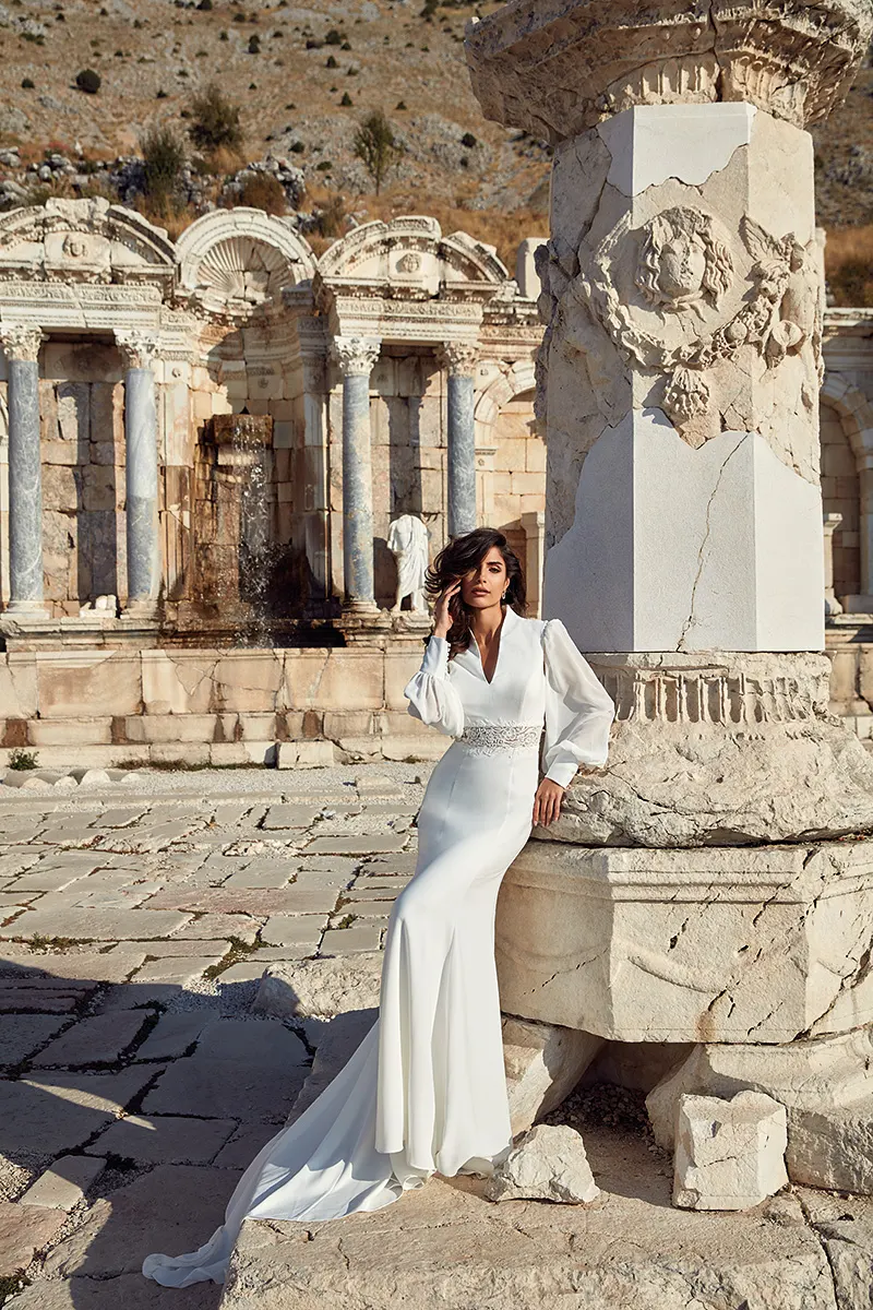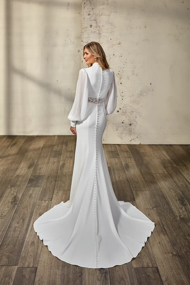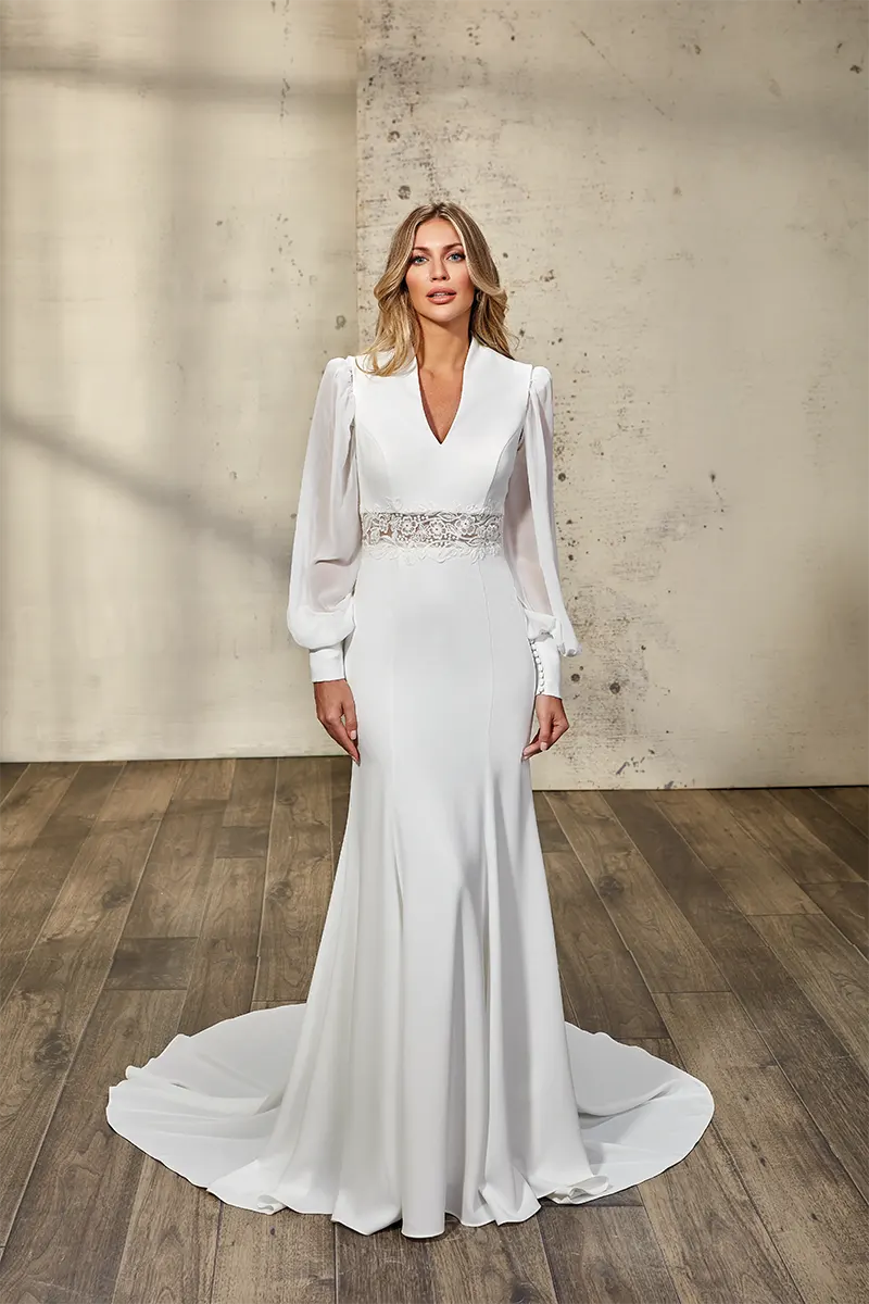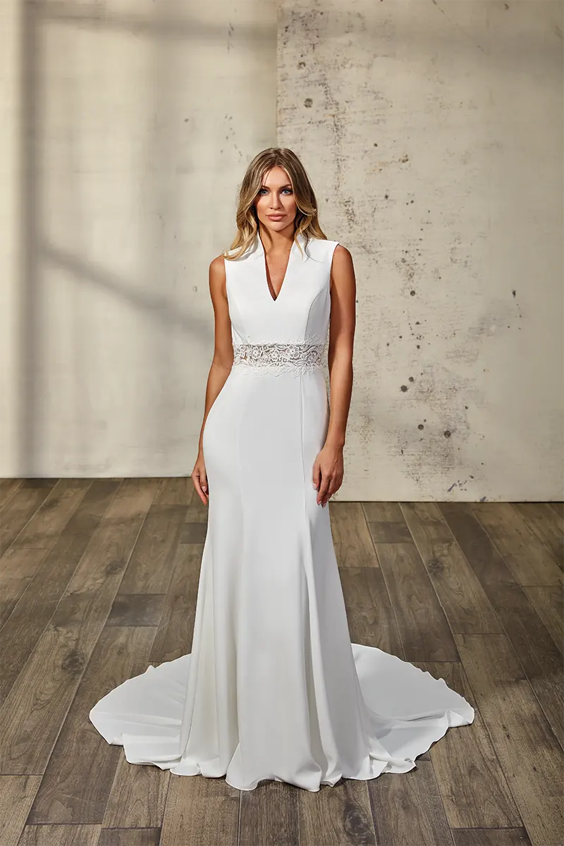 Das Brautkleid Rumi von Eddy K ist ein modernes Fit-n-Flare / Meerjungfrauen Brautkleid aus elfenbeinfarbenem Crêpe mit V-Ausschnitt.