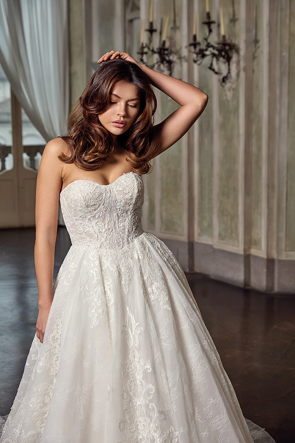 Das Modell Toulouse von Eddy K ist ein Prinzessinnen Brautkleid mit Spitzenapplikationen und leichtem Glitzer.