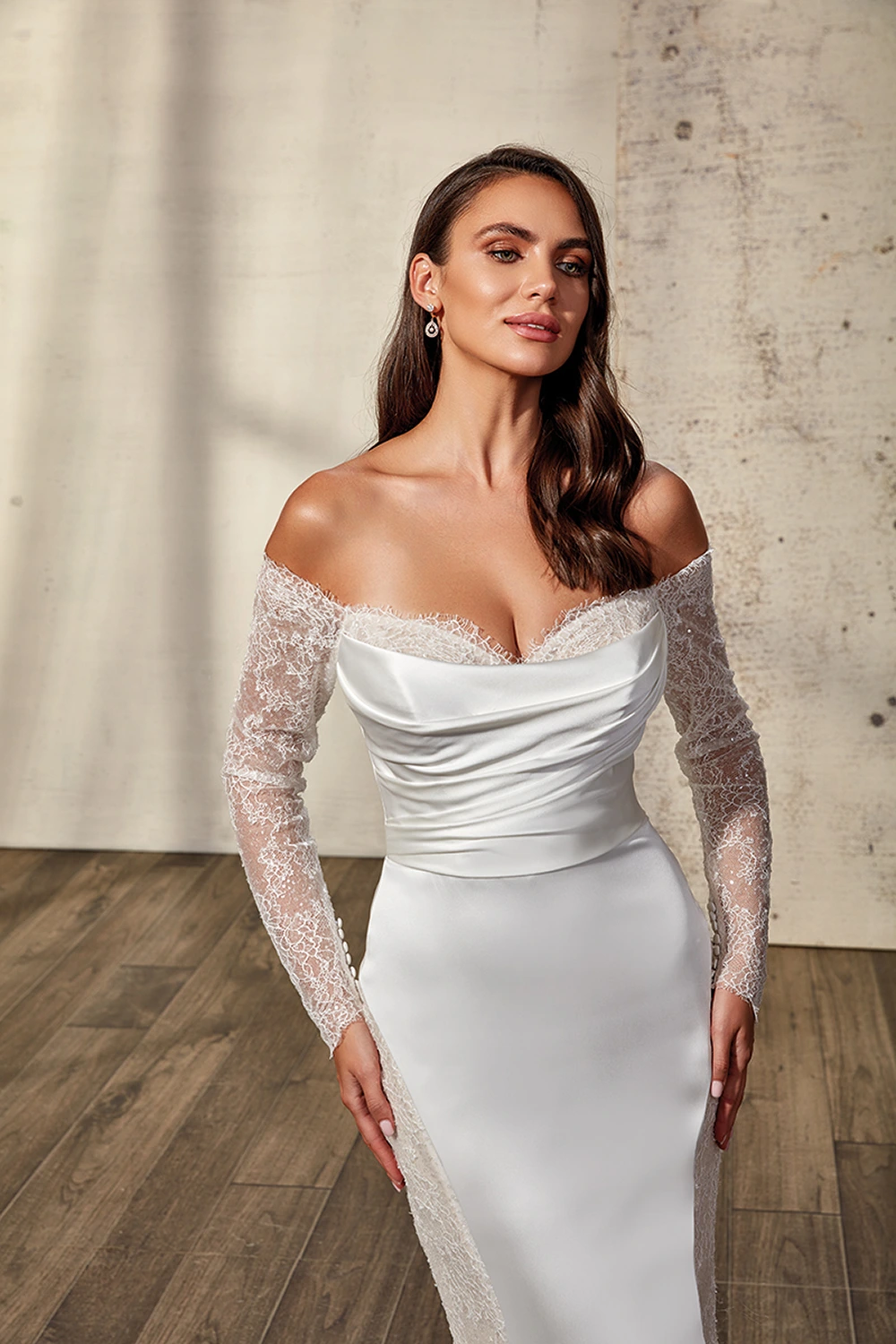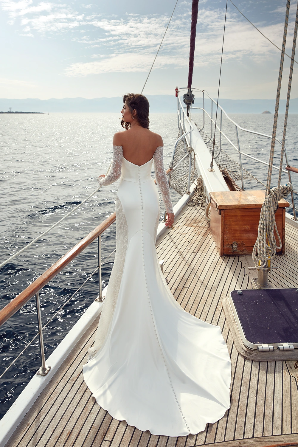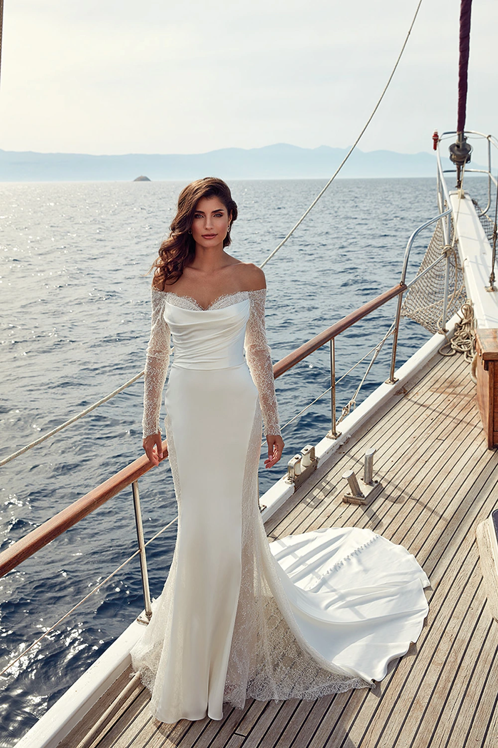 Das Modell Zinnia von Eddy K ist ein aufregendes Fit und Flare Brautkleid mit Spitzendetails.