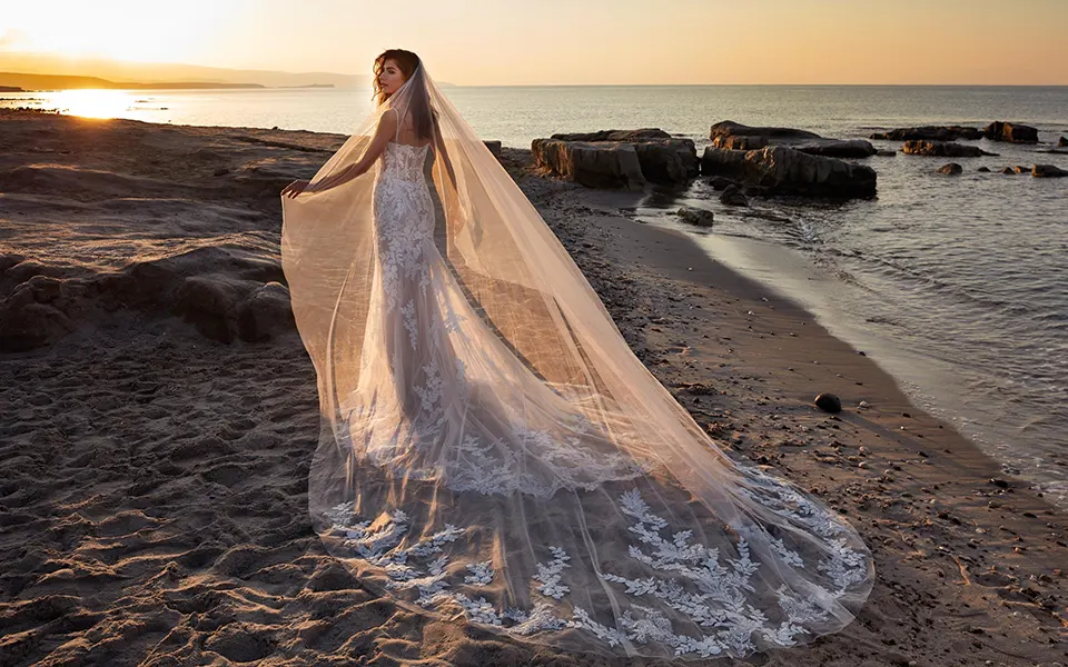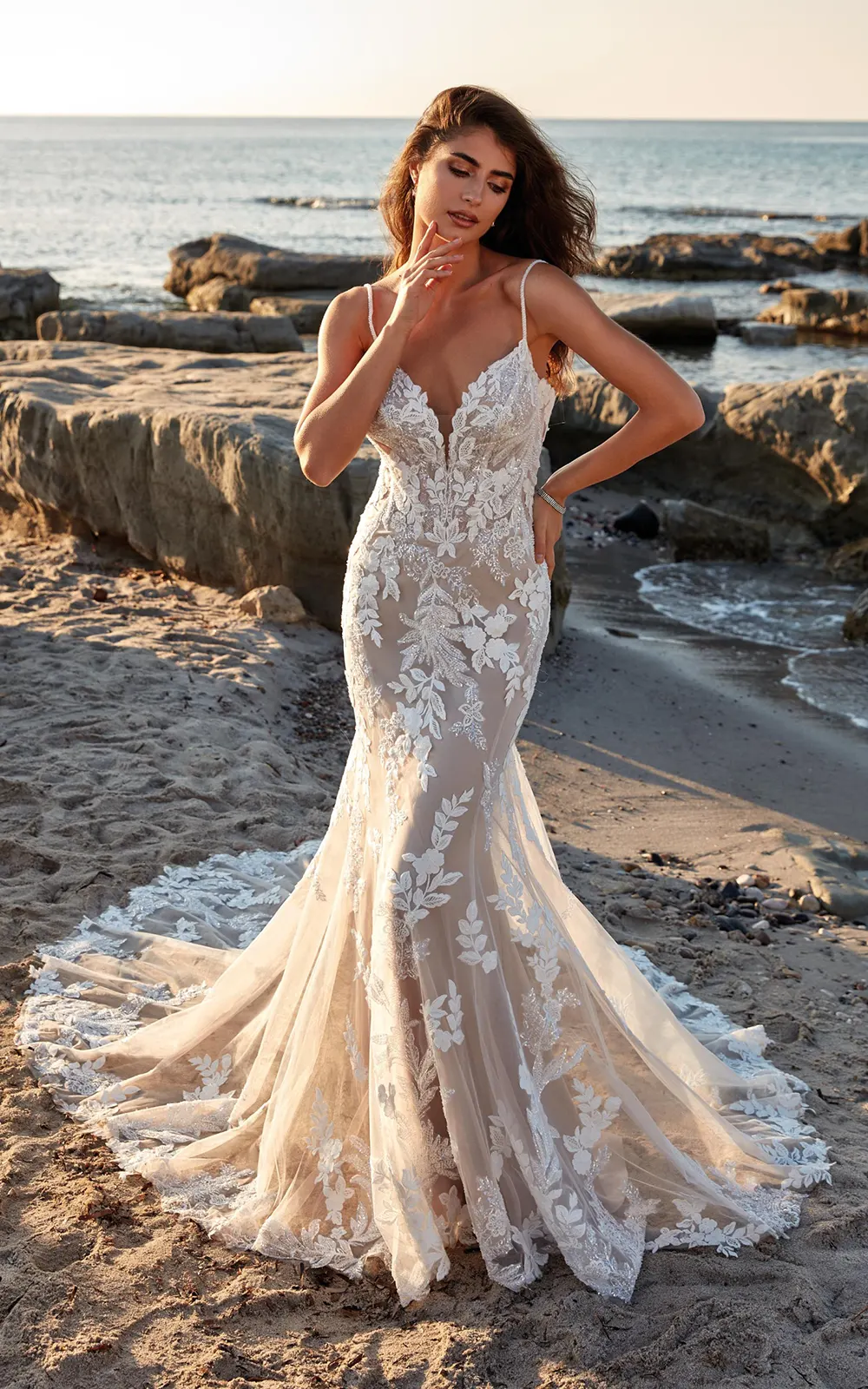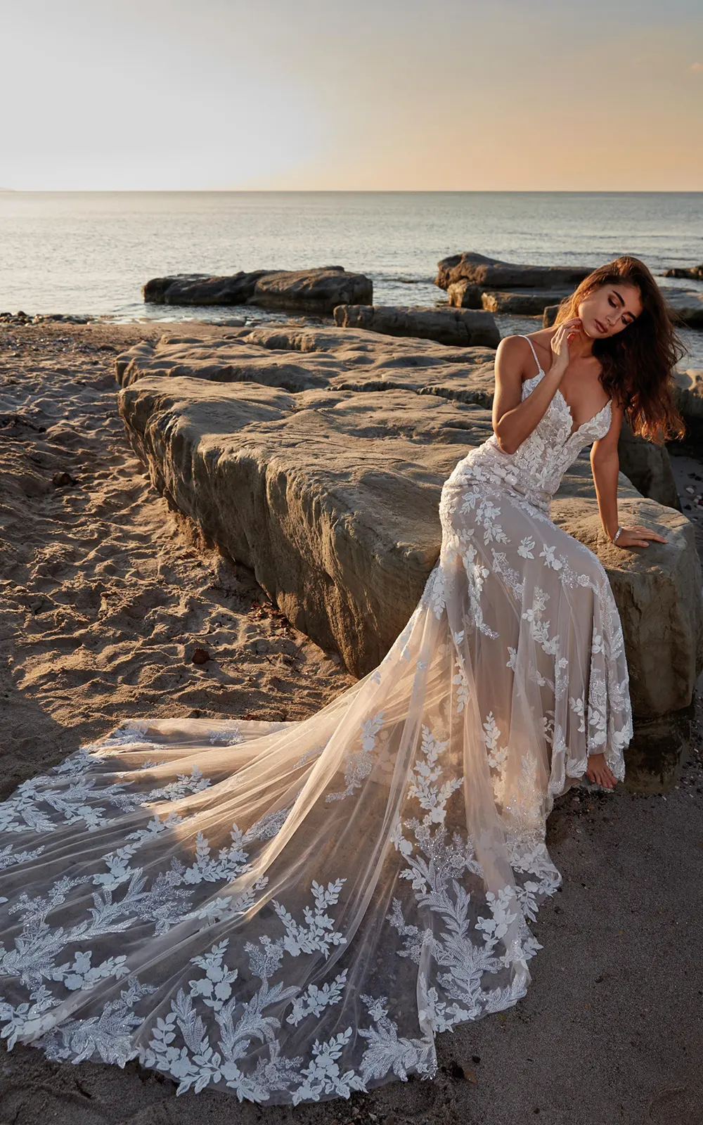 Das Brautkleid Joanna von Eddy K ist ein traumhaftes Meerjungfrauen-Brautkleid mit perlenbesetzter Blütenspitze, welche sich besonders schön vom getönten Unterrock abhebt.