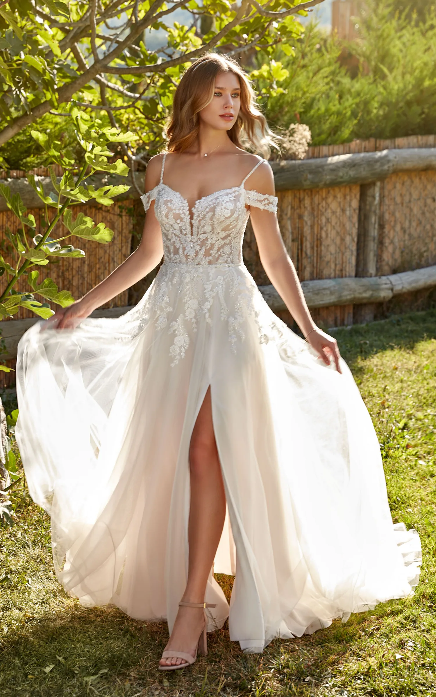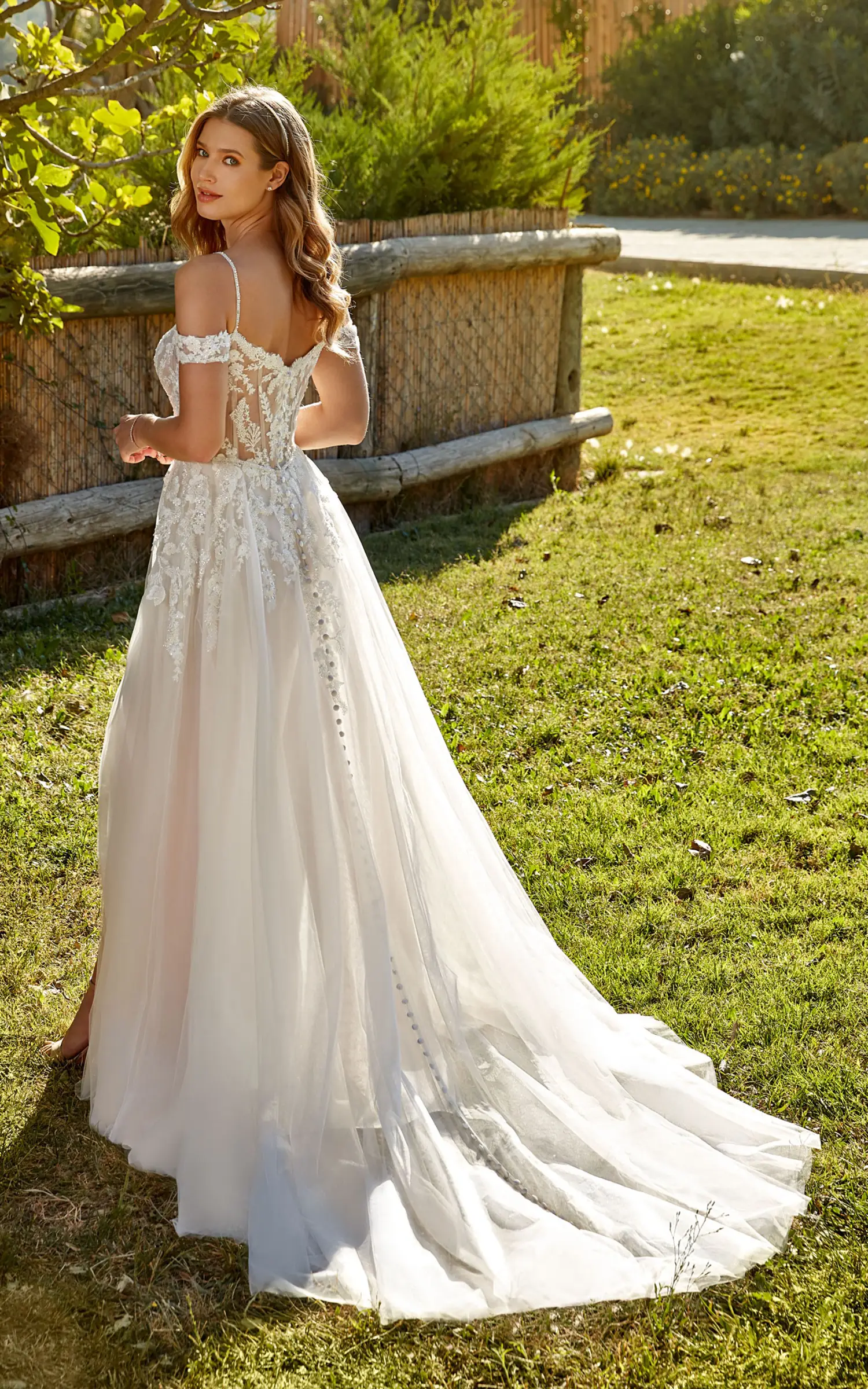 Natalie von Eddy K ist ein Brautkleid im perfekten Mix aus klassisch, modern und boho. Vom transparenten Oberteil mit sichtbaren Stäbchen rankt sich florale Spitze bis in die obere Rockpartie. Perlen zieren die Spitze, Spaghettiträger sowie das Taillenband. Zusätzlich lässt sich die Schulterpartie durch abnehmbare, seitliche Träger betonen. Der leicht ausgestellte, mit Satin gefütterte Tüllrock ist an der Vorderseite geschlitzt. Eine lange Knopfleiste reicht bis zum Schleppensaum.