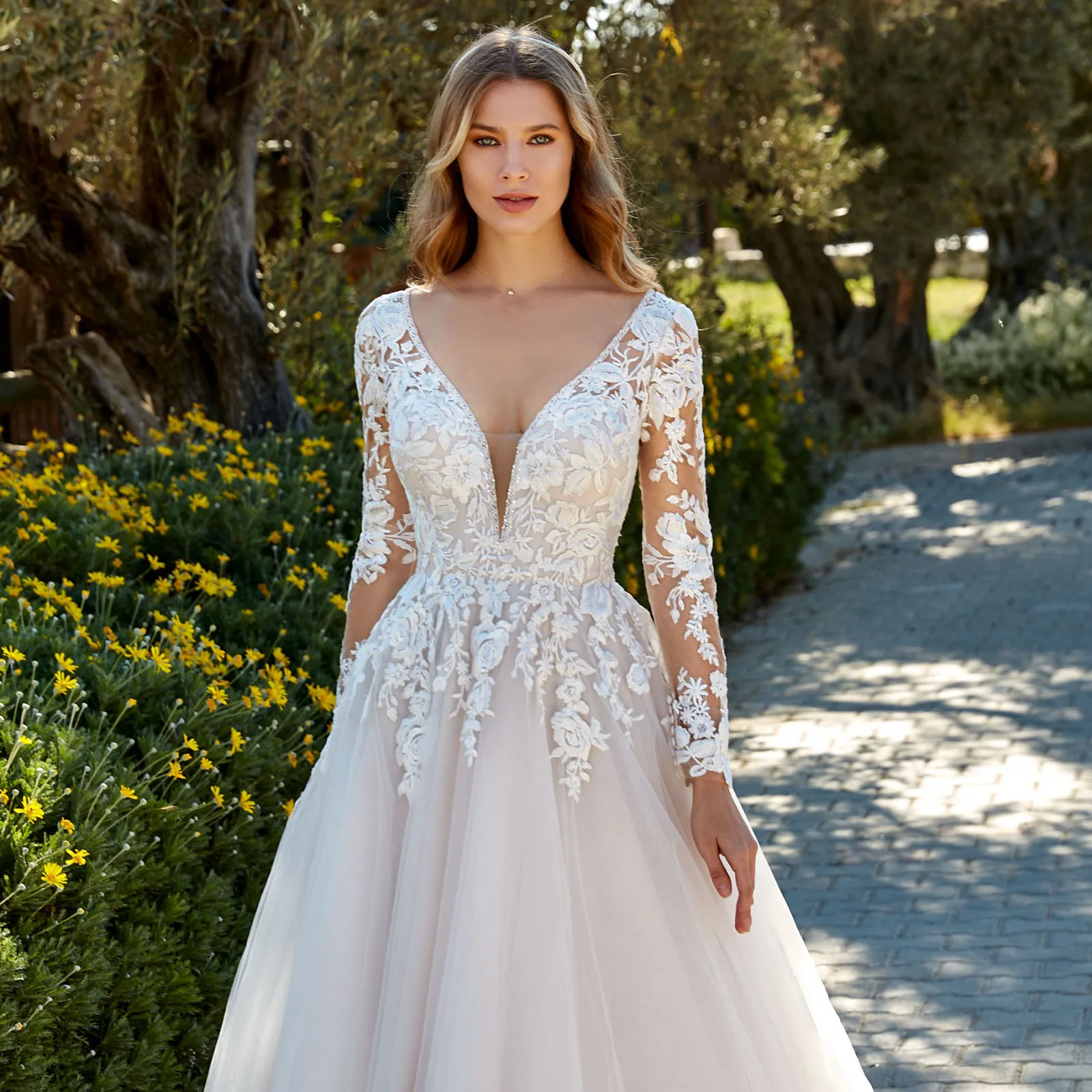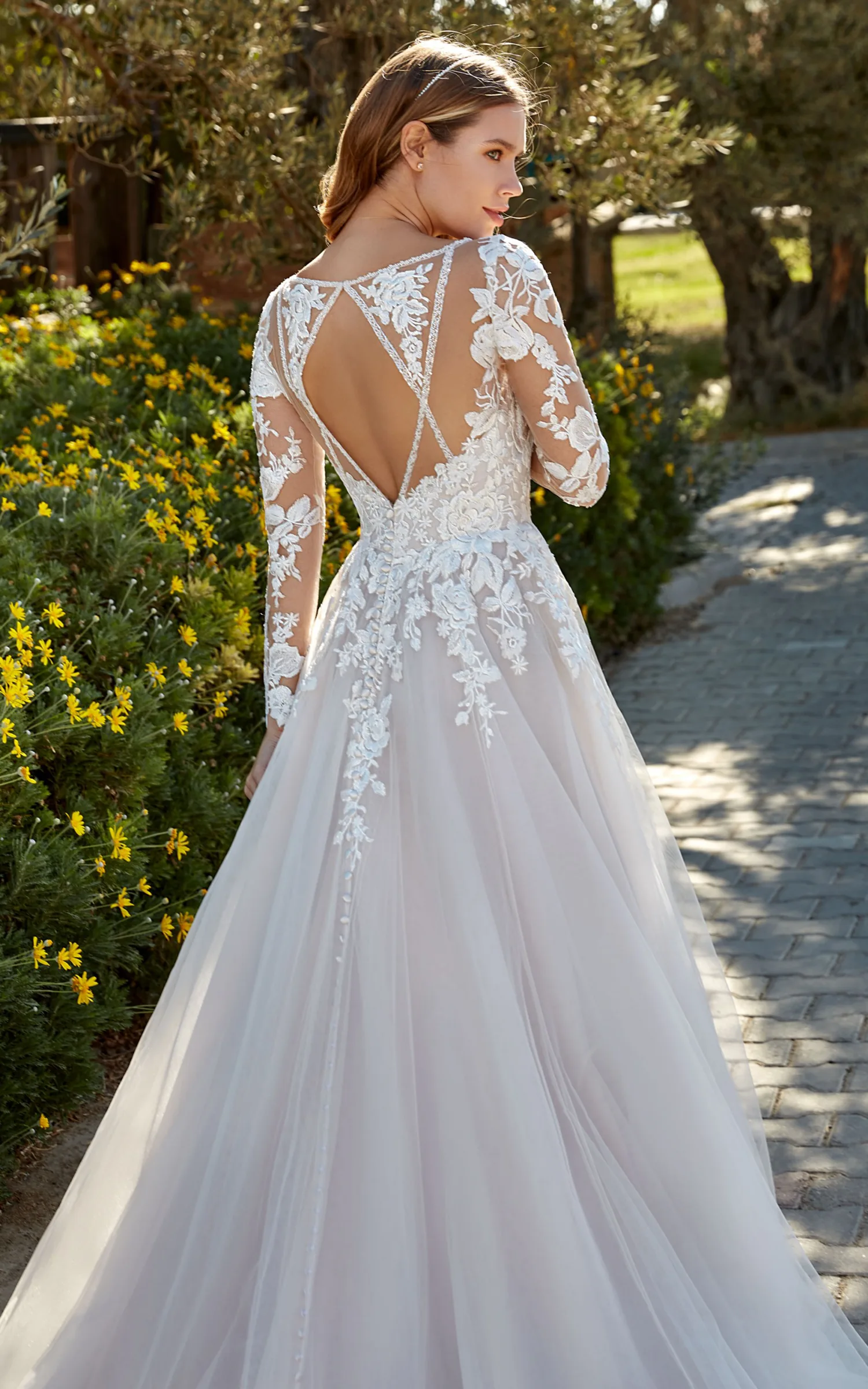 Das klassische Brautkleid Samantha von Eddy K besitzt eine außergewöhnlich gestaltete Rückenpartie. Dafür sorgt ein durch Perlenbänder und transparente Spitze grafisch gerahmter Rückenausschnitt. Das präsente florale Spitzenmuster formt zudem die langen Ärmel und fließt in den weit schwingenden Rock. Dessen Lagen aus Tüll sind zusätzlich mit lavendelfarbenem Satin gefüttert. Die glamouröse Faltenlegung des Rocks geht an der Rückseite über in eine glatte Schleppe, begleitet von einer langen Knopfleiste.
