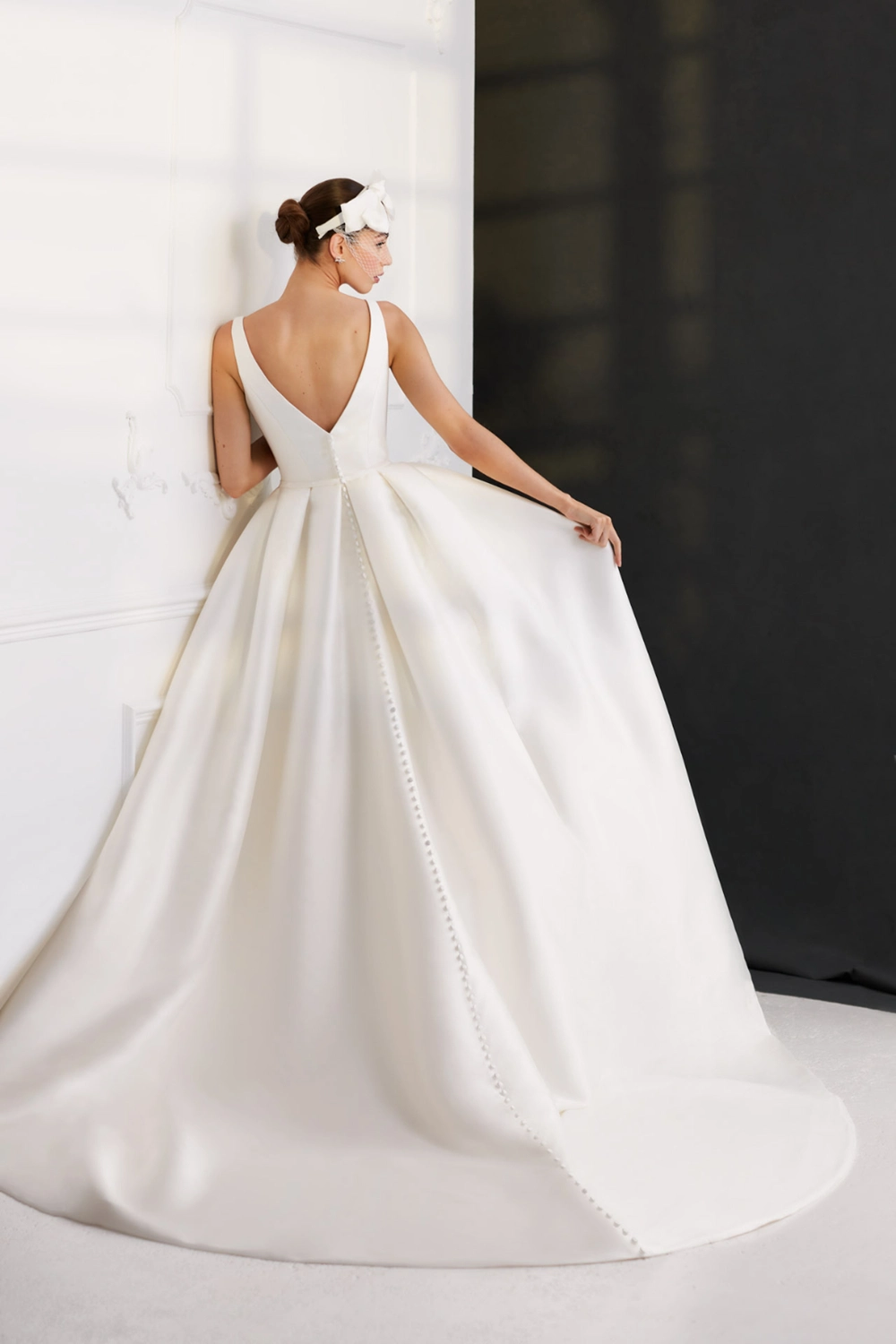Das Brautkleid Effie von Ellis Bridals präsentiert sich in glamouröser Silhouette und minimalistischem Stil. Das gesamte Modell ist aus leicht glänzendem Mikado gefertigt. Ein schmales Taillenband mit grafischer Schleife im Stil der 60er trennt das Top optisch dezent vom voluminösen Rock. In den weiten Kellerfalten sind seitlich praktische Taschen eingearbeitet. Eine lange Knopfleiste reicht vom Rückenausschnitt bis zum Schleppensaum.