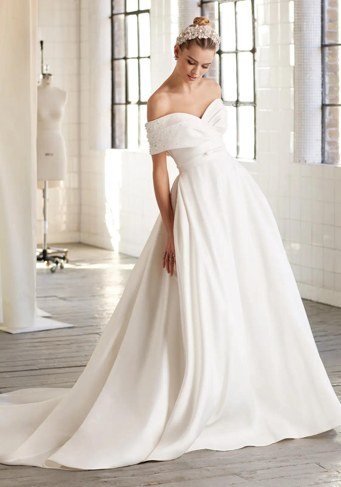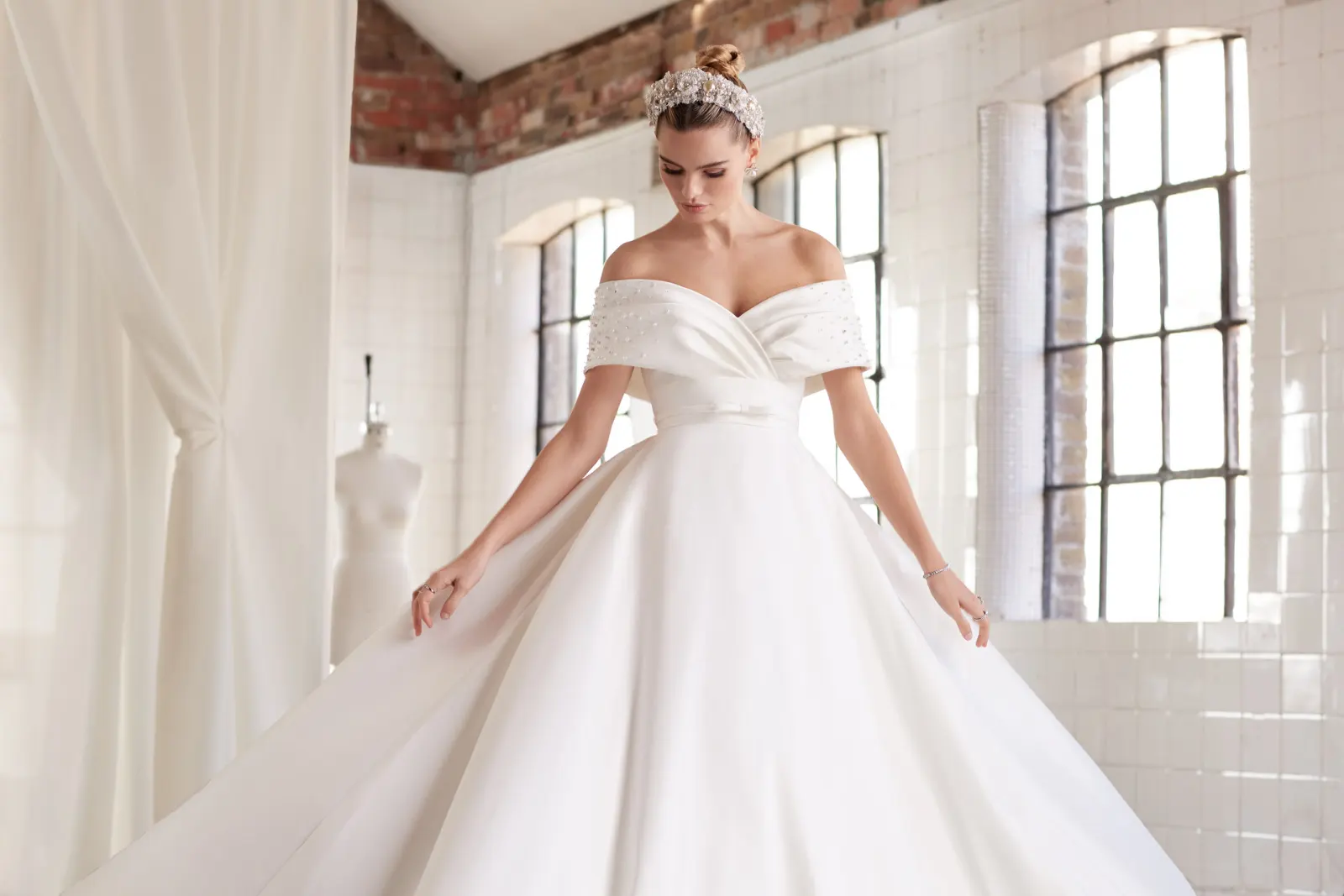 Das Brautkleid Josefina von Ellis Bridals ist ein königleiches, elegantes Prinzessinnen-Brautkleid aus luxuriösem Mikado, dass dir den Glamour-Faktor garantiert.