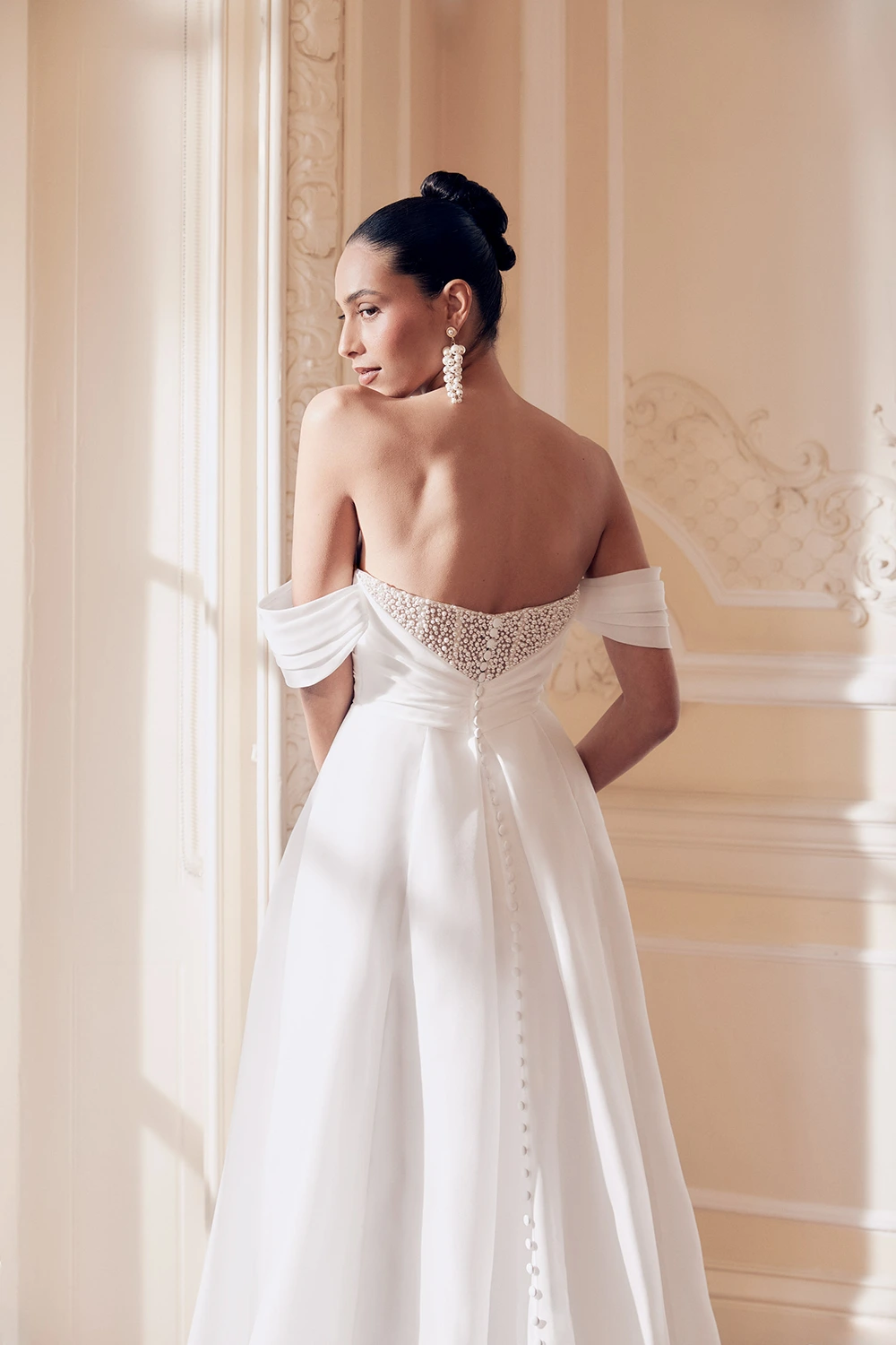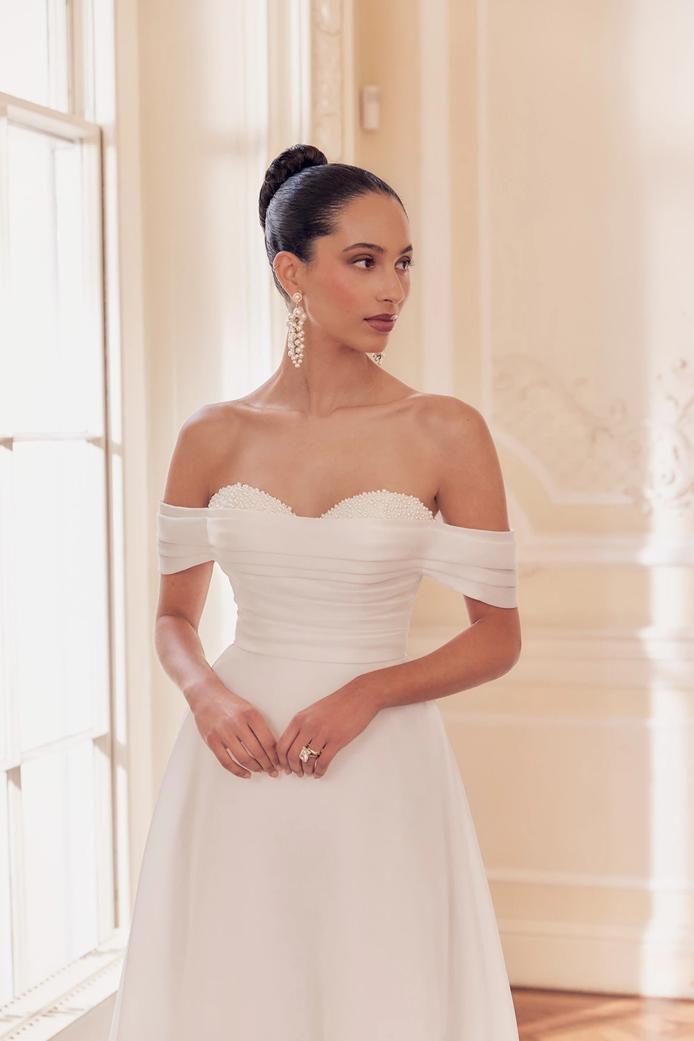 Das Modell Leona von Ellis Bridals ist ein leicht und luftiges Brautkleid mit Perlendetails im Ausschnitt und zarten Carmenträger. Der zarte Organzarock fließt leicht in eine lange Schleppe über.