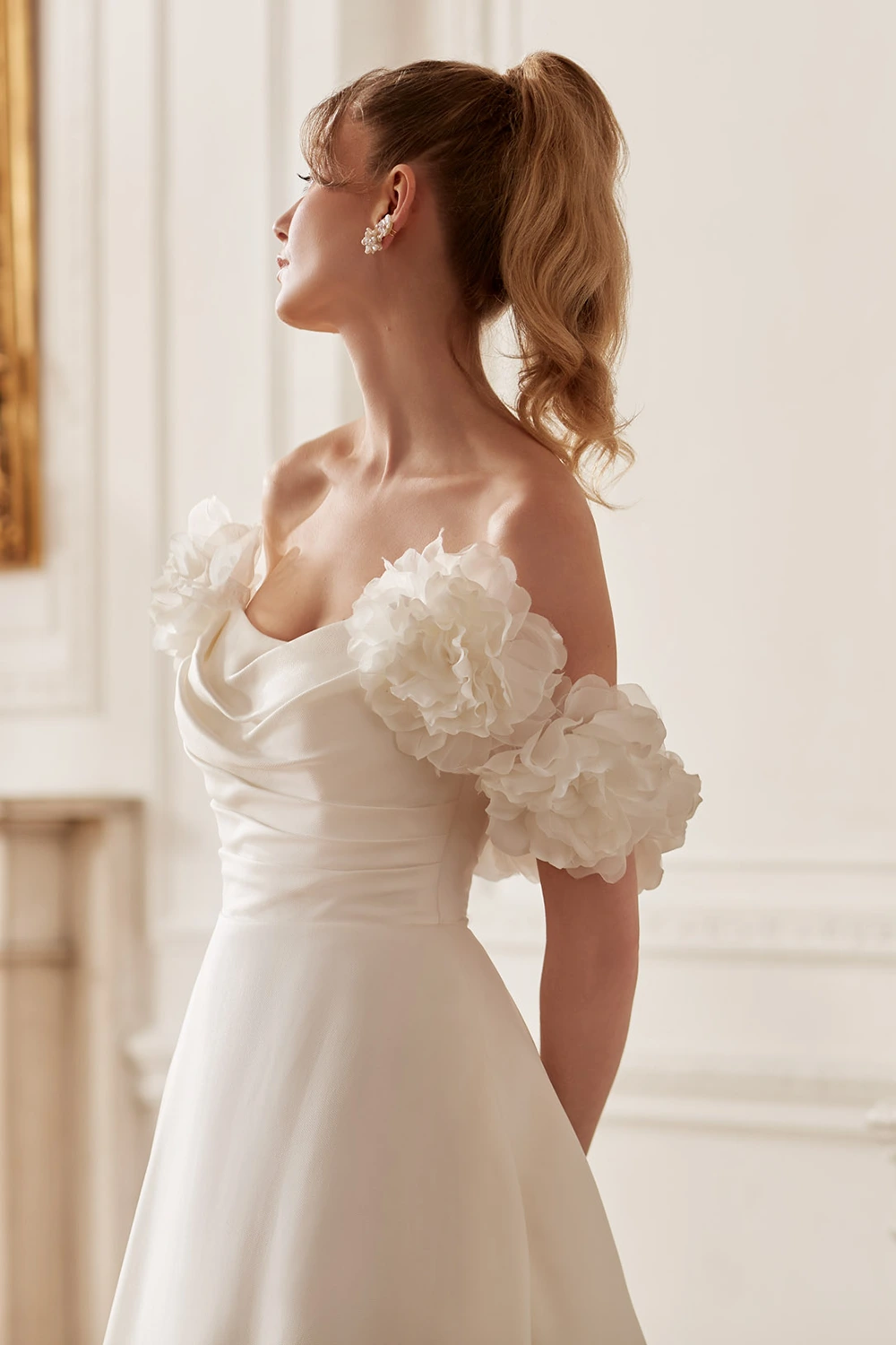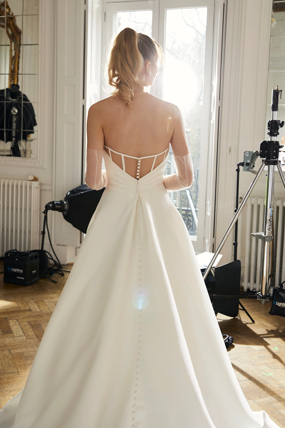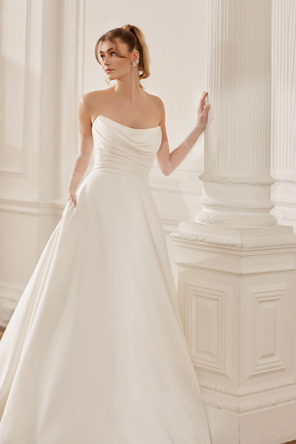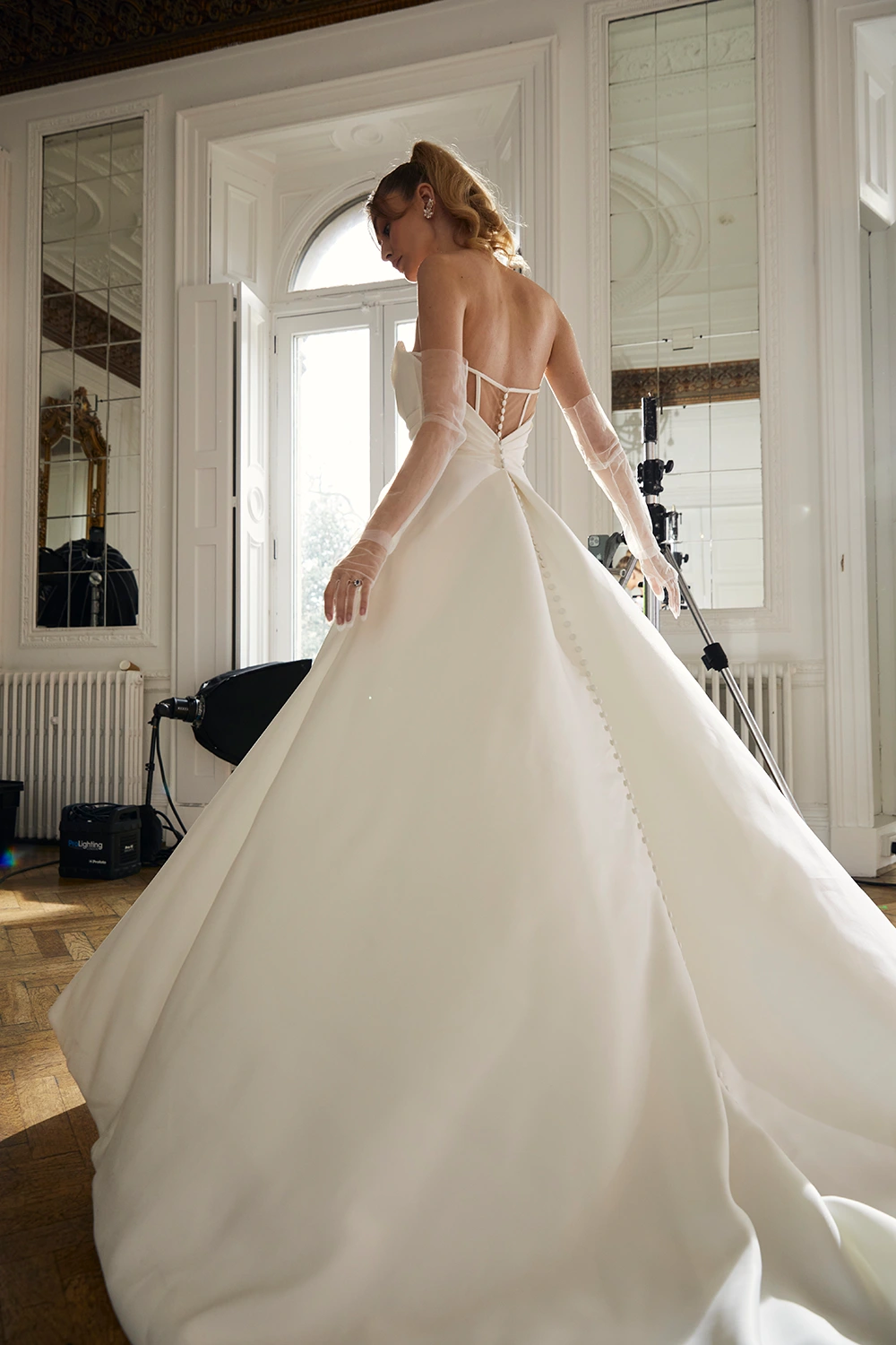 Das Modell Mia von Ellis Bridals ist ein romantisches Prinzessinnenbrautkleid, aus strukturiertem Mikado gefertigt und verfügt über ein drapiertes Mieder mit einem weichen U-Ausschnitt.