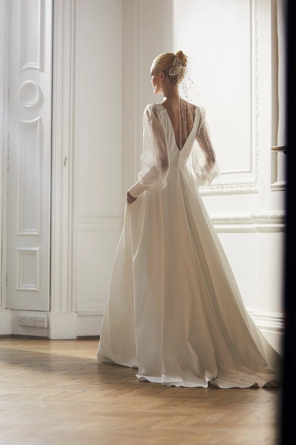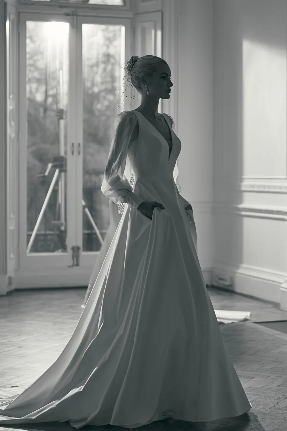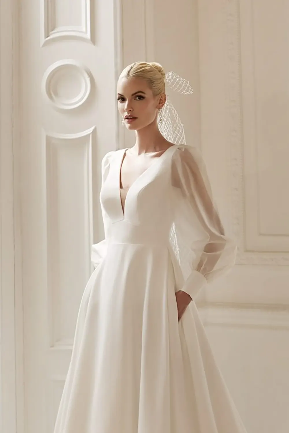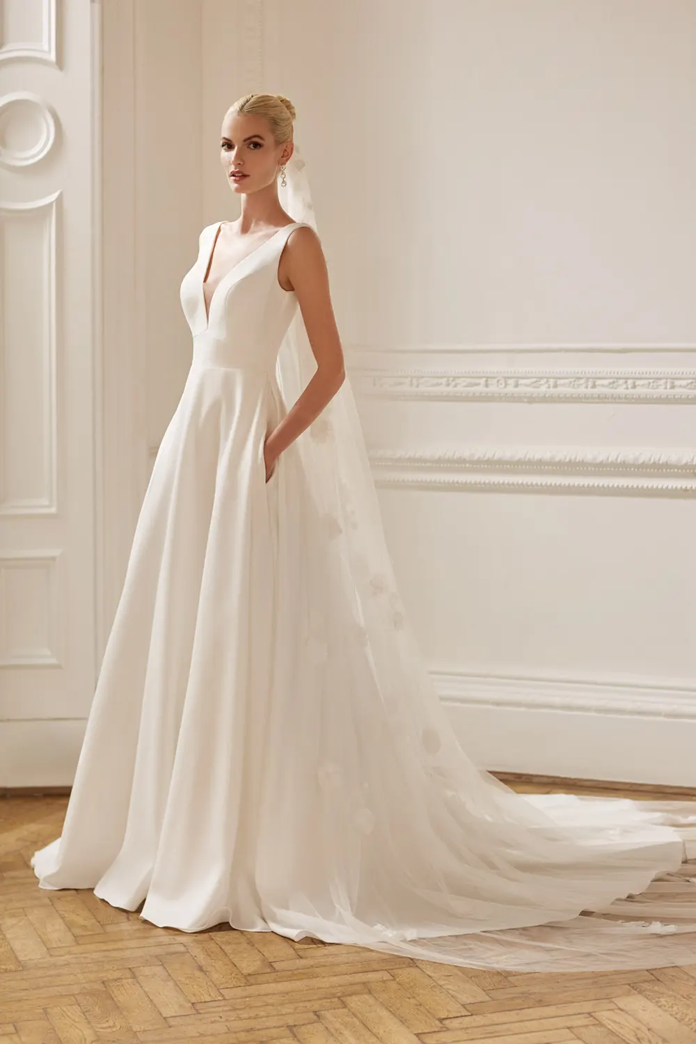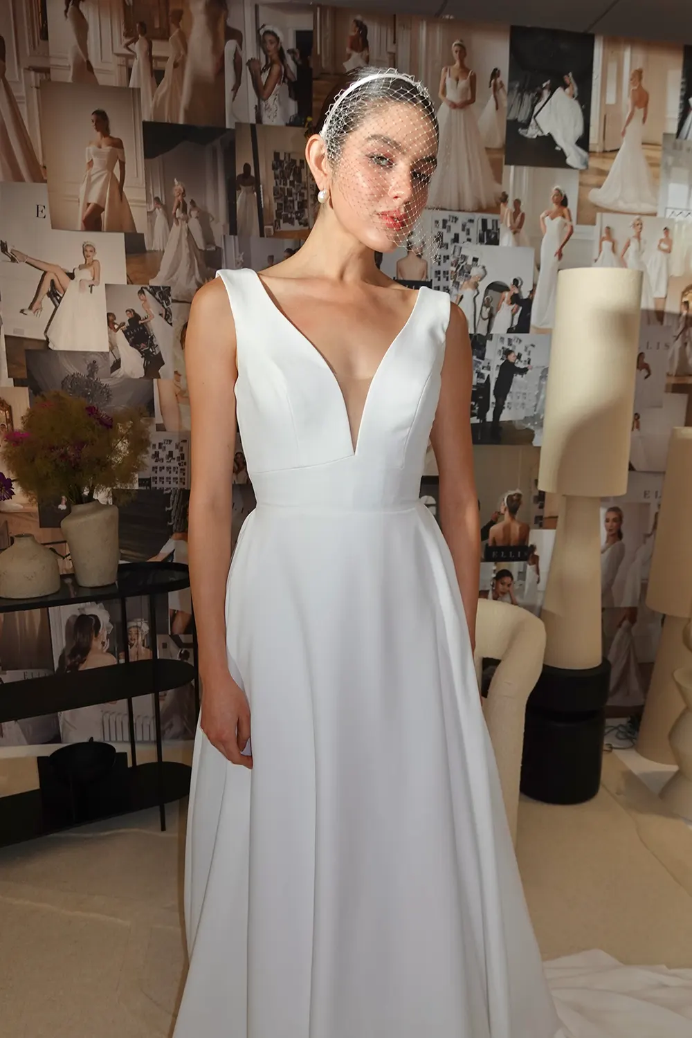 Das Modell Tegan von Ellis Bridals ist ein zeitloses A-Linien Brautkleid, mit einem tiefen V-Ausschnitt und einer betonten Taille. Das Brautkleid ist modern und minimalistisch.